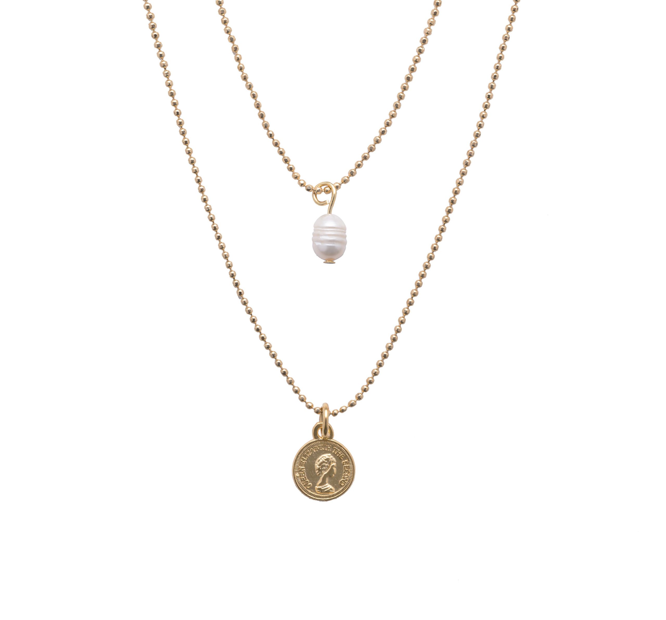 שרשרת שכבות אופנתית עם שני תליונים – הקצר עם פנינה אמיתית והארוך עם מטבע בסגנון עתיק.
