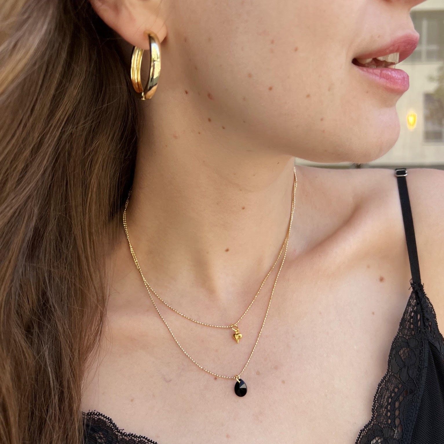 שרשרת כפולה עדינה ומעלפת עם תליון לב קטן ותליון קריסטל שחור