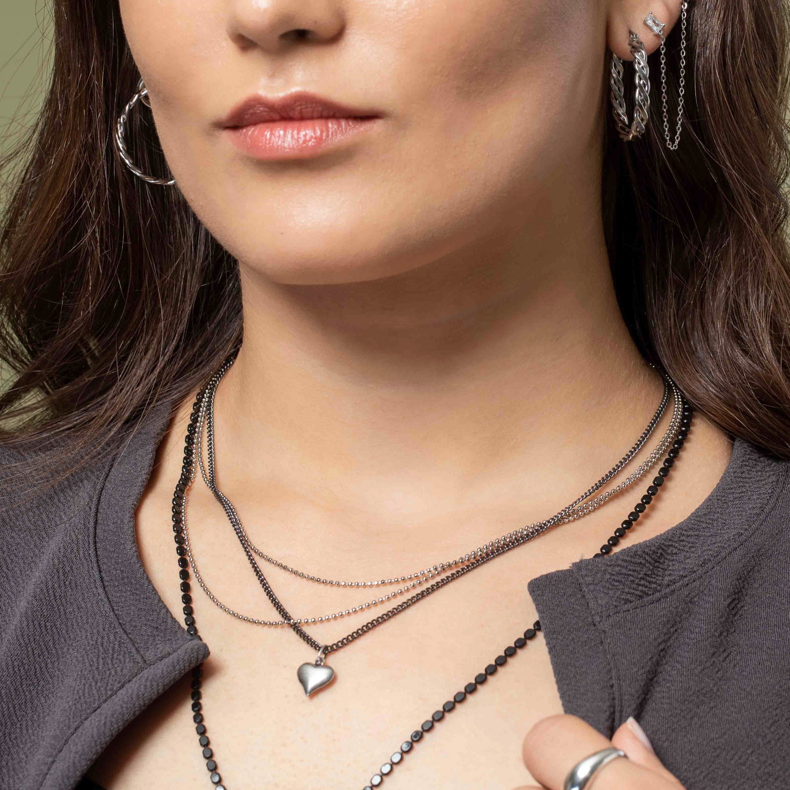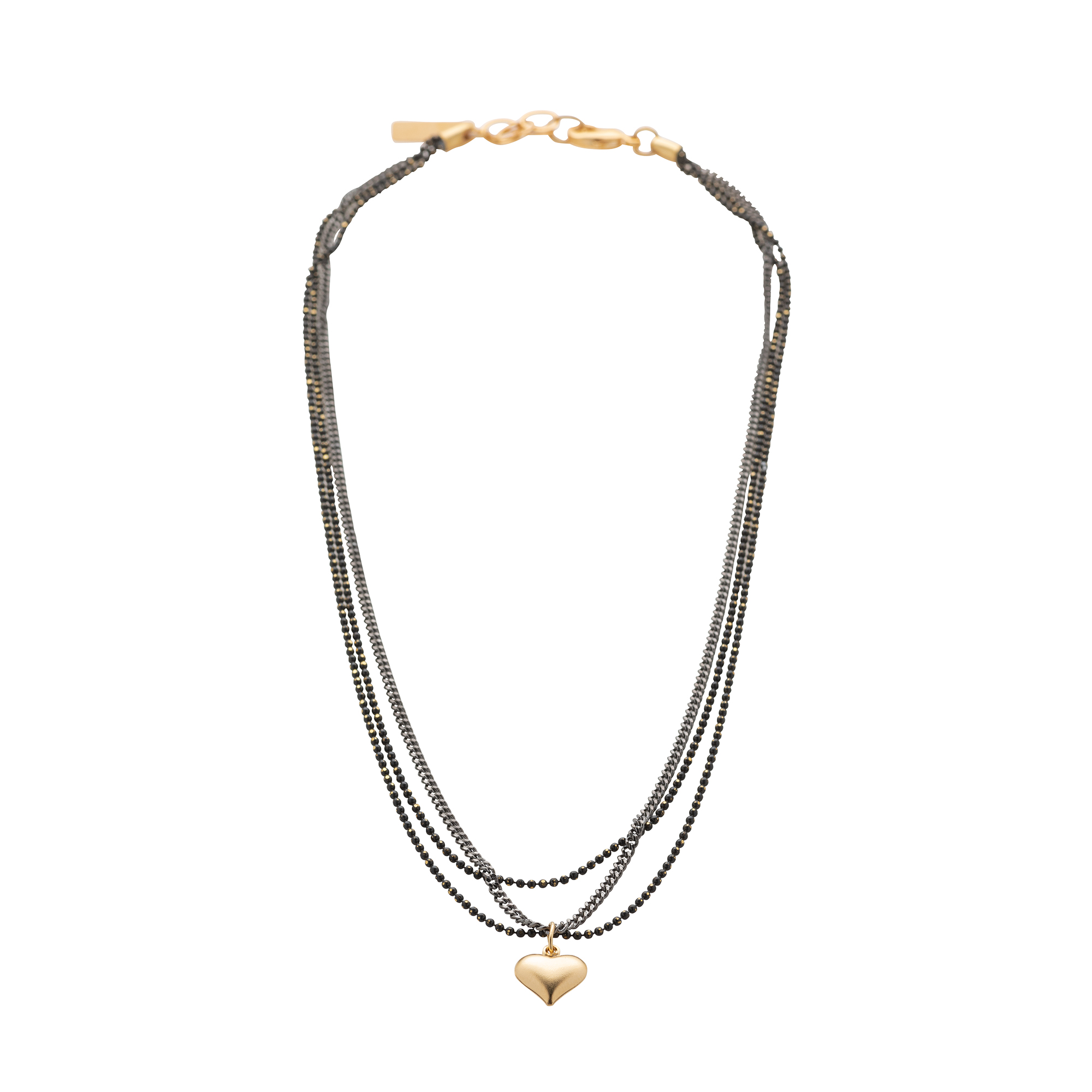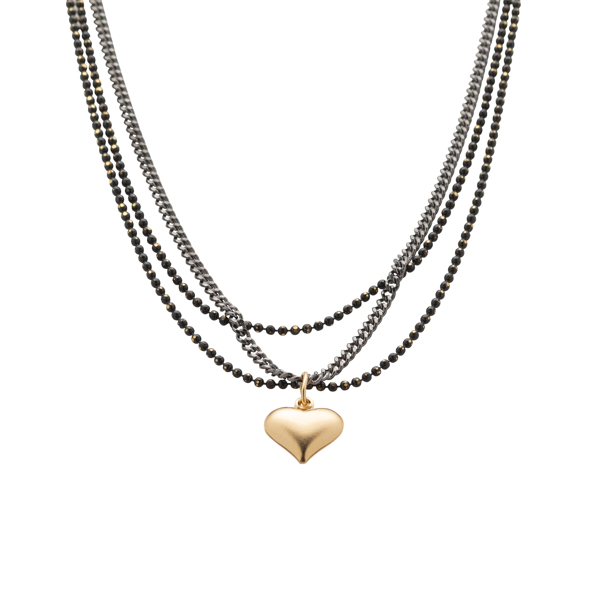 השרשרת עשויה שלוש שרשראות עדינות, שתי שרשראות דיסקית עדינות ושרשרת גורמט עדינה משולבות עם תליון לב מקסים בציפוי זהב 24 קראט או בציפוי כסוף.