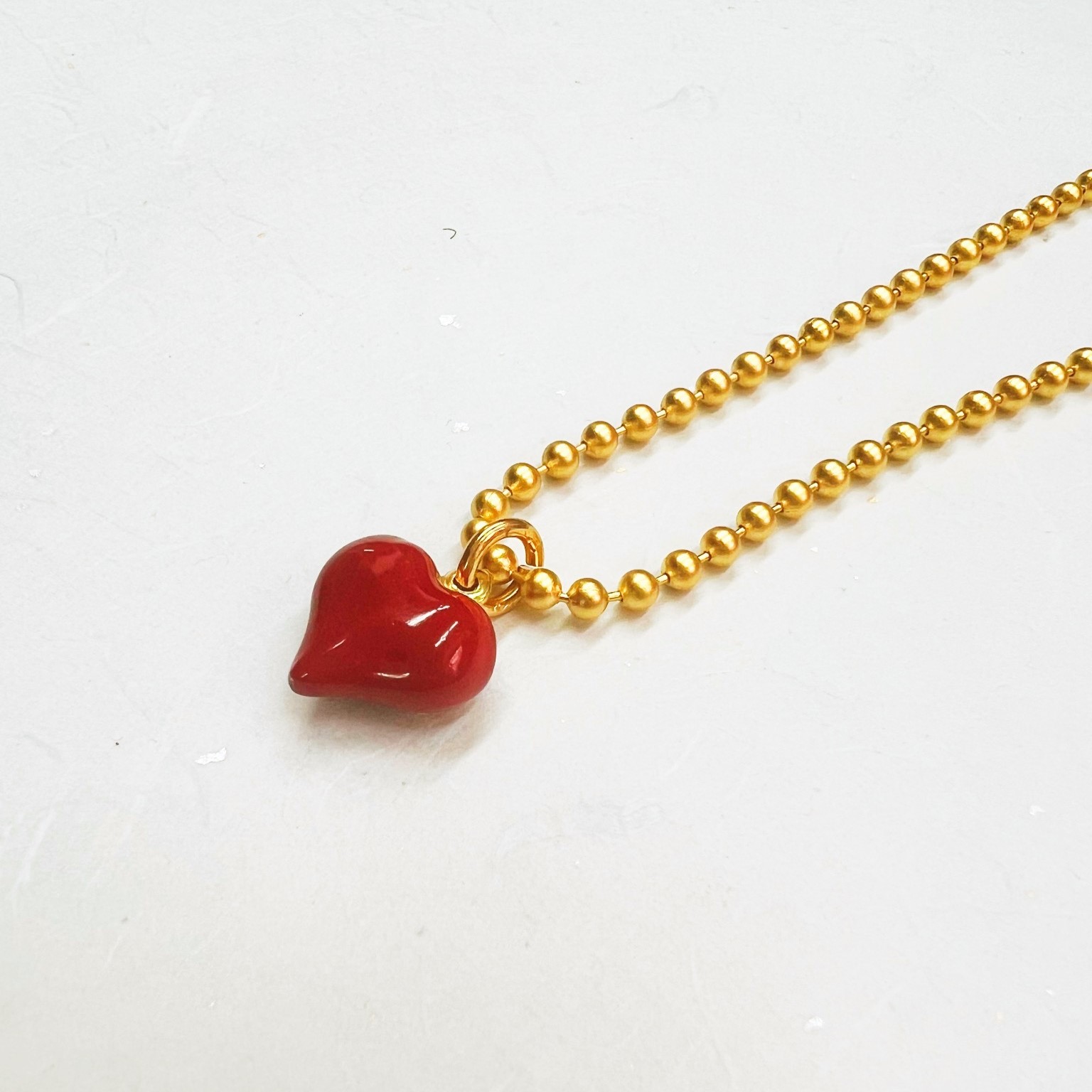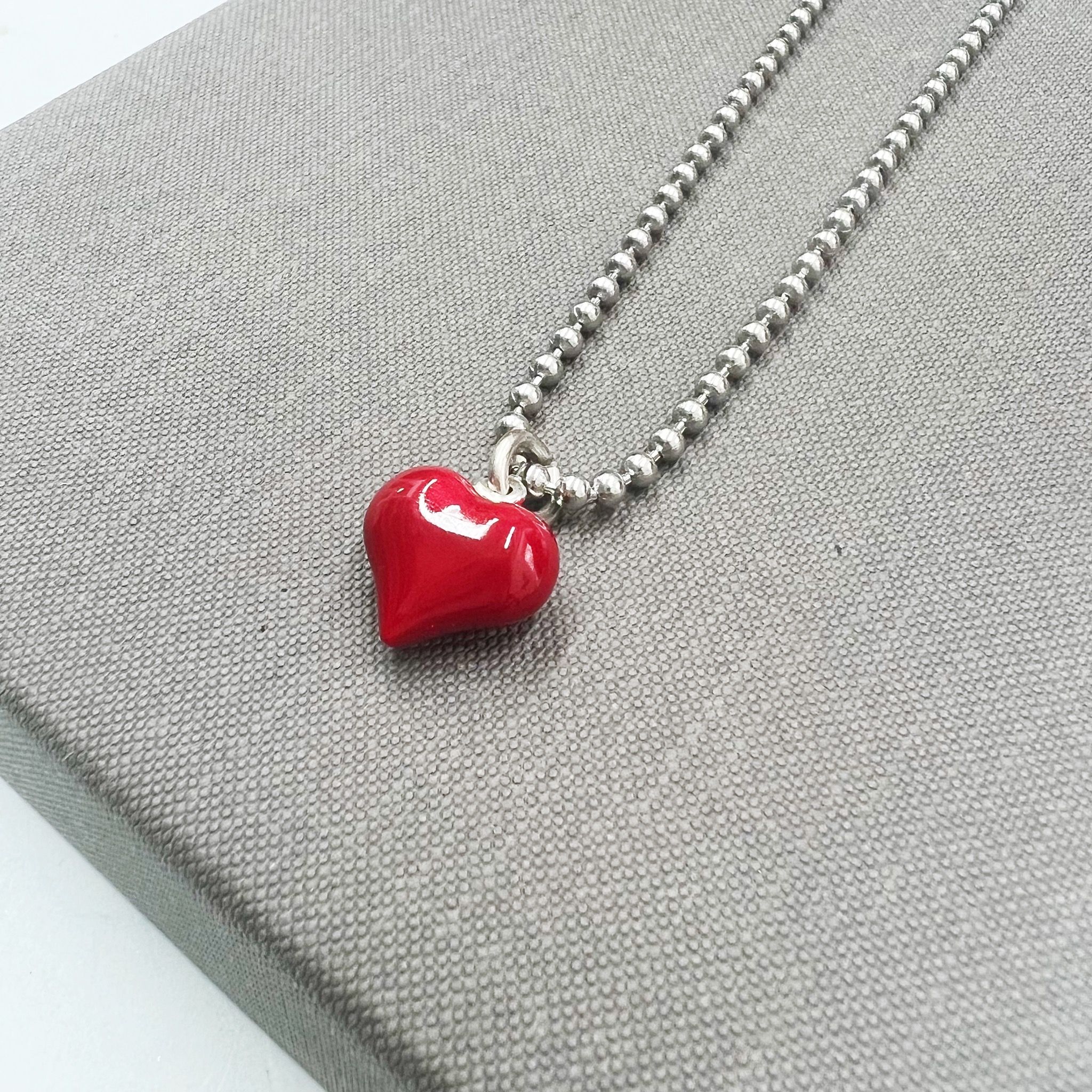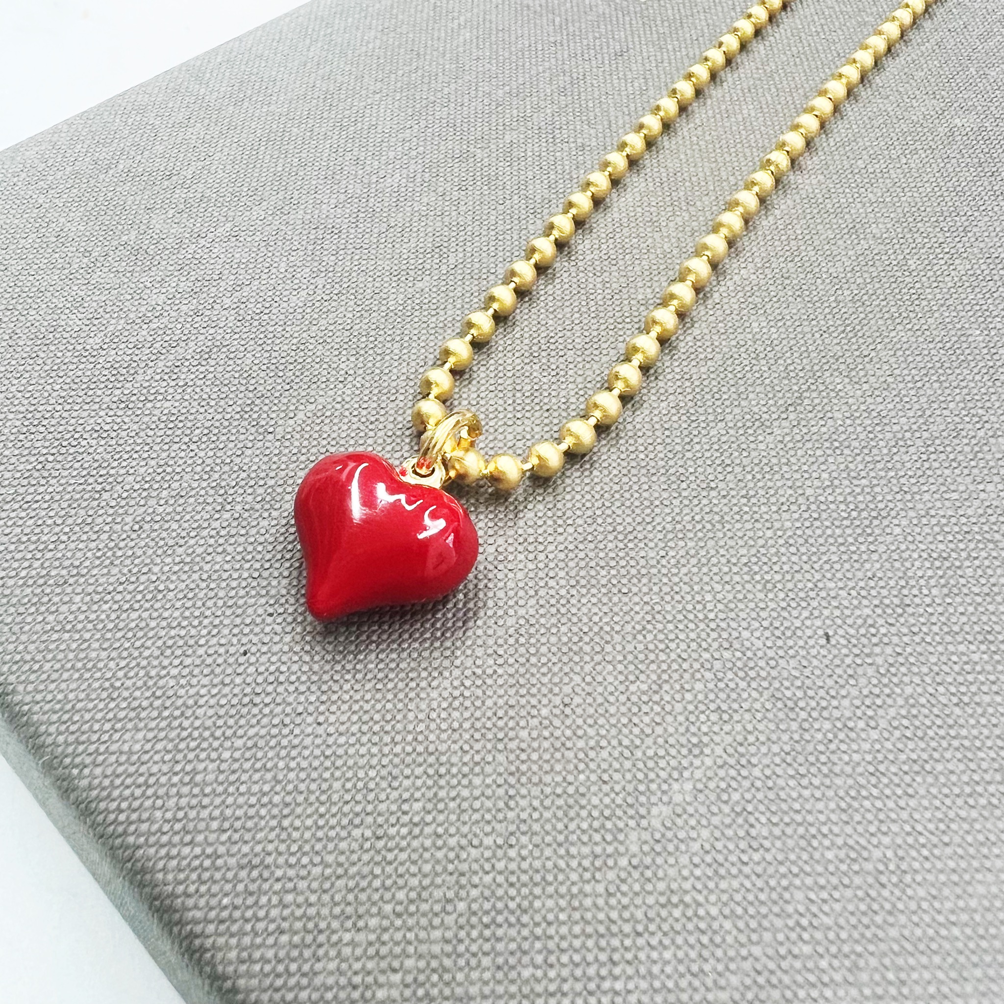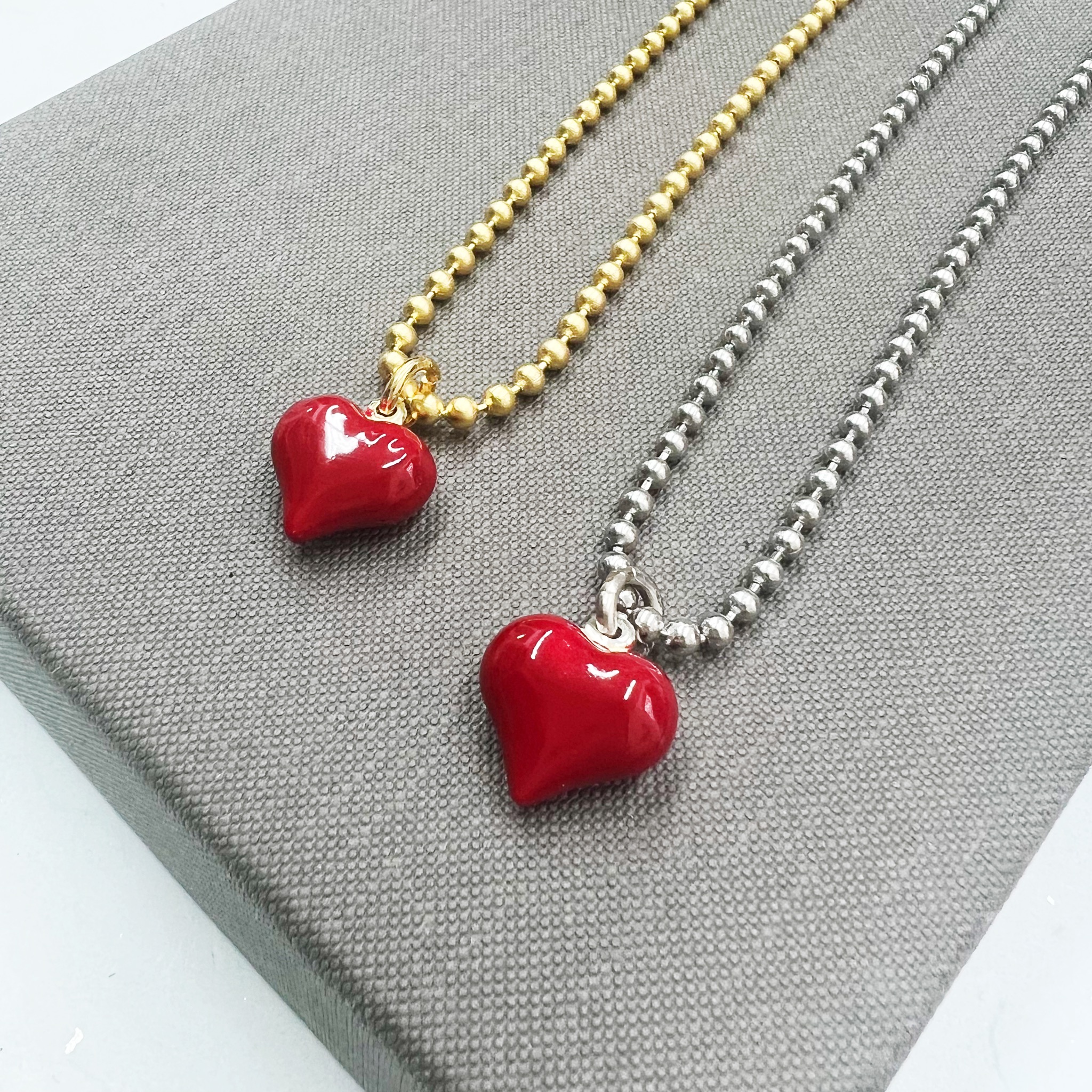 השרשרת עשויה שרשרת דסקית בציפוי זהב 24 קראט או בציפוי כסוף עמיד ואיכותי עם תליון לב מצופה באמייל אדום משגע.