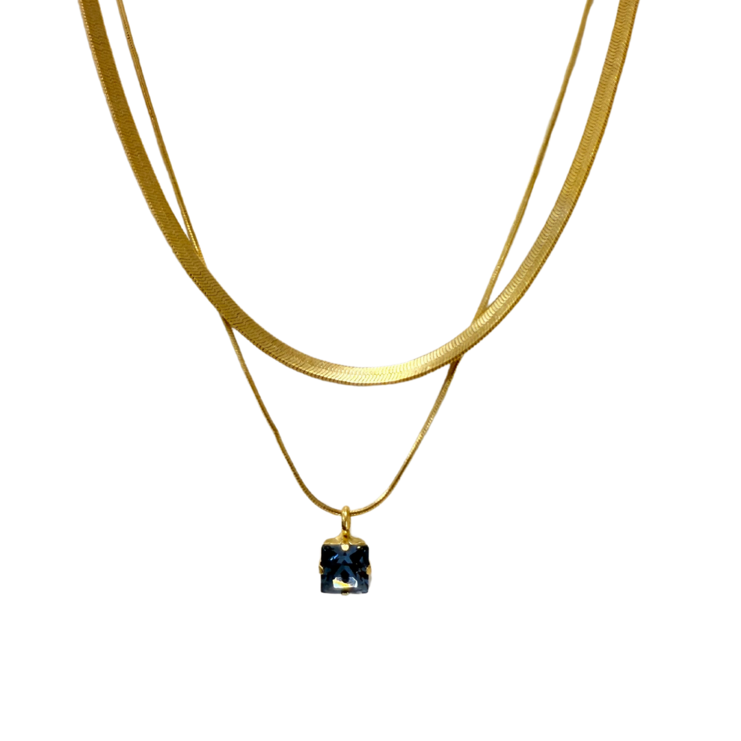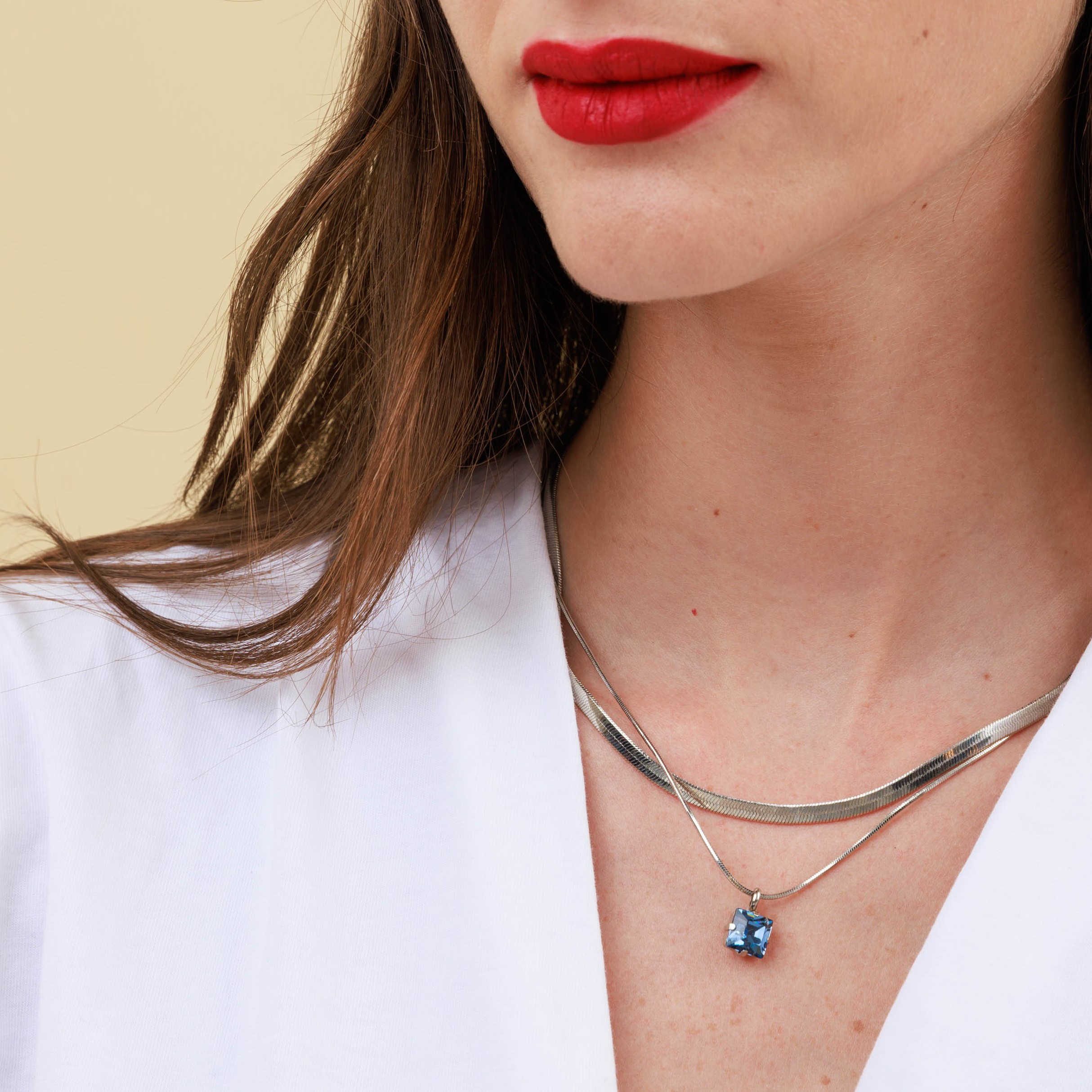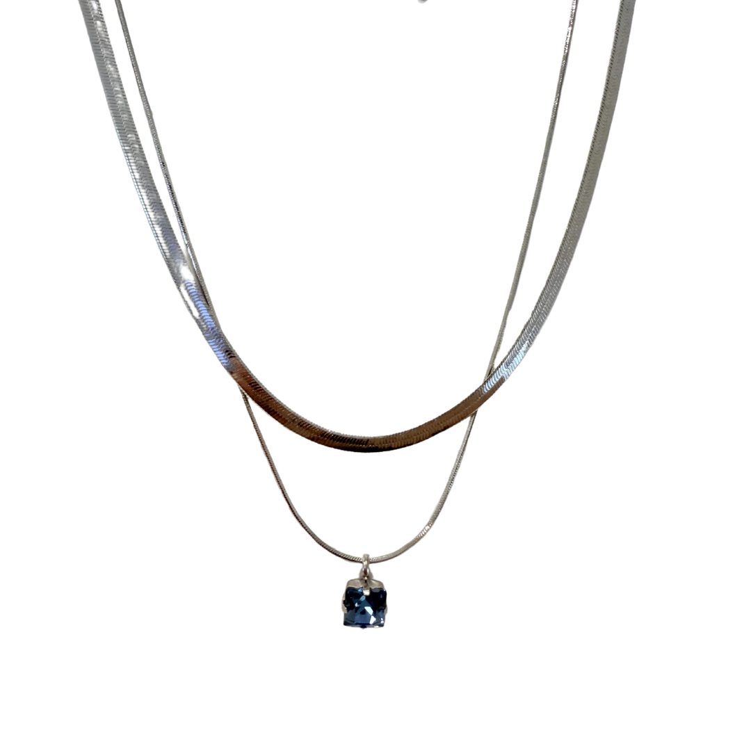 עשויה שתי שרשראות : נחש שטוחה עדינה ונחש עגולה עדינה משולבת תליון סברובסקי מהם בצבע כחול,