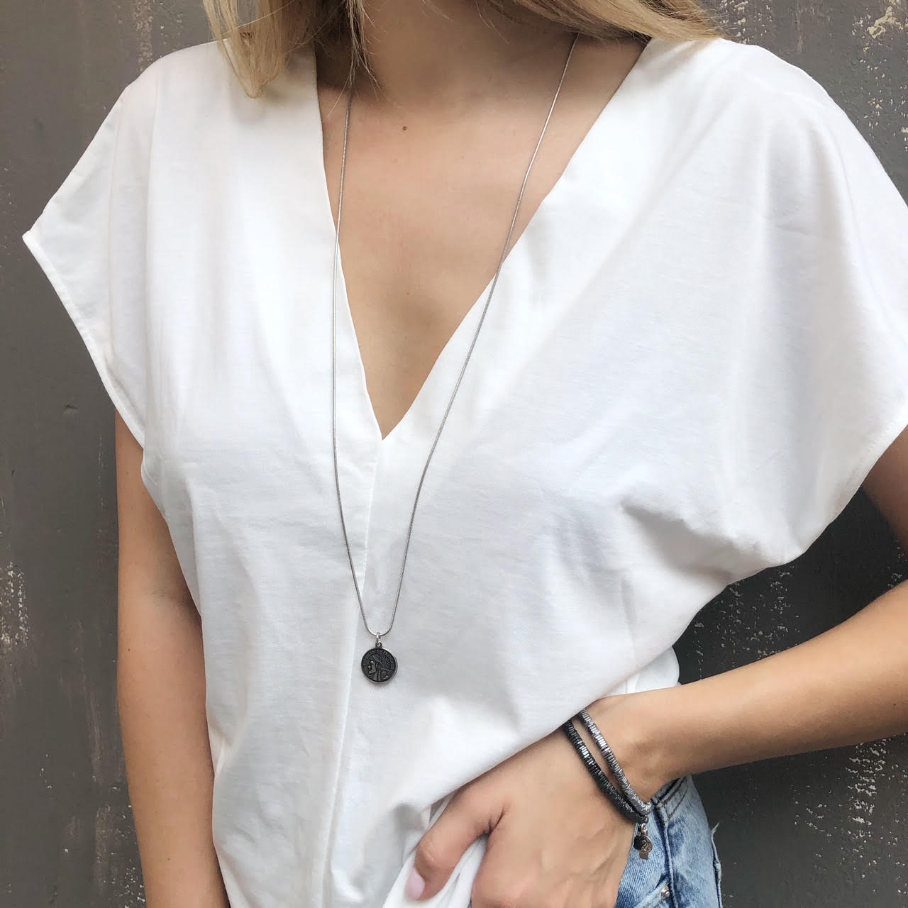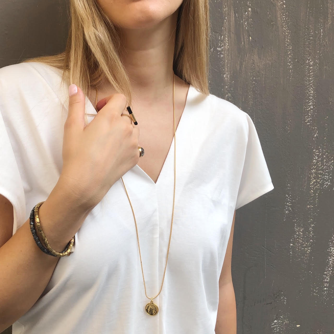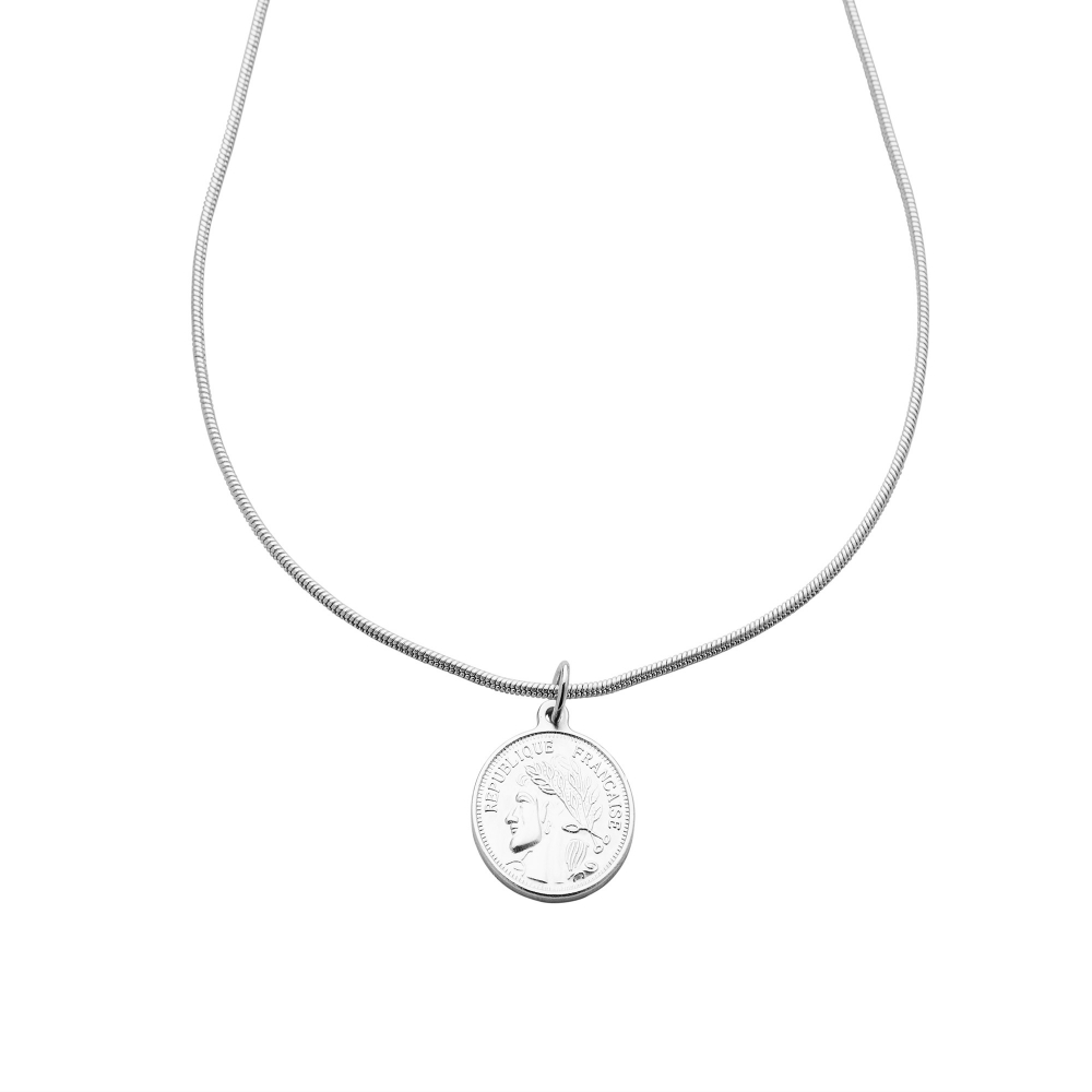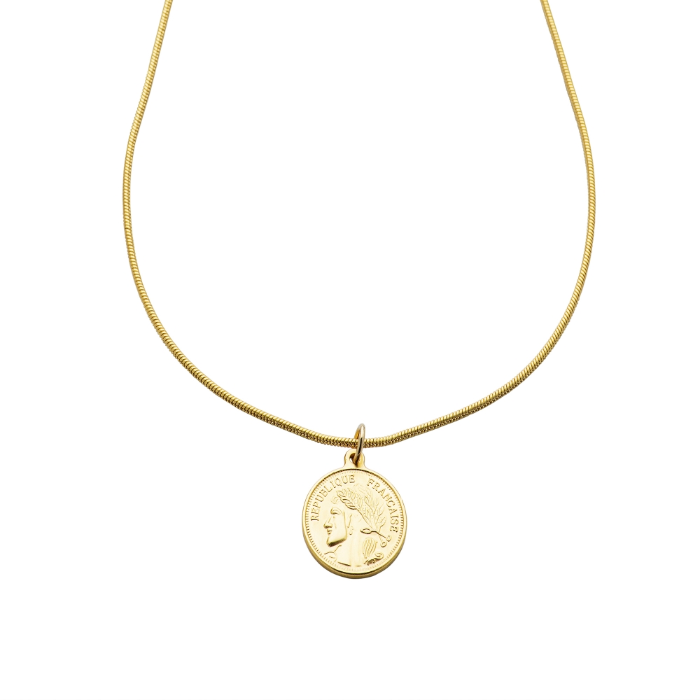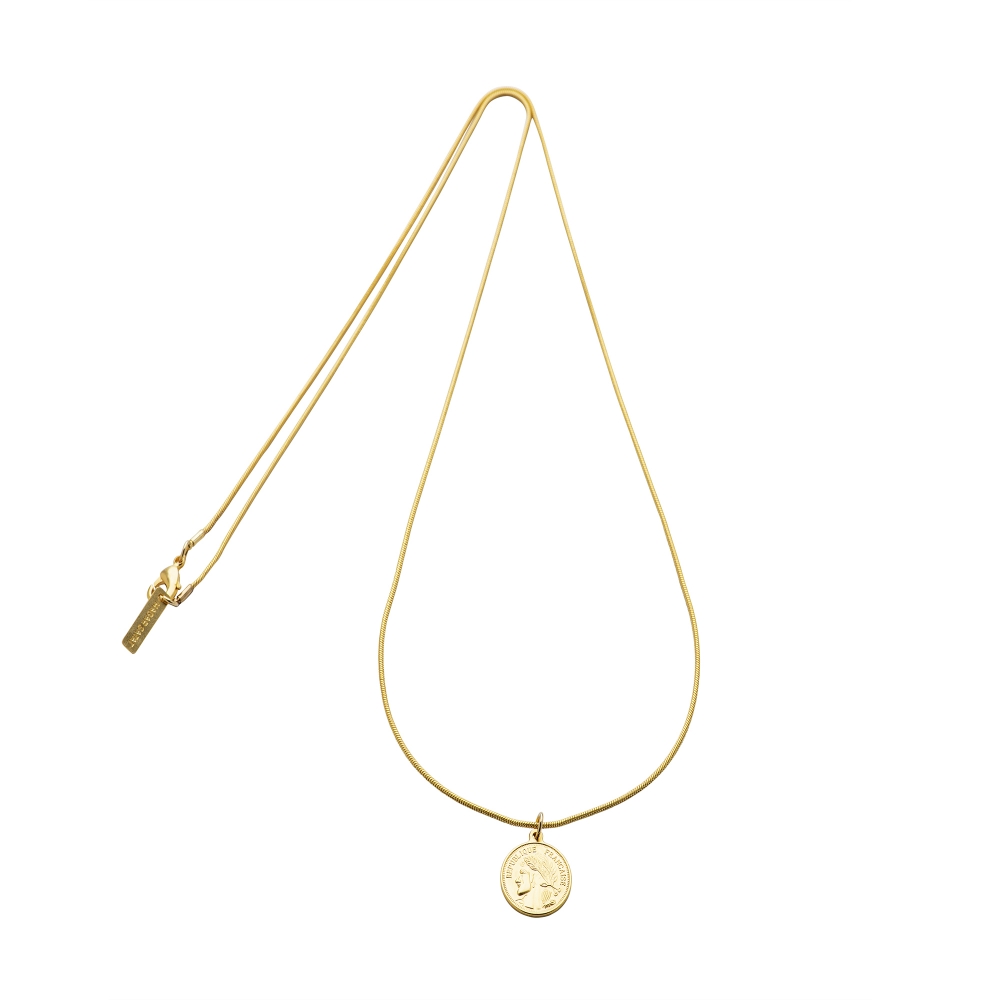 שרשרת נחש ארוכה וממנו תליון בצורת מטבע בציפוי זהב 24 קראט או בציפוי כסוף בגוון מט.