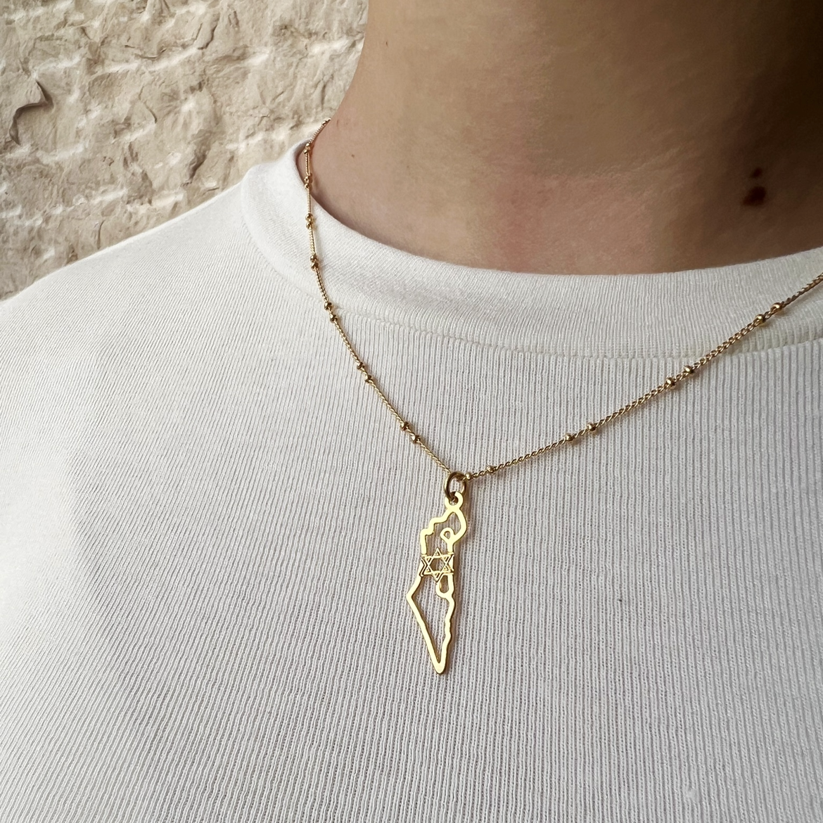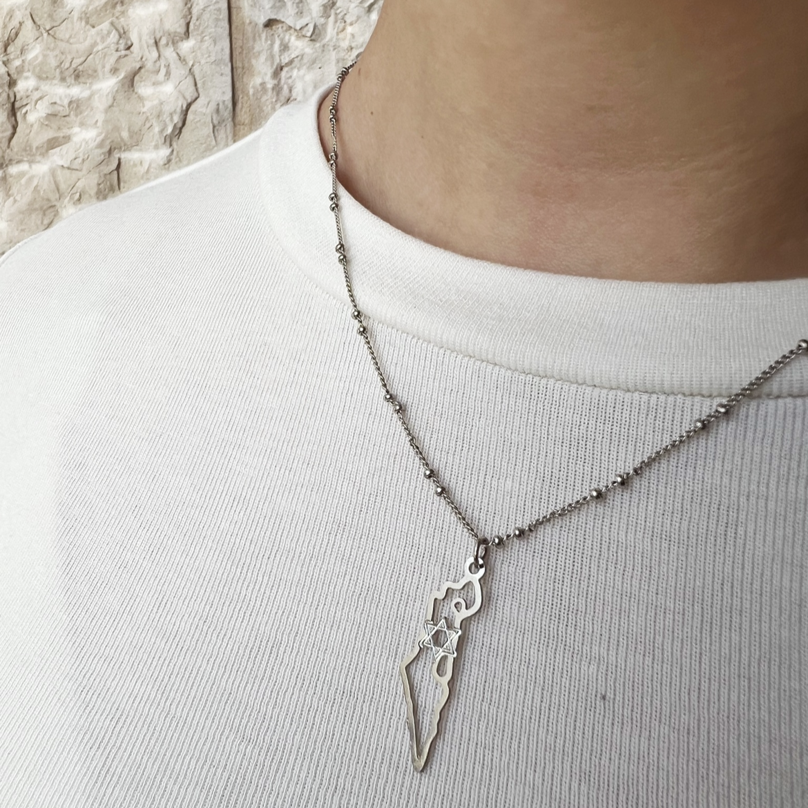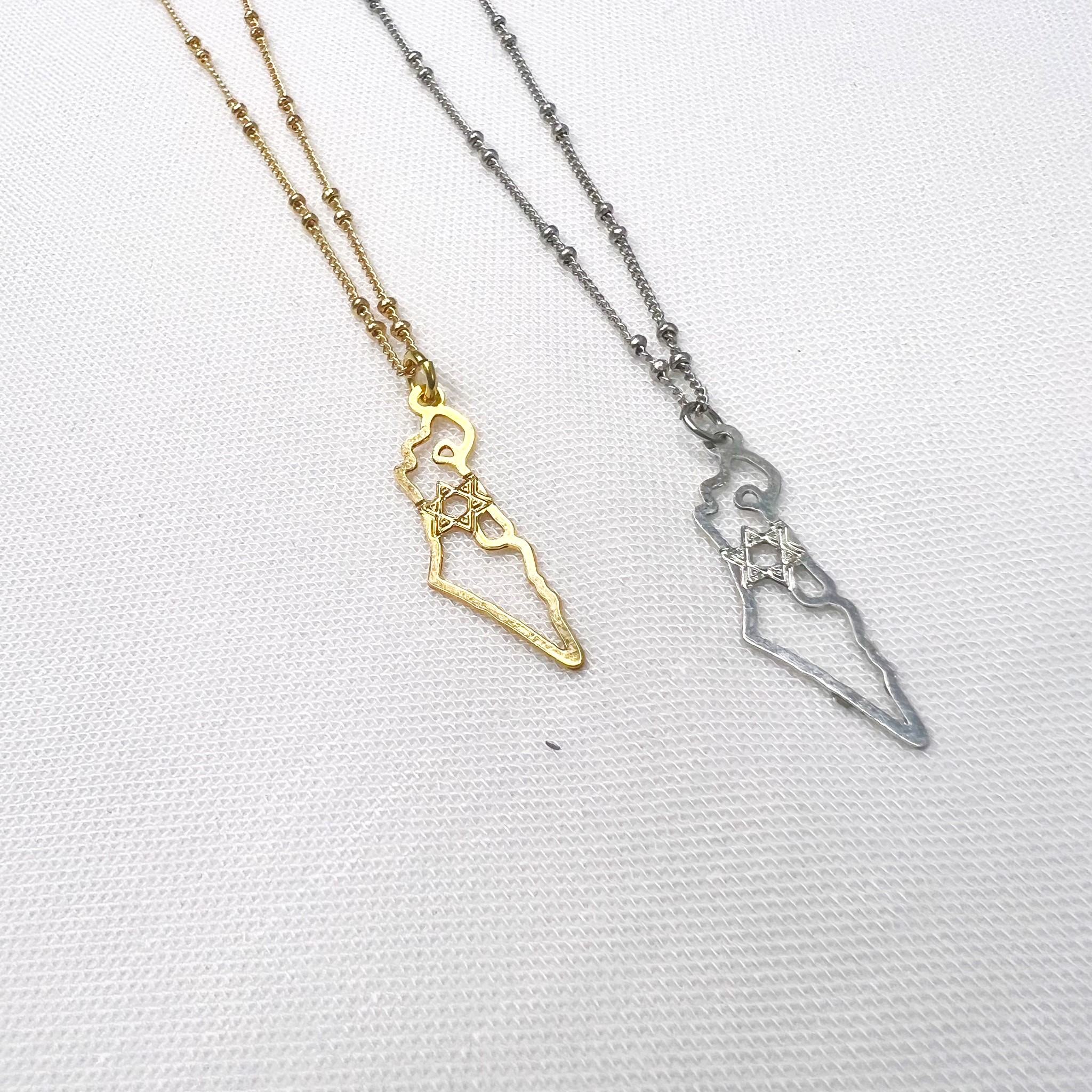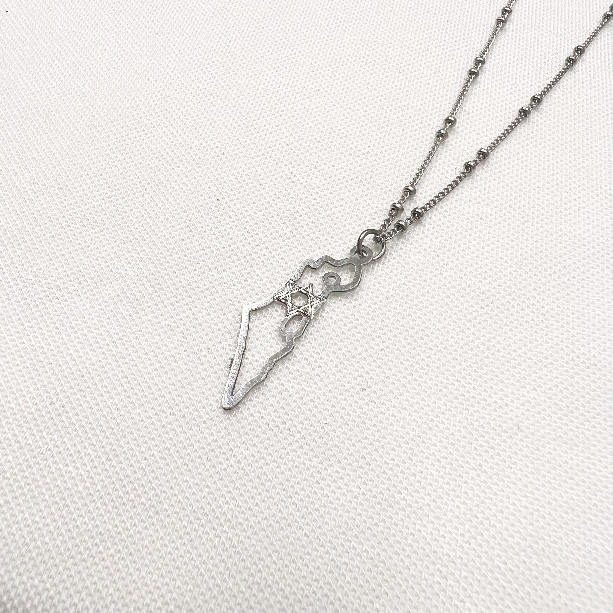 שרשרת עדינה עשויה סטיינלס סטיל עמיד ואיכותי עם תליון עדין של מפת ארץ ישראל ובמרכזה מגן דוד.