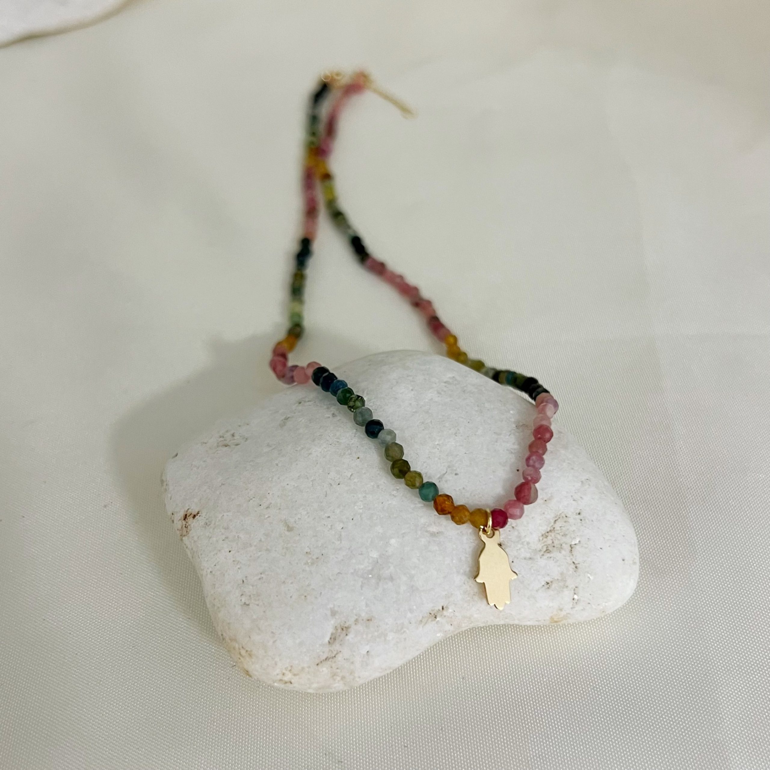 שרשרת מלאה בשיק עדינה אבל נוכחת עשויה אבני טורמלין אמיתיות מלאות במזל טוב משולבת עם תליון חמסה עדין עשוי זהב 14 קראט.