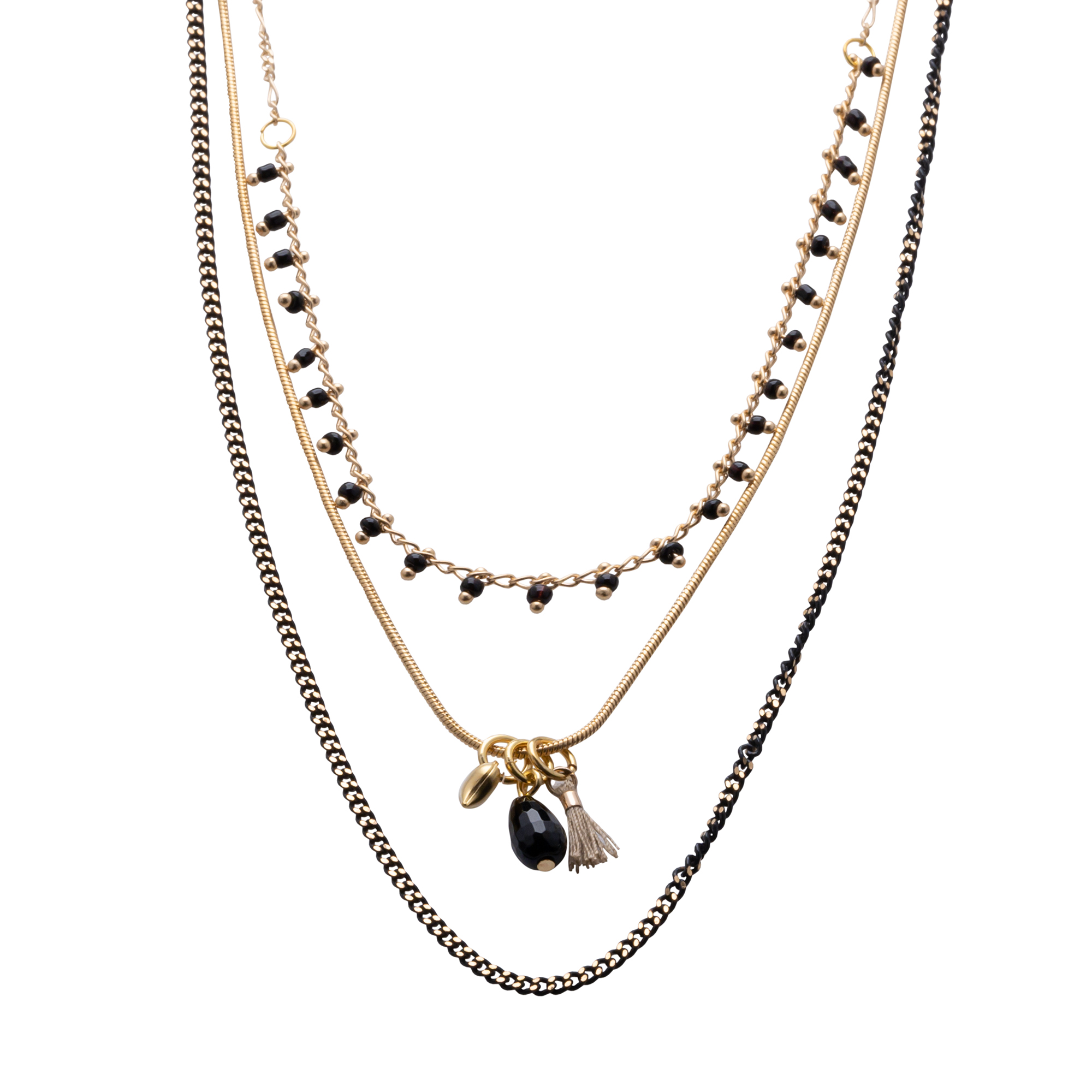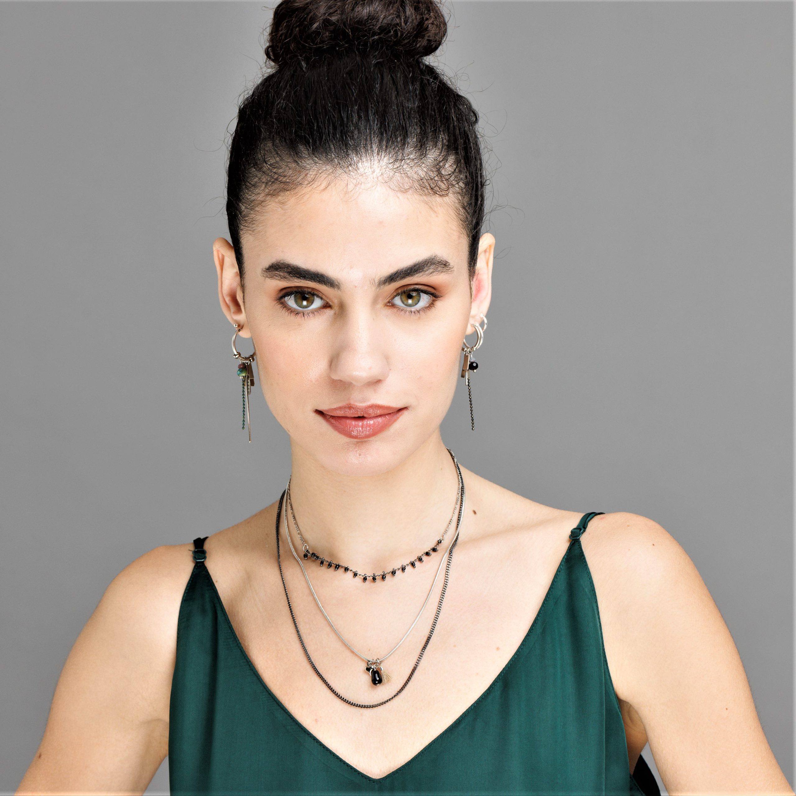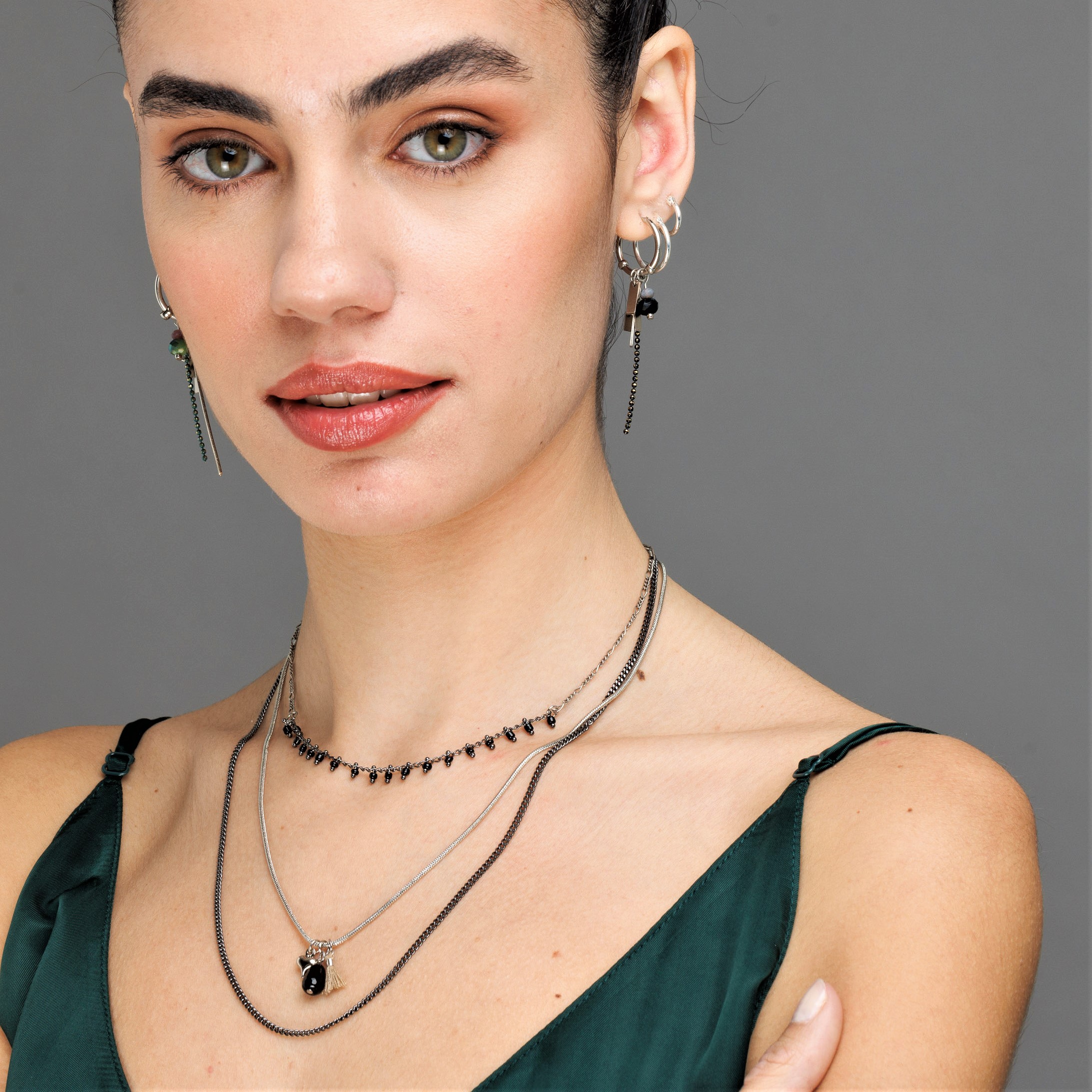שרשרת המורכבת משלוש שכבות: שכבה ראשונה שרשרת קצרה משולבת עם אבני שחורות קטנות, שרשרת אמצעים עם תליונים ושרשרת תחתונה של גורמט עדינה בצבע שחור