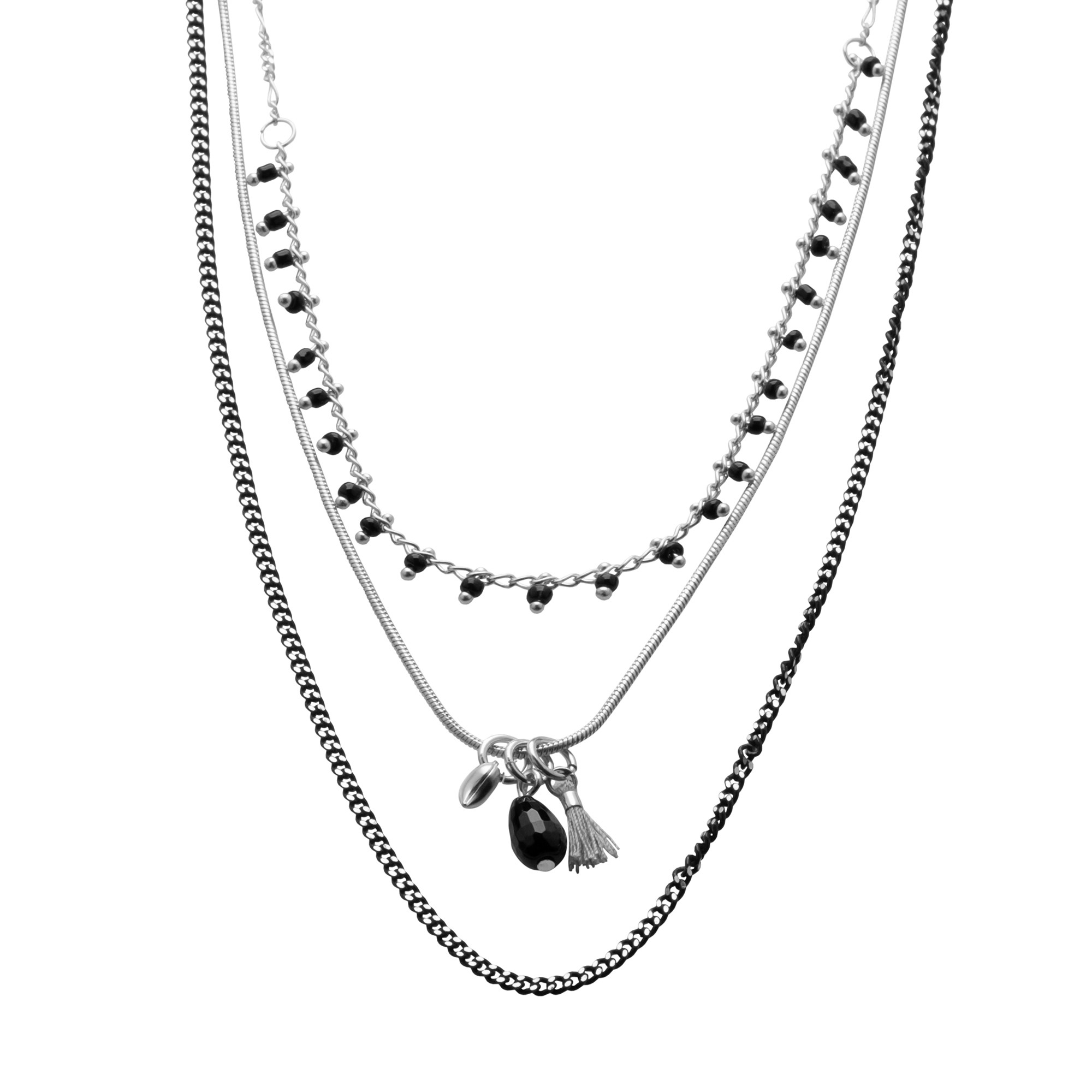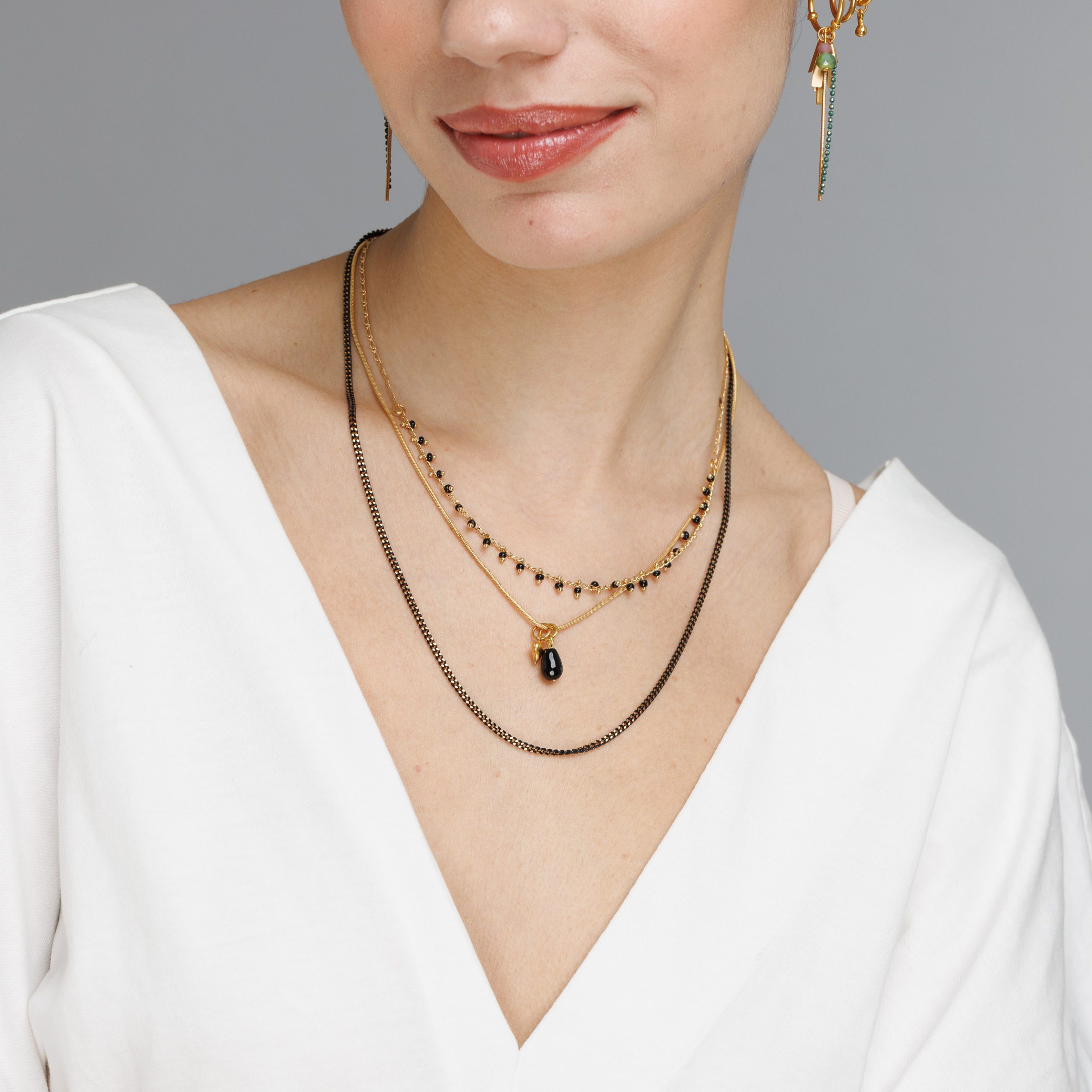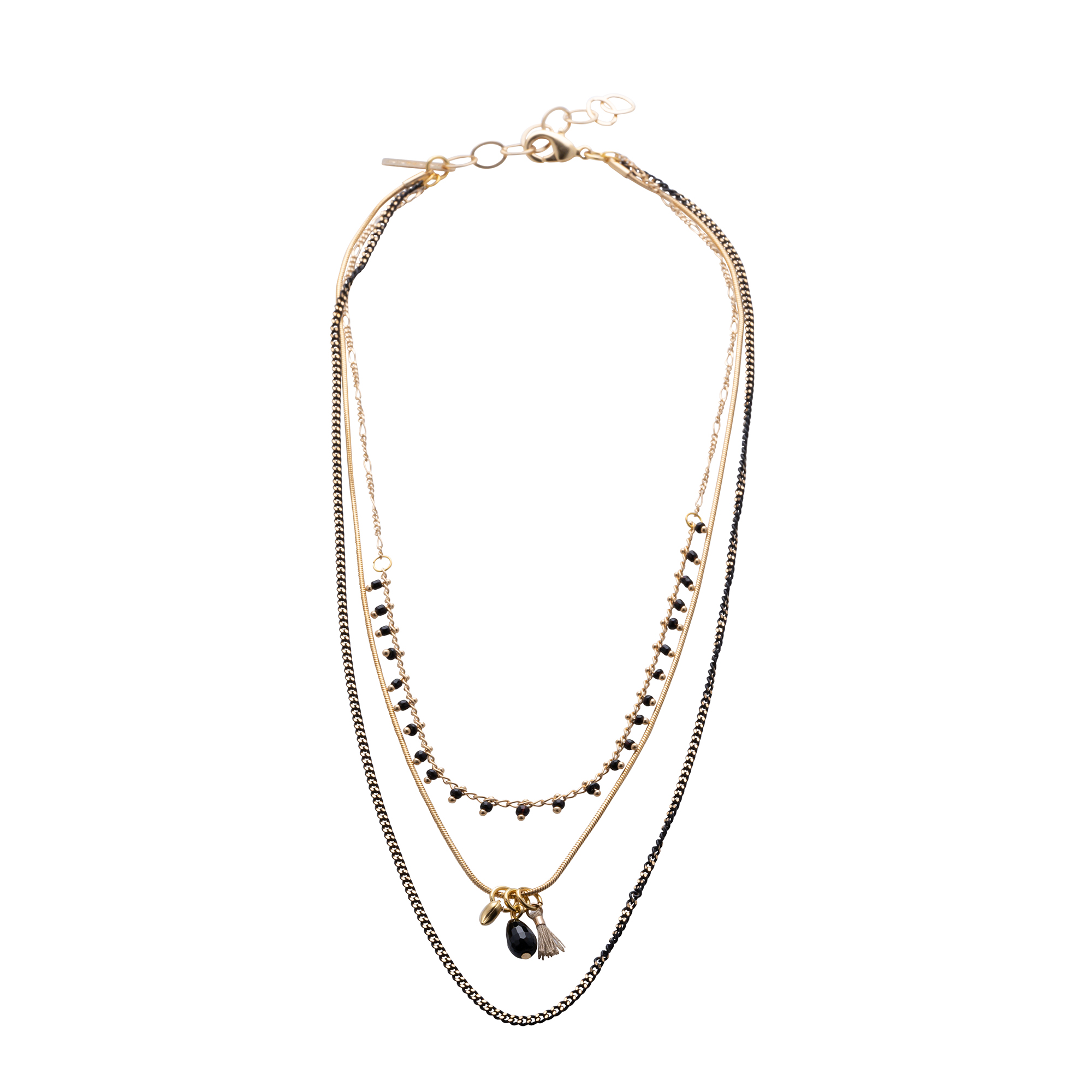 שרשרת המורכבת משלוש שכבות: שכבה ראשונה שרשרת קצרה משולבת עם אבני שחורות קטנות, שרשרת אמצעים עם תליונים ושרשרת תחתונה של גורמט עדינה בצבע שחור