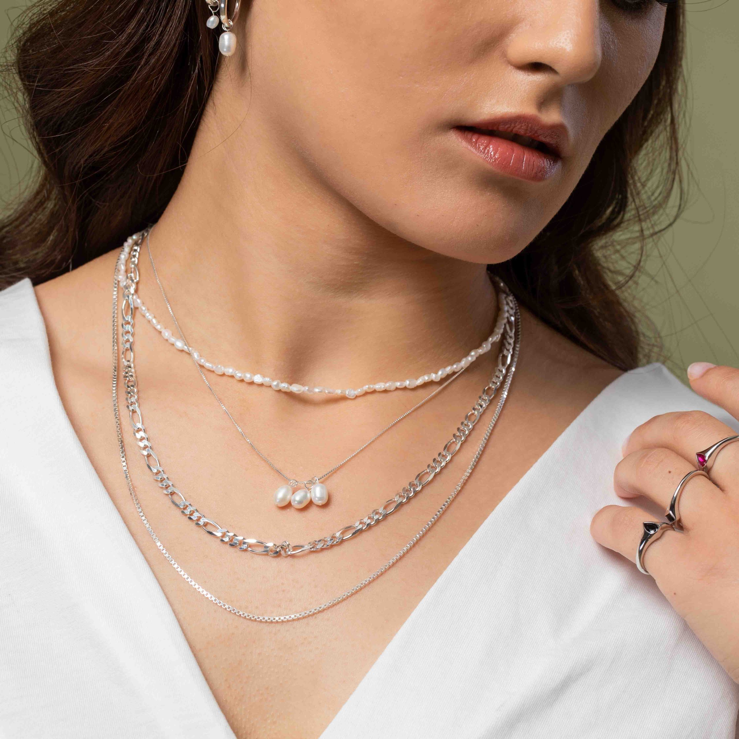 השרשרת עשויה שרשרת עדינה עשויה כסף אמיתי, אליה מחוברות שלוש פנינים יפות ואיכותיות.