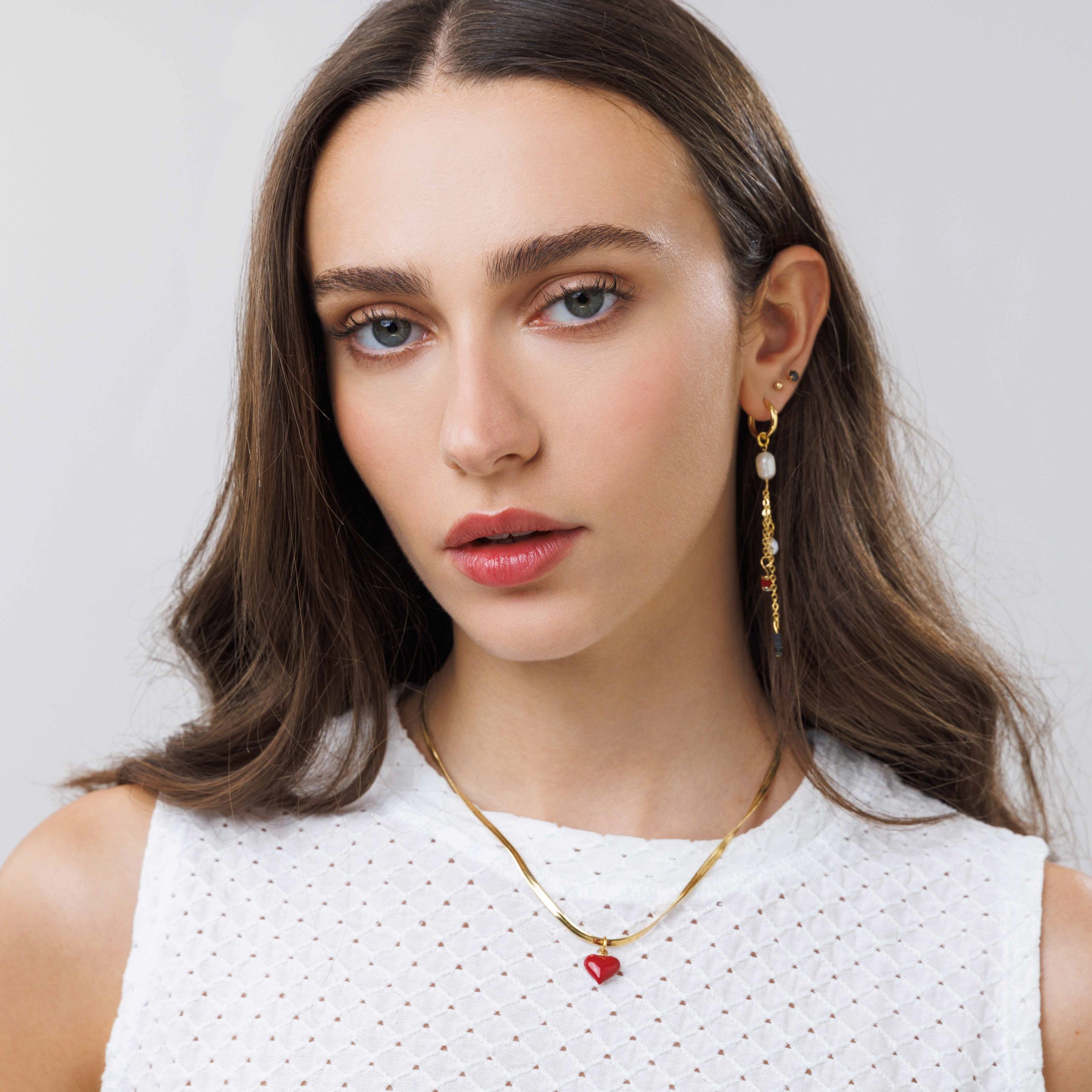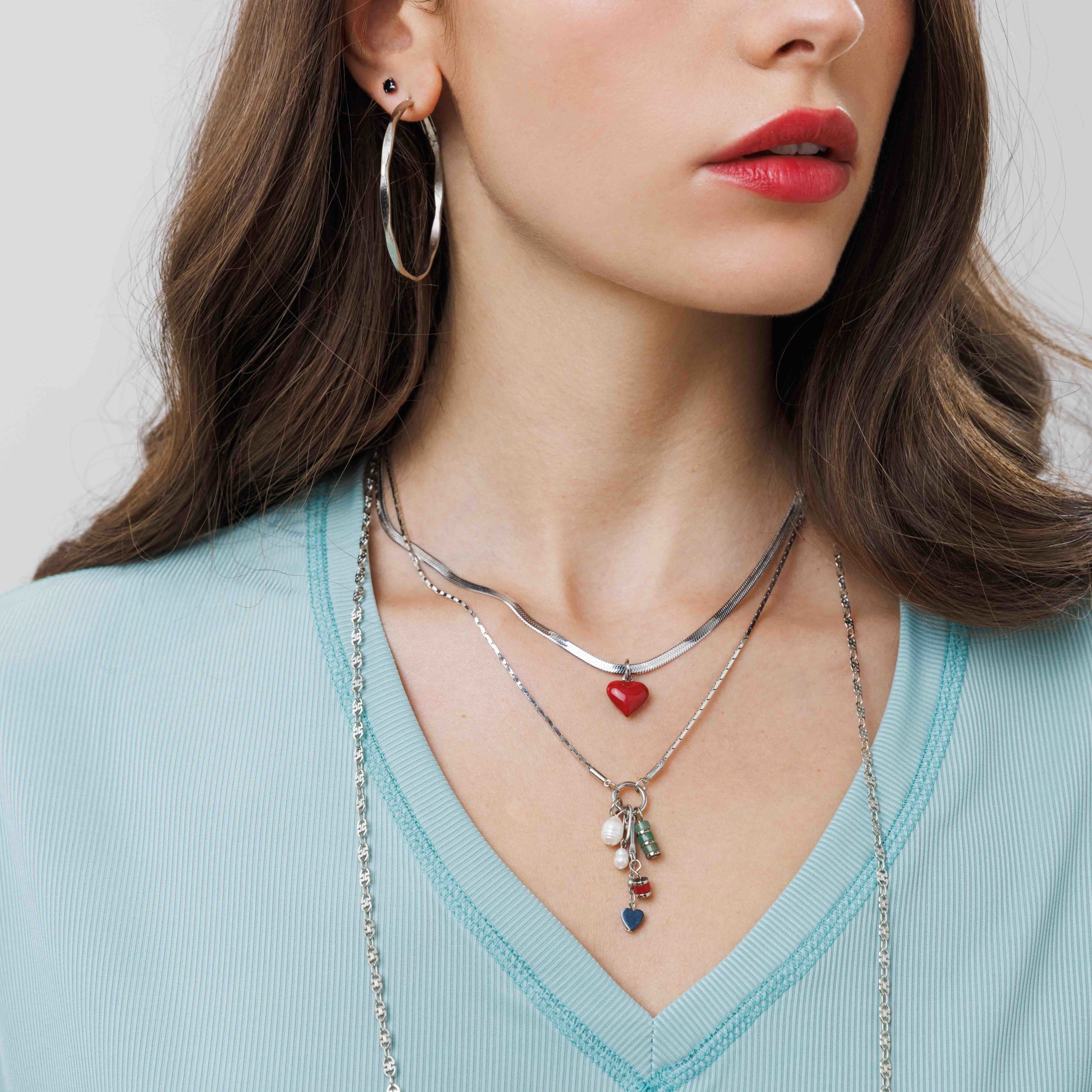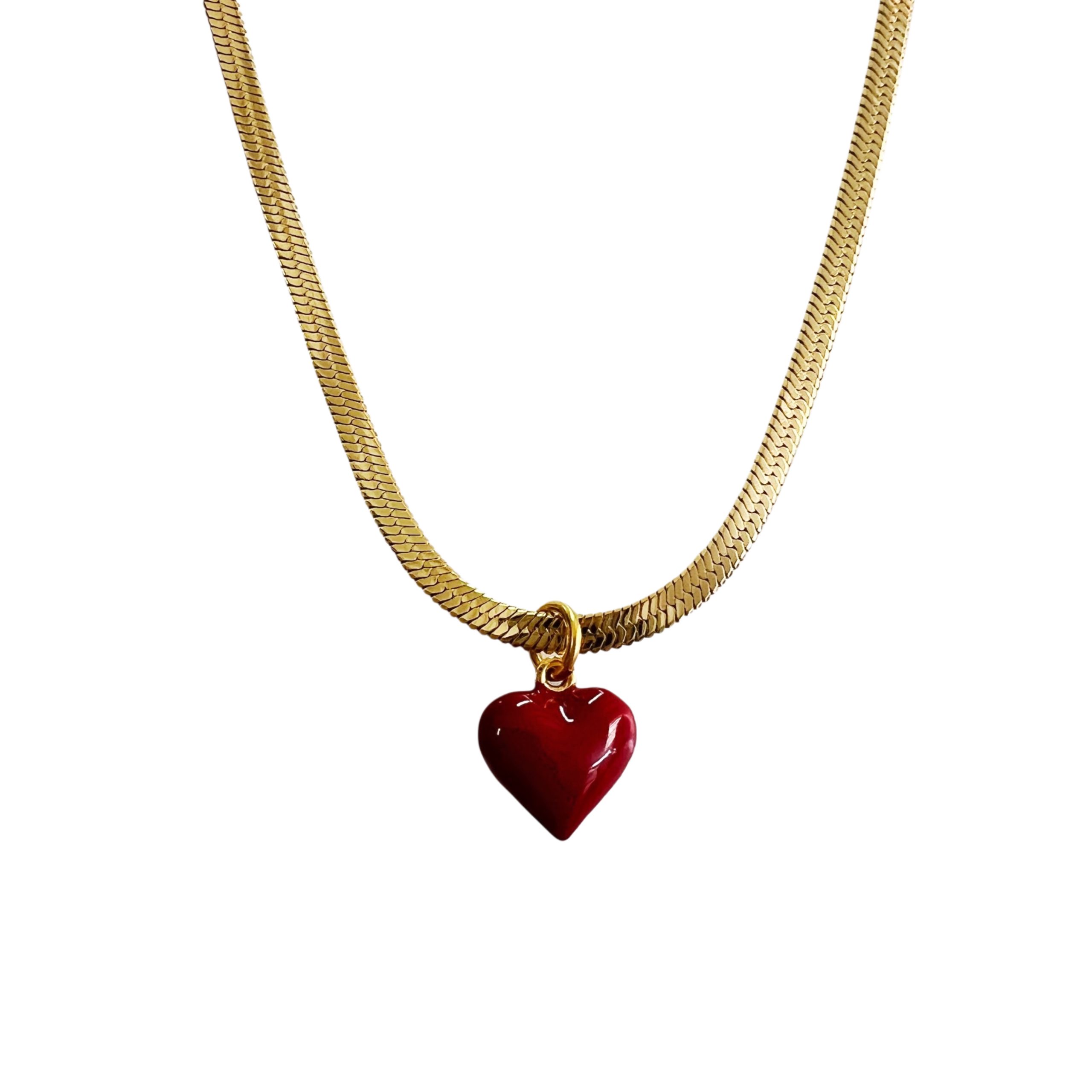 שרשרת דגם נחש שטוחה משולבת עם תליון לב המצופה באמייל אדום.
