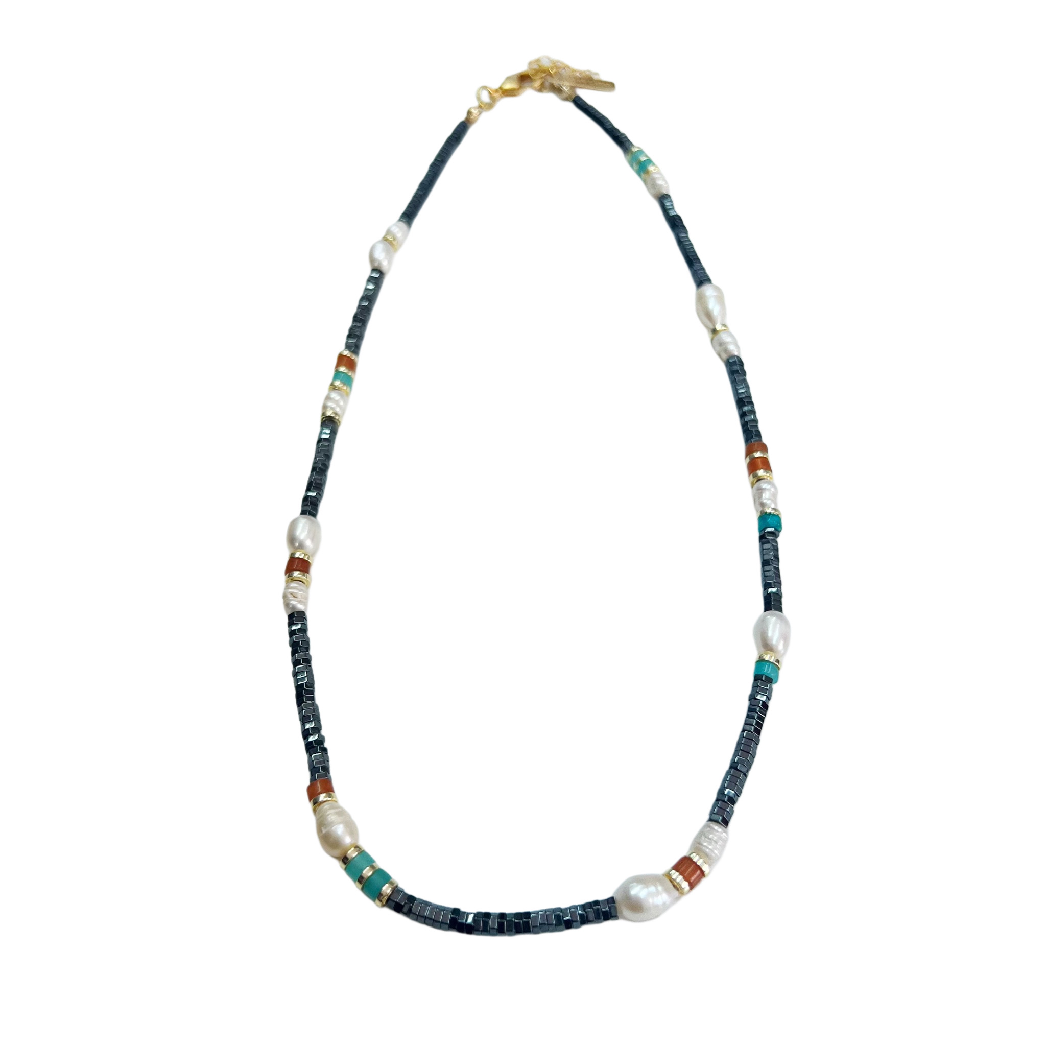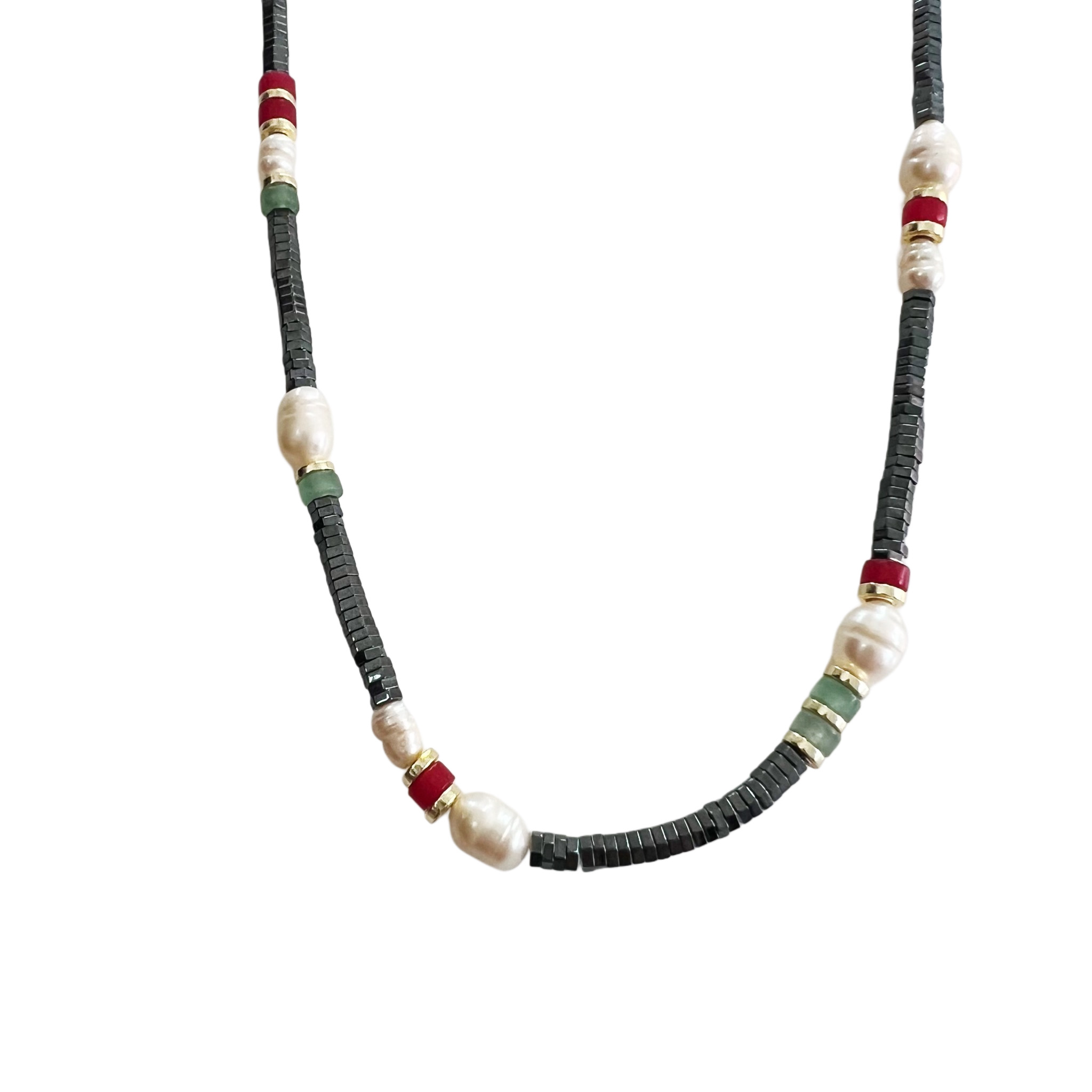 שרשרת משגעת עשויה חרוזי המטייט מנצנצים משולבים עם פנינים ואבני חן אמיתיות.