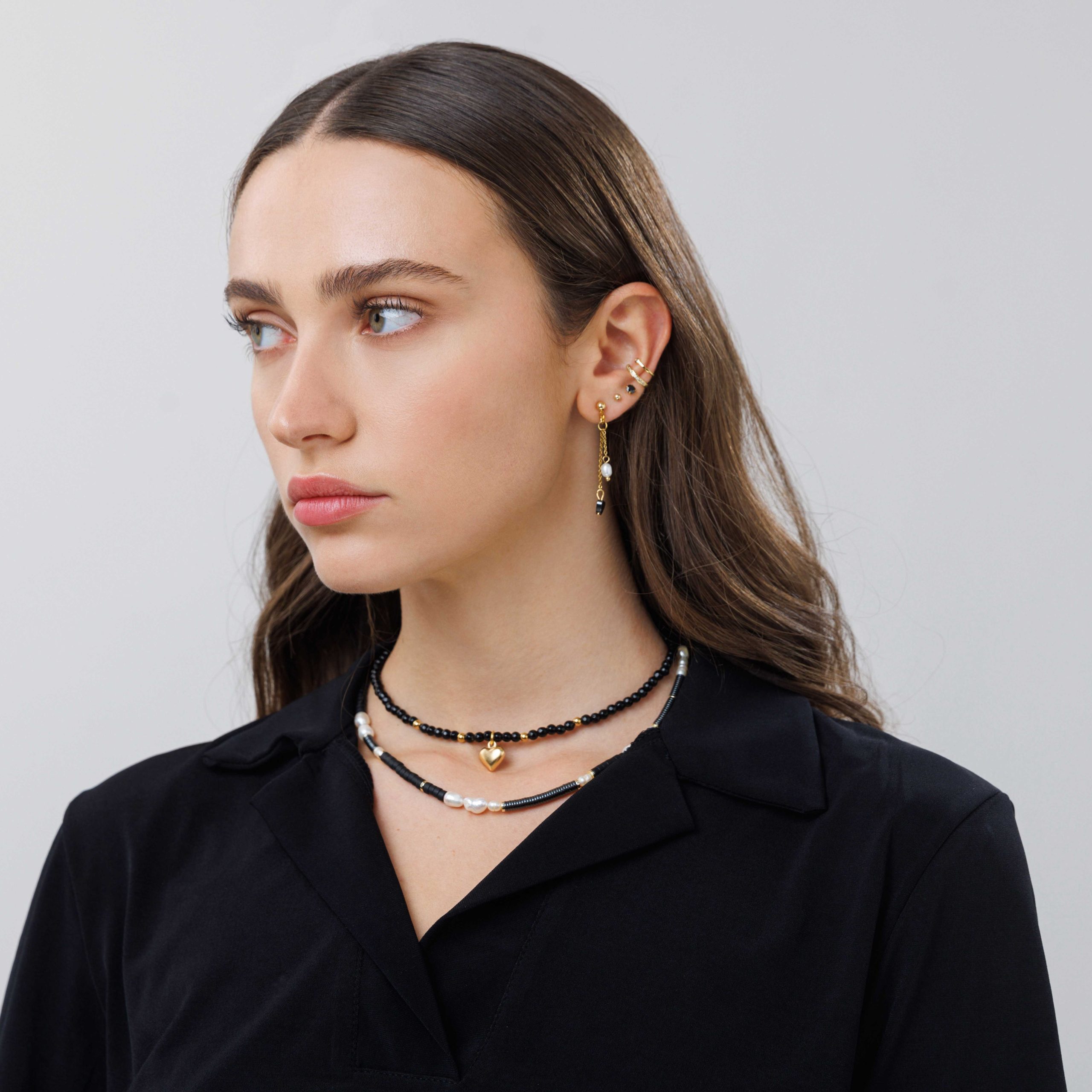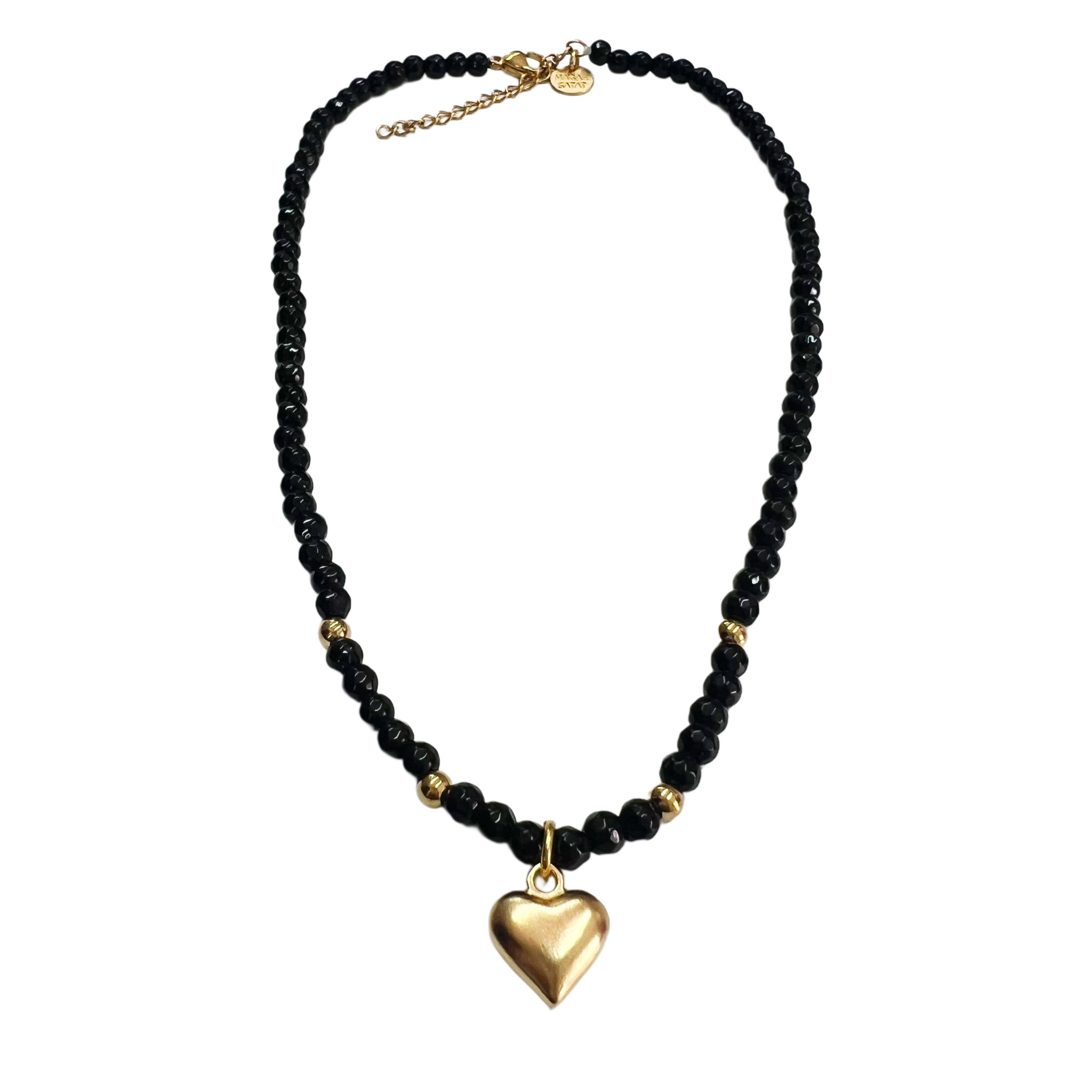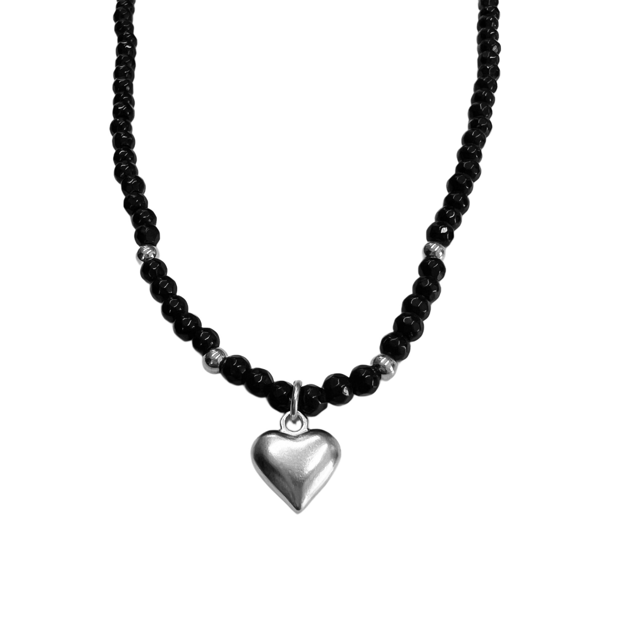 אבני חן שחורות משולבות עם חרוזי מתכת המצופים כסף ומושחלים על חוט חזק ואיכותי.