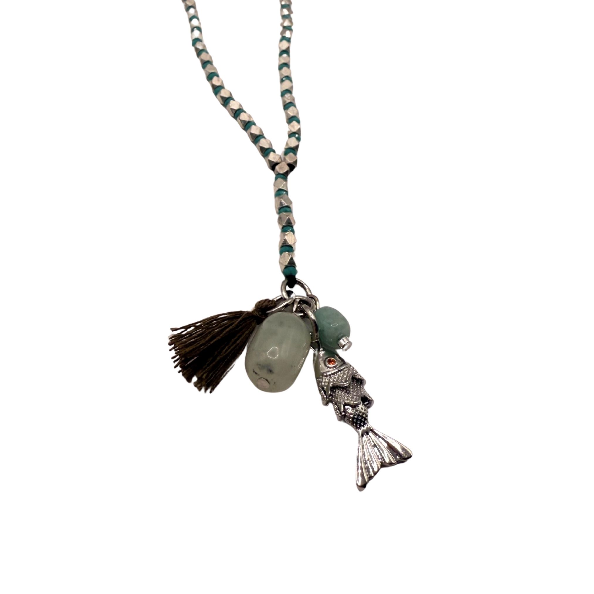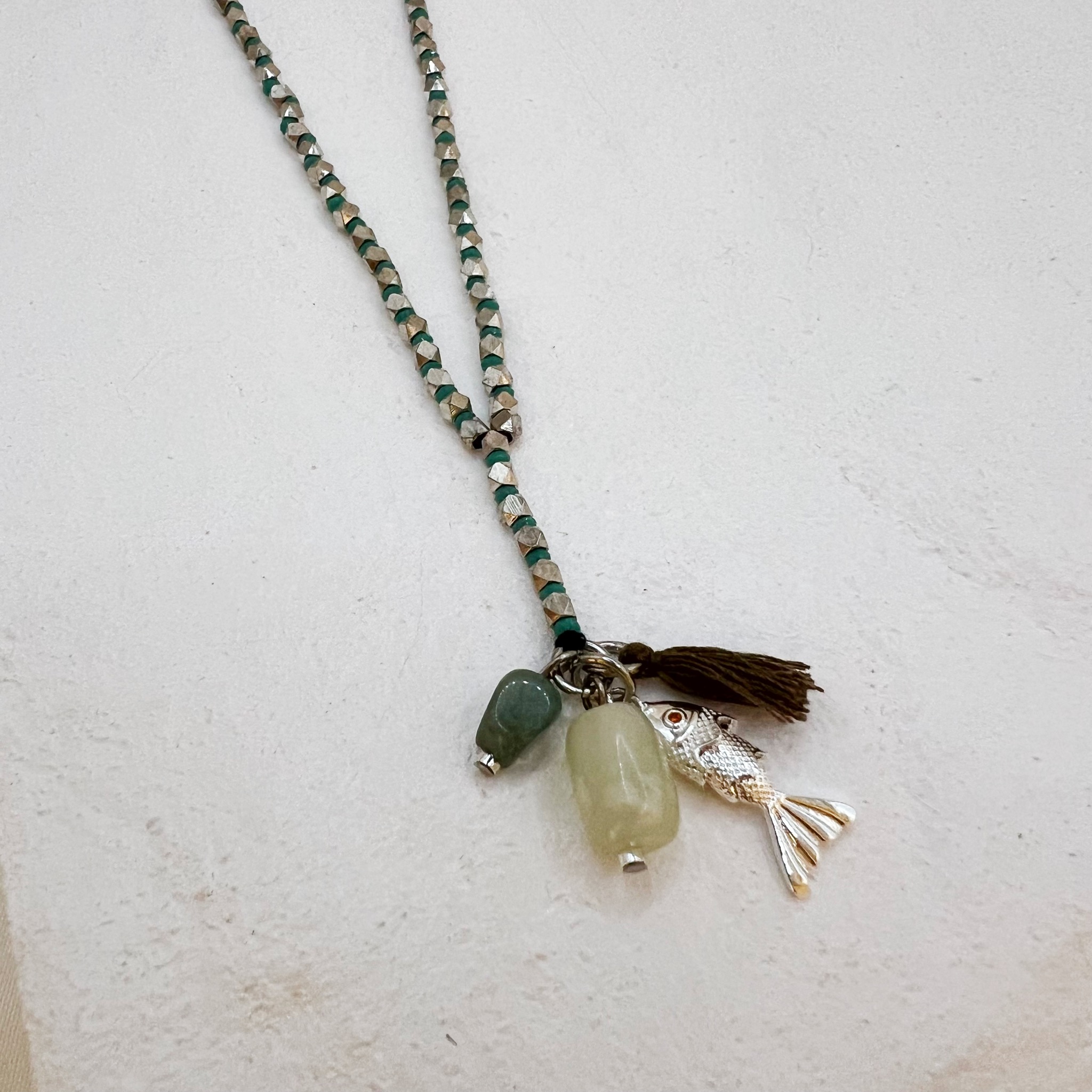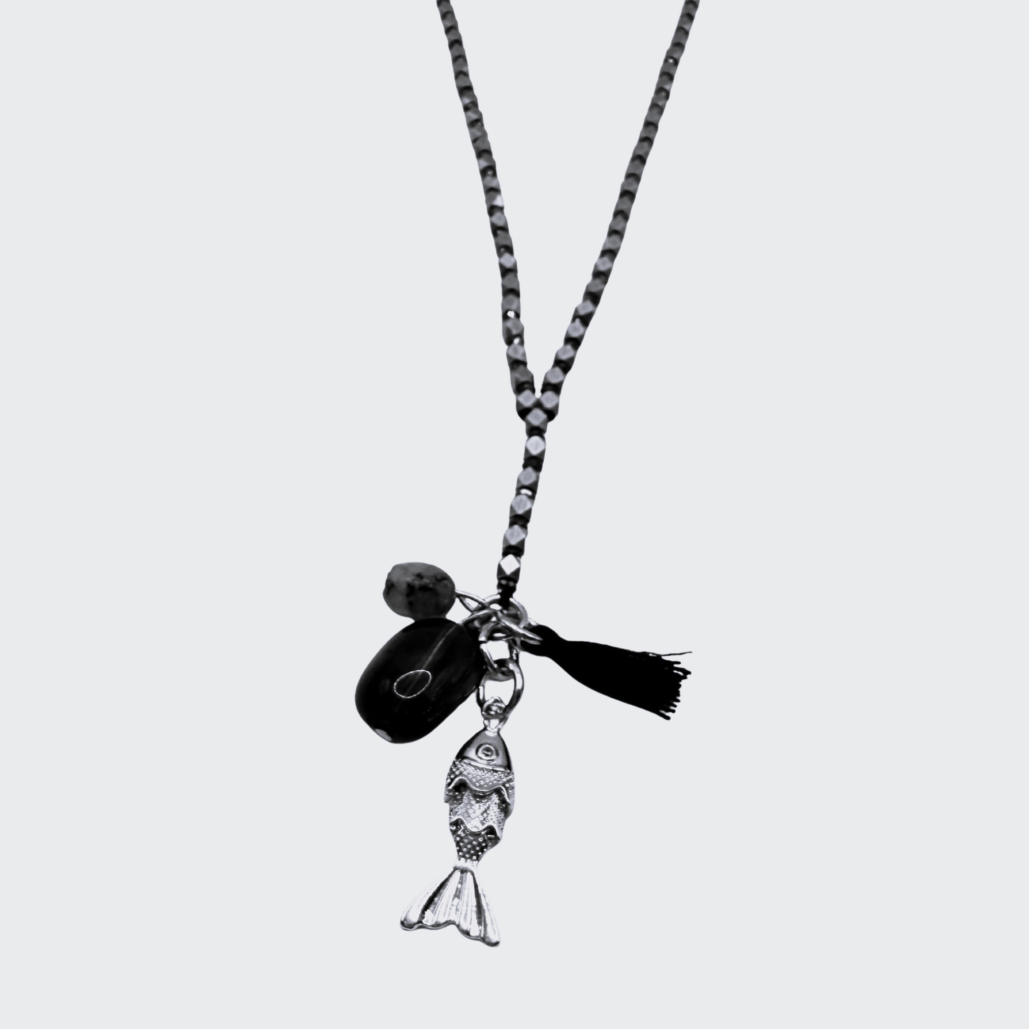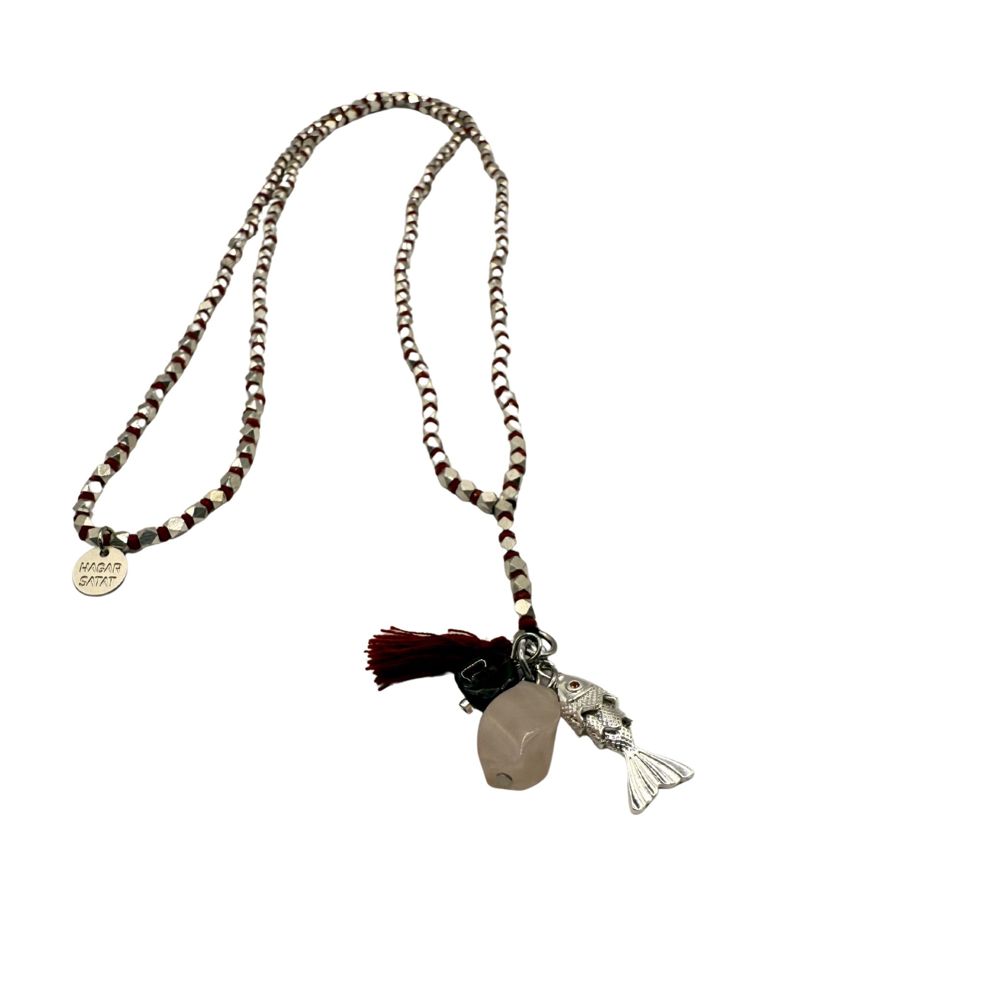 במרכז השרשרת ארבעה תליונים ייחודיים – תליון דג, תליון גדיל ושני תליוני אבנים טבעיות.