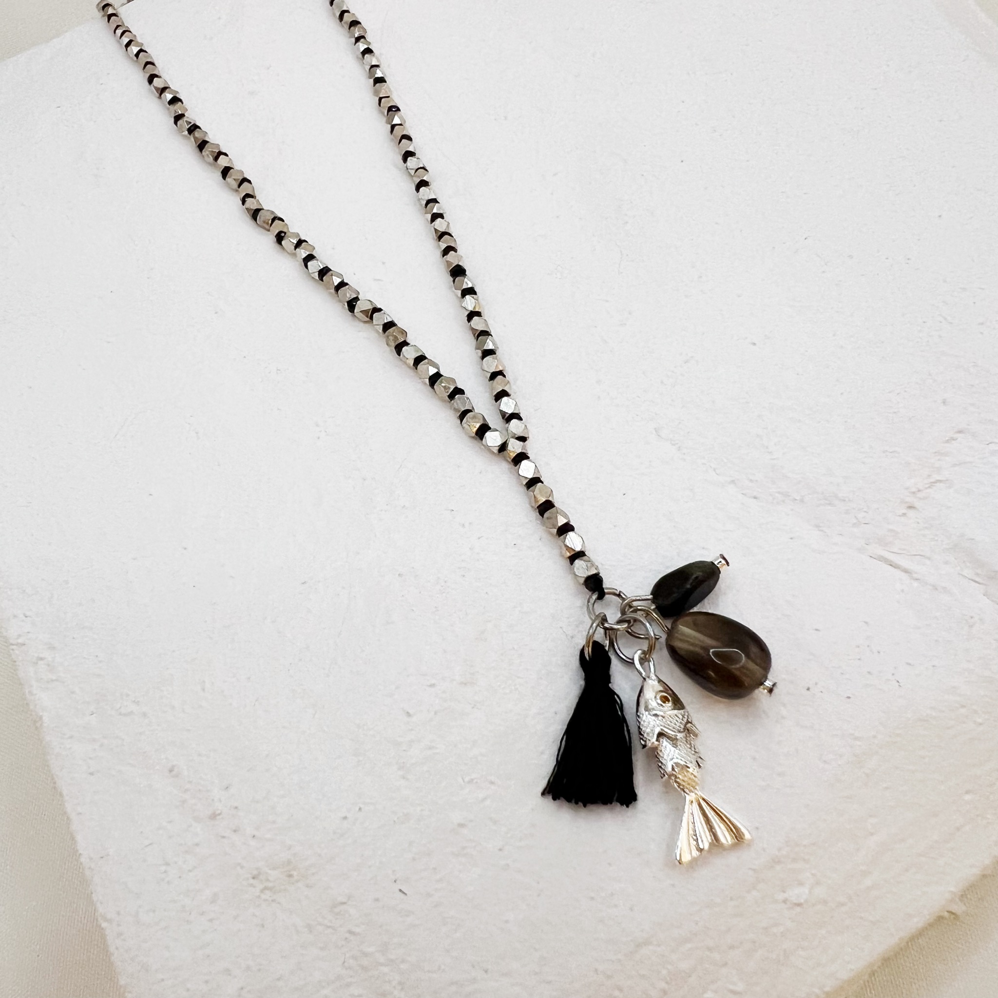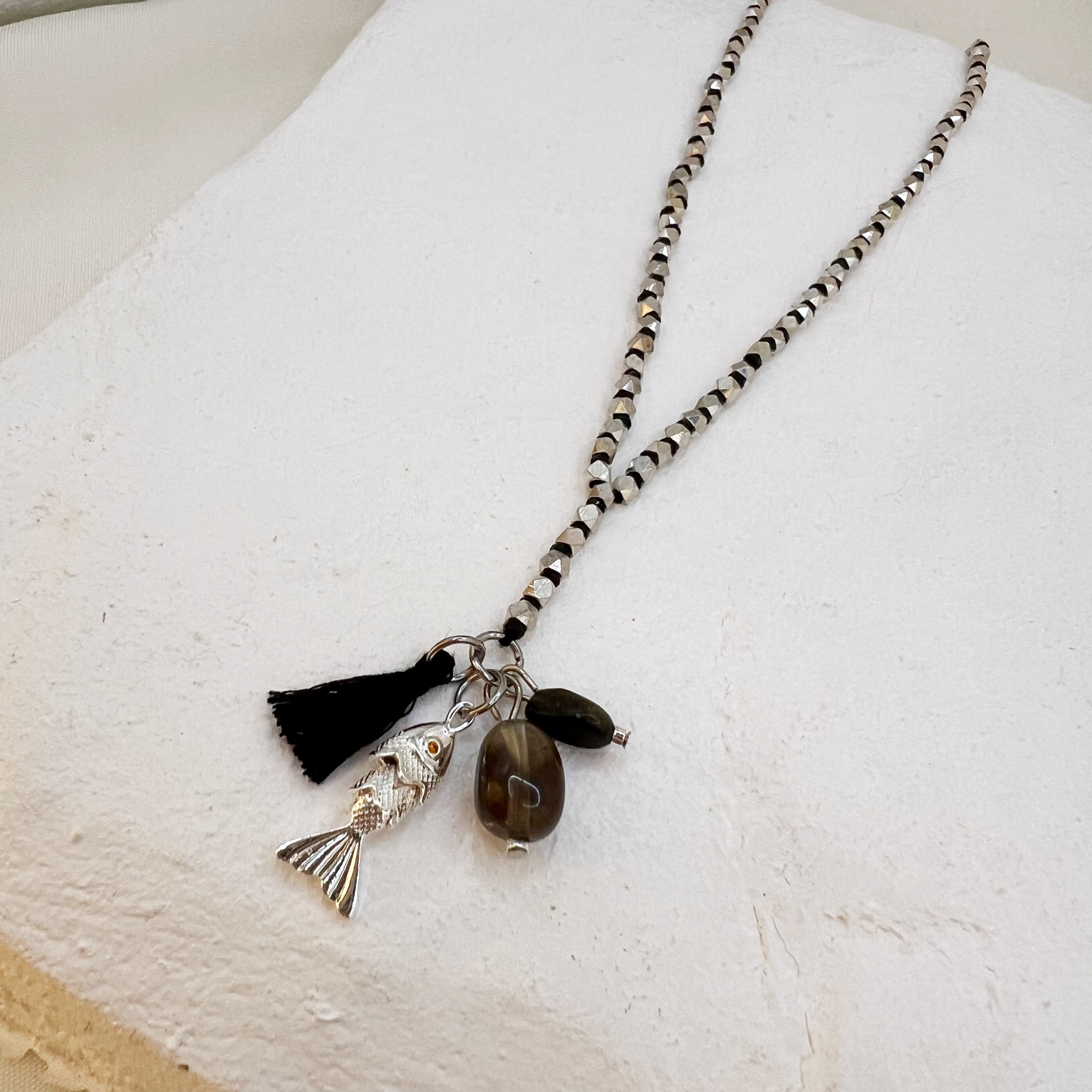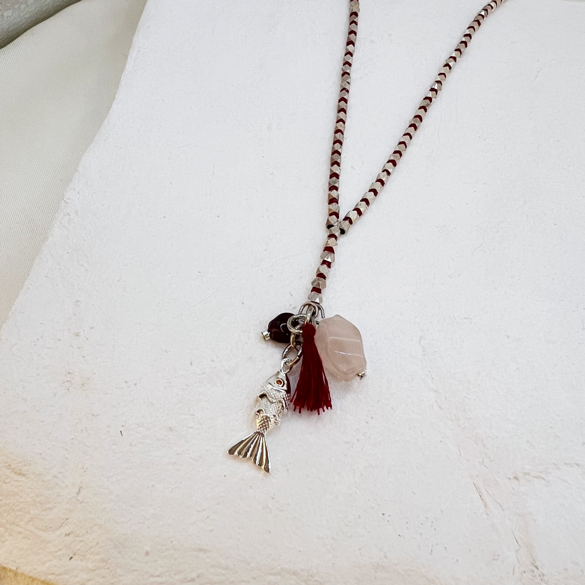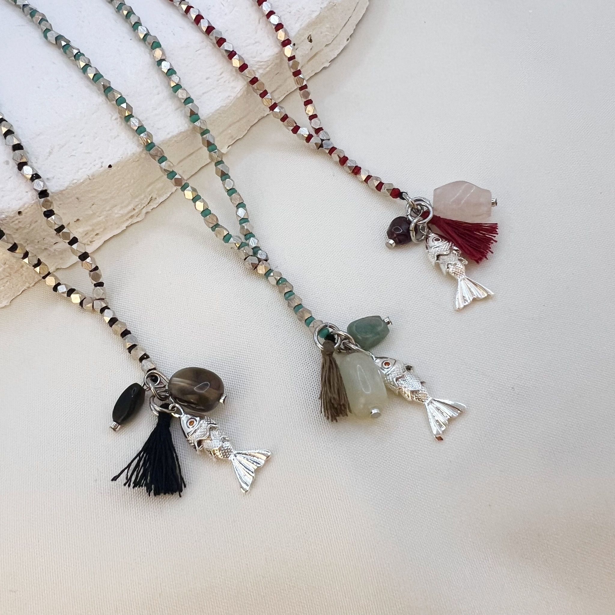 במרכז השרשרת ארבעה תליונים ייחודיים – תליון דג, תליון גדיל ושני תליוני אבנים טבעיות.