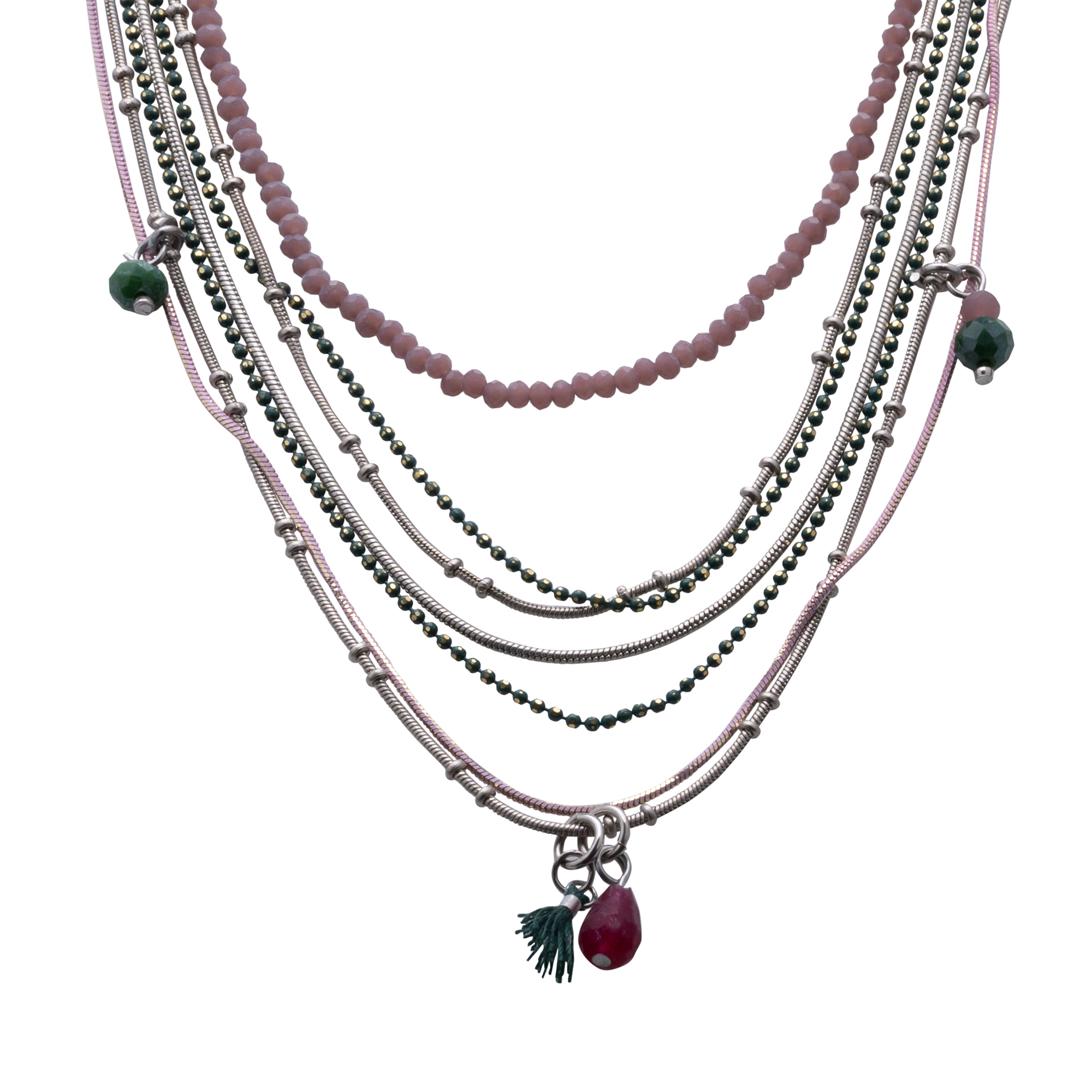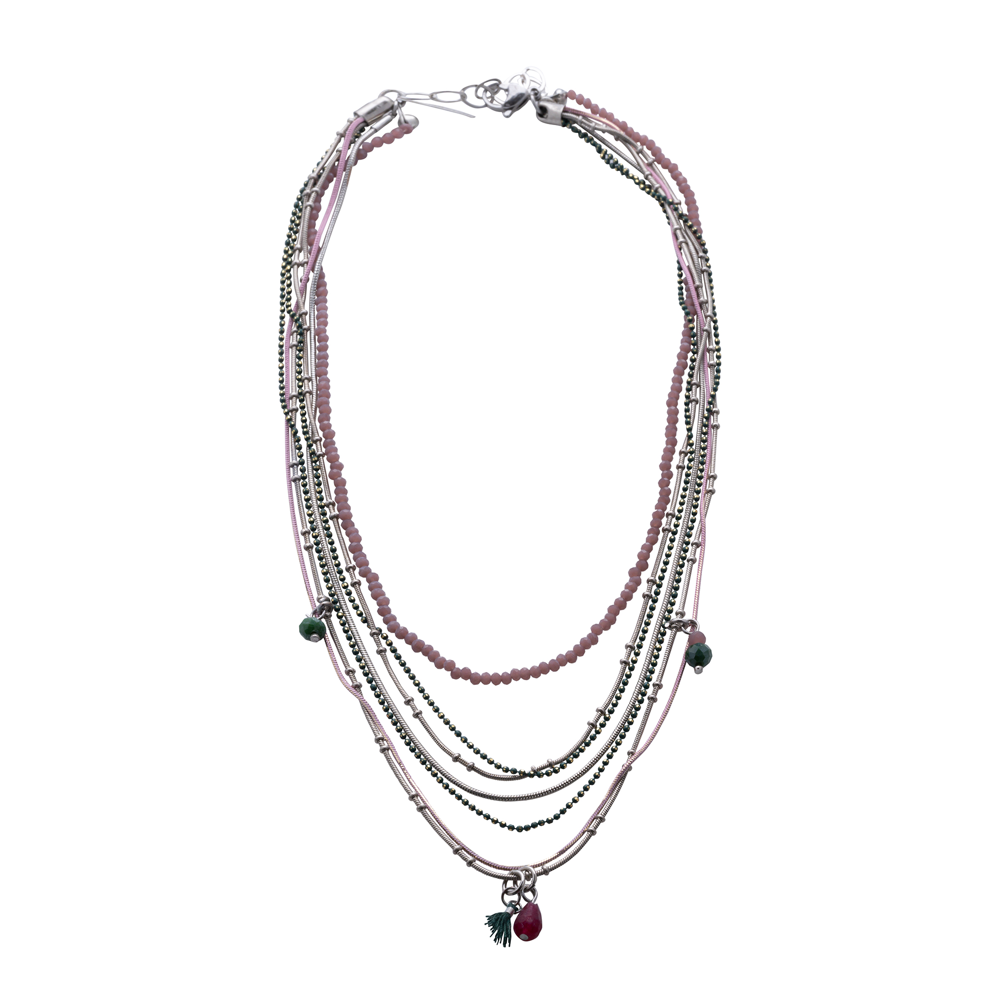 השרשרת עשויה שרשרת קצרה של חרוזי קריסטל (בשחור או באפור ורדרד) יחד עם מגוון שרשראות בשכבות שונות בציפוי כסוף בשילוב שרשראות צבעוניות (לבחירה בשילוב שחור או צבעוני),