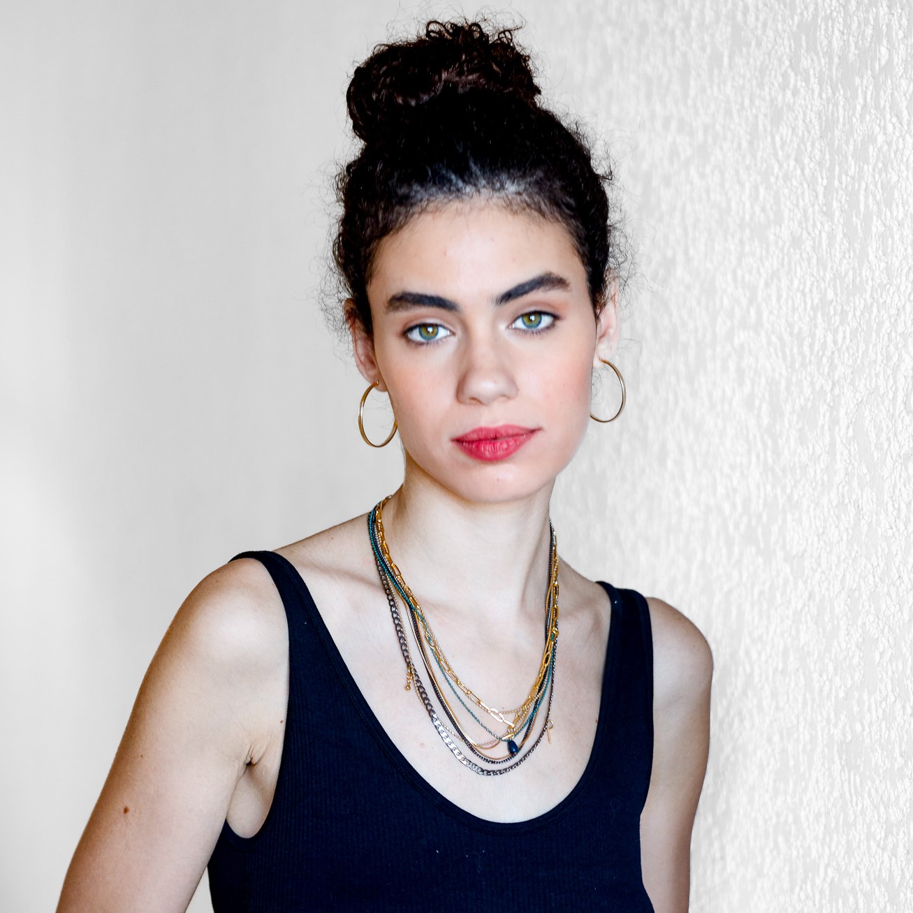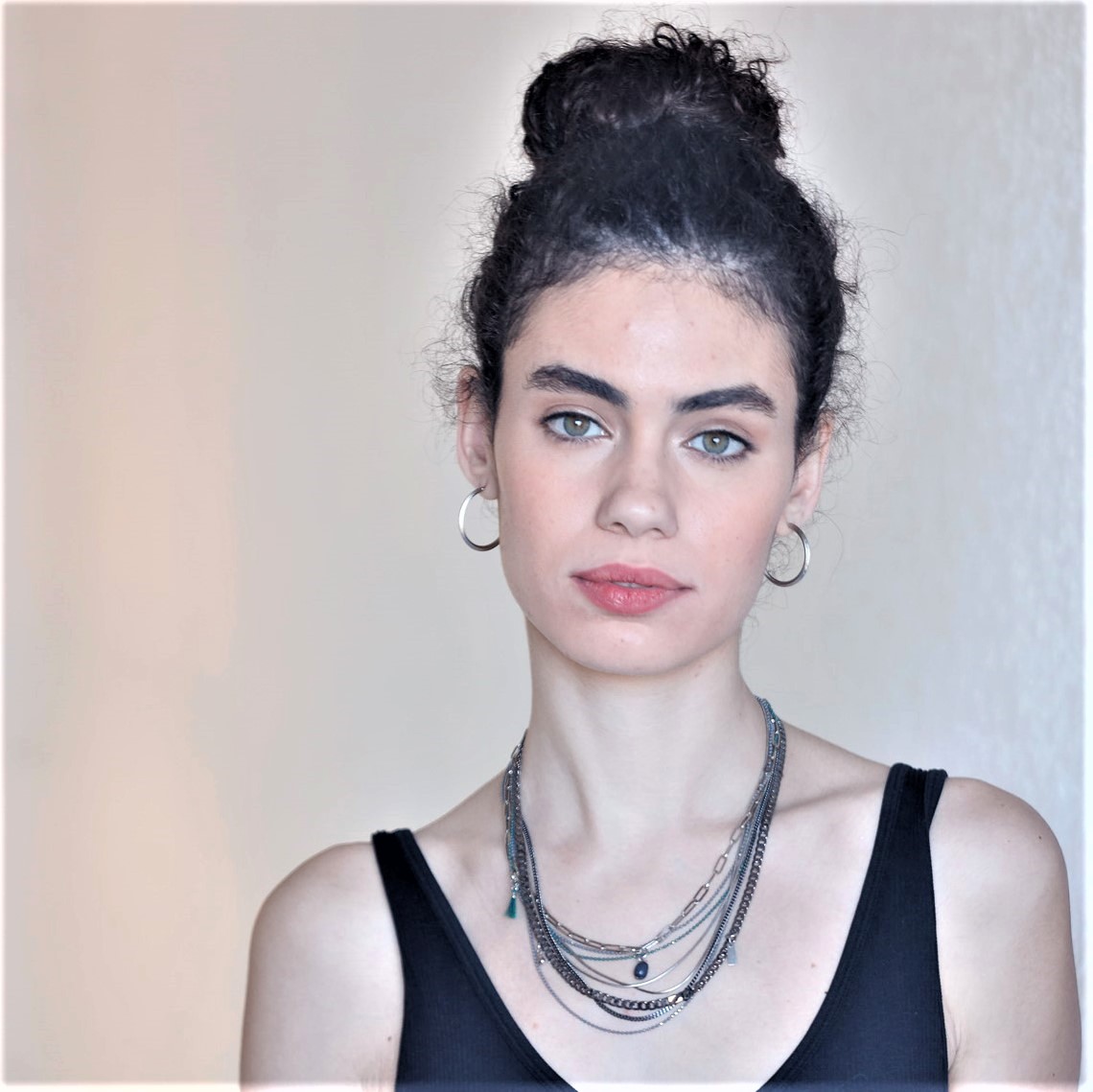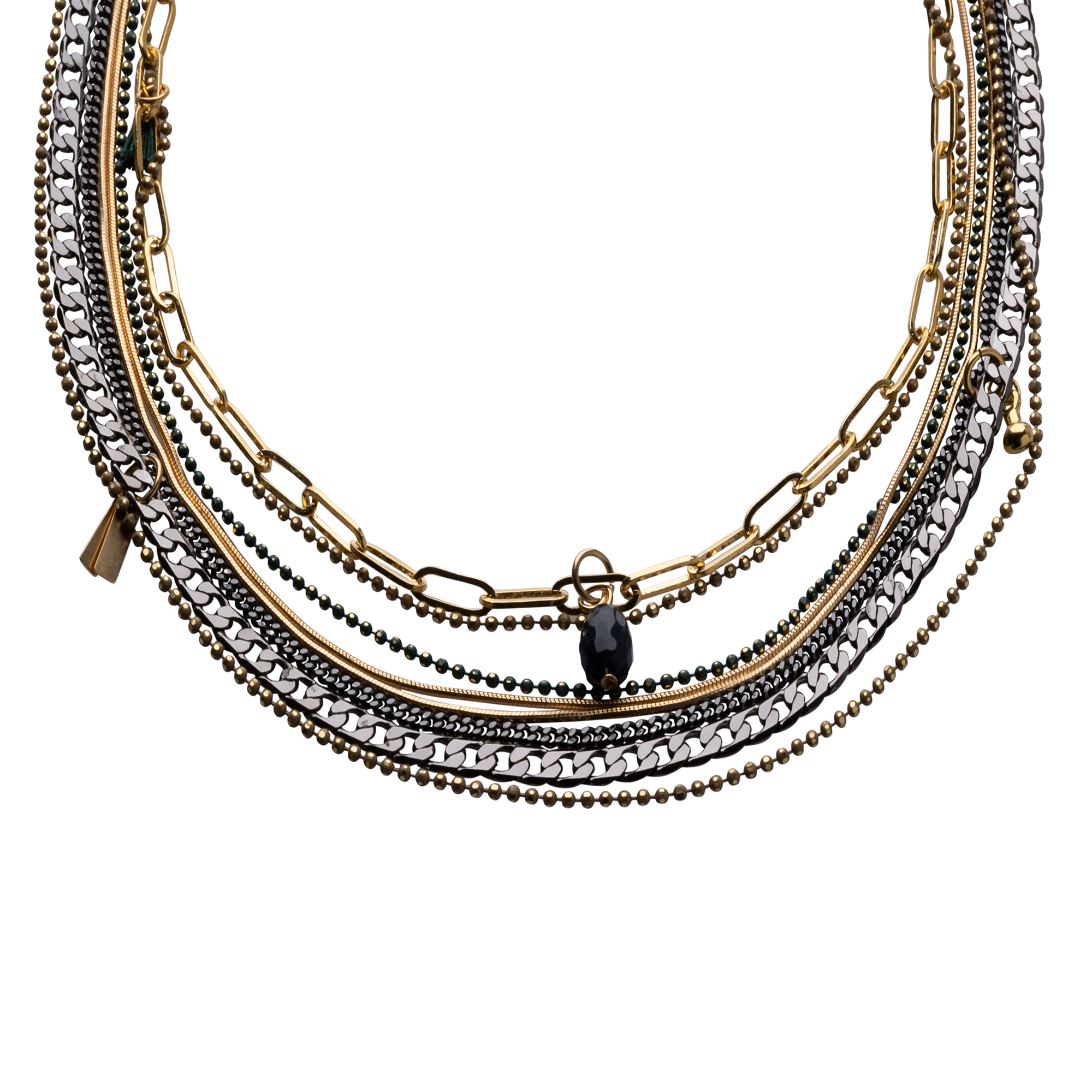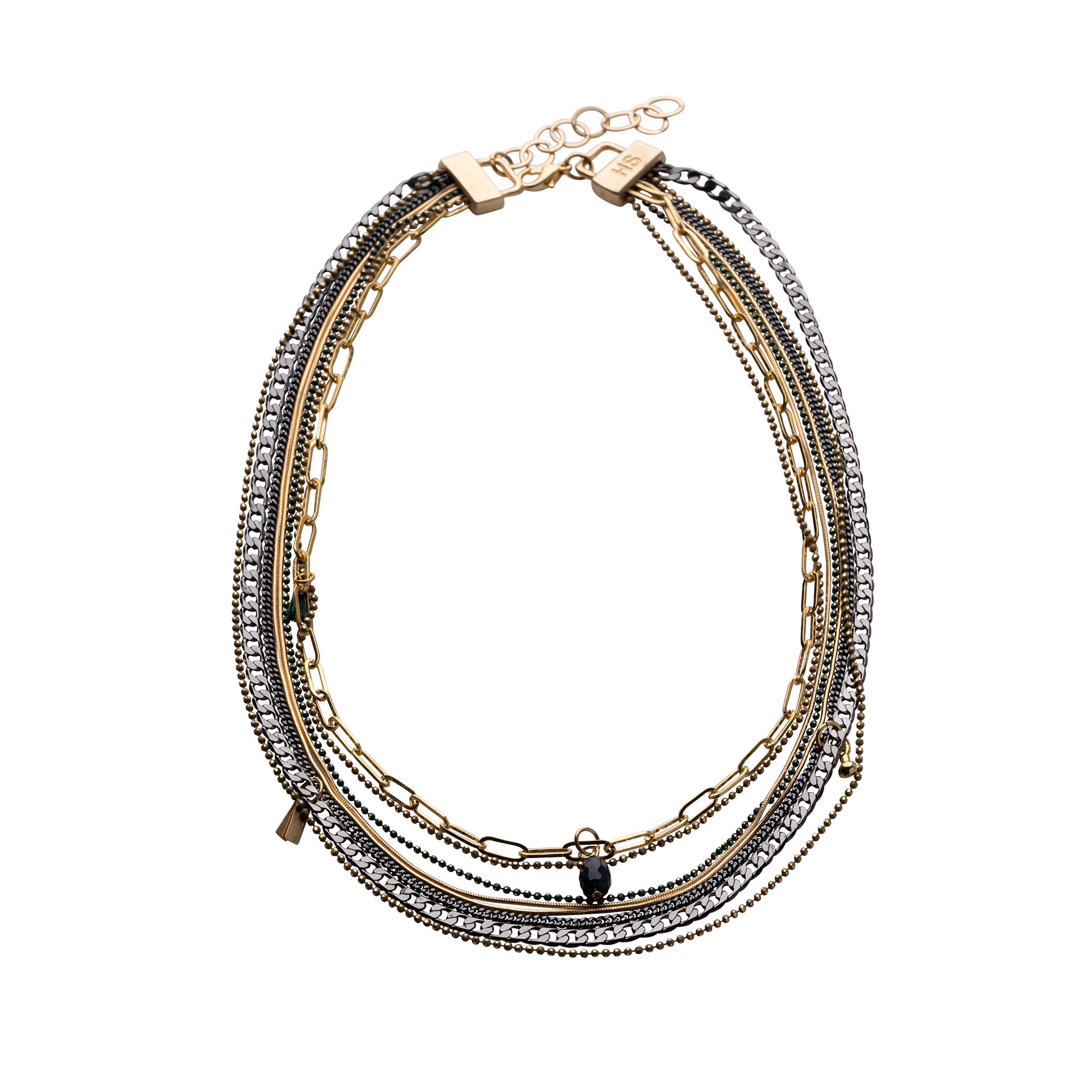 שרשרת מקסימה עשויה המון שכבות של שרשראות מגוונות בציפוי זהב 24 קראט או בציפוי כסוף יחד עם שרשראות שחורות ושרשרת דיסקית עדינה בירוק כהה.