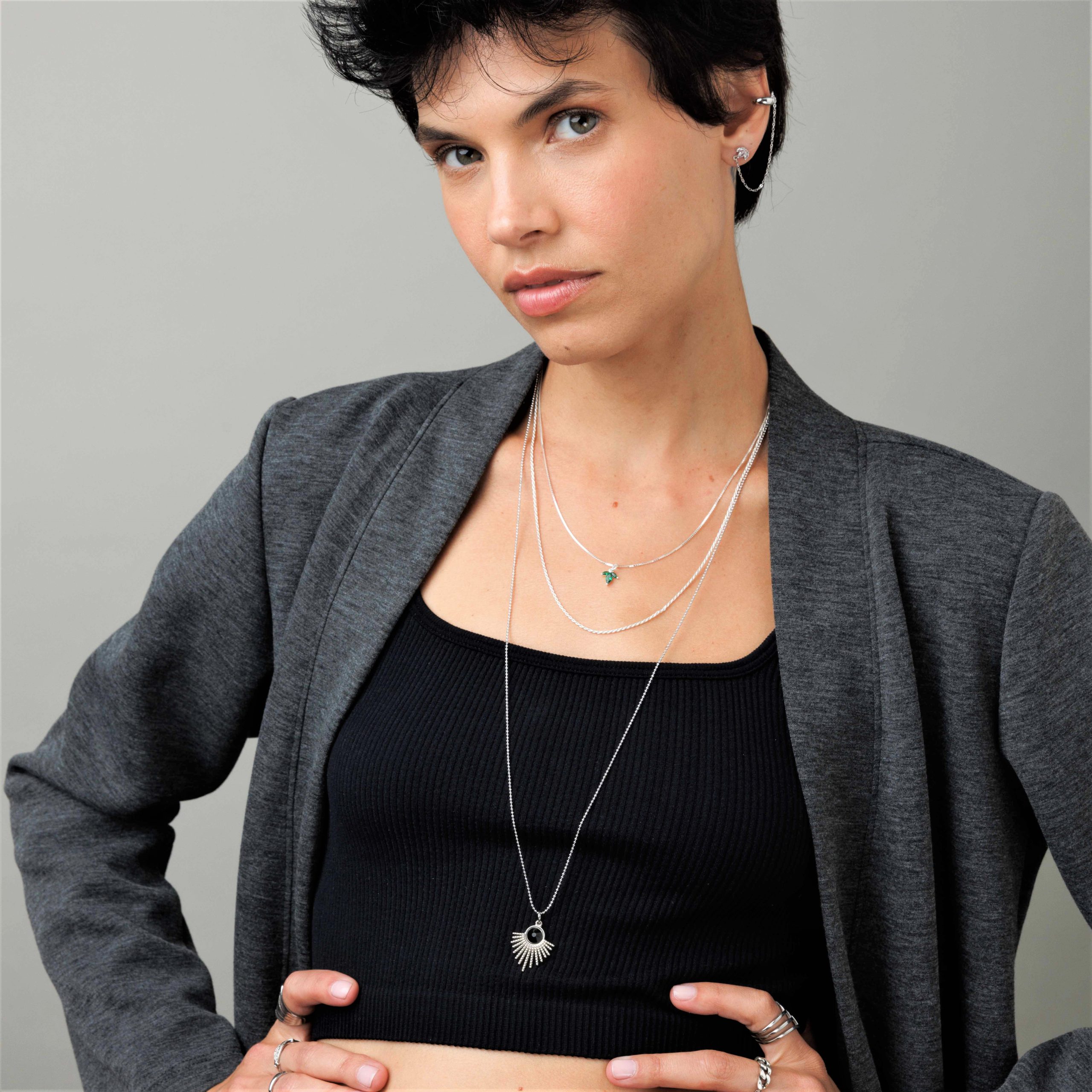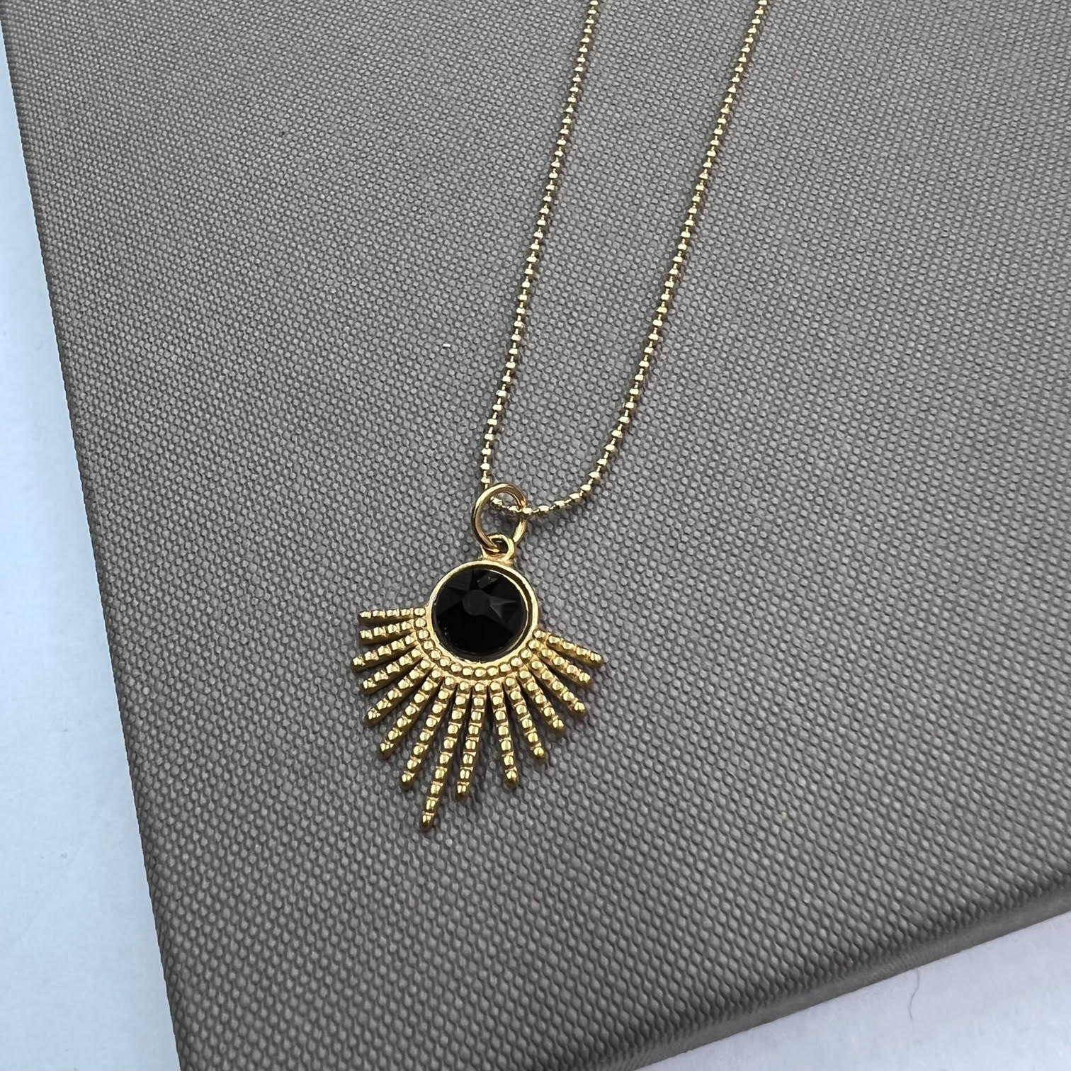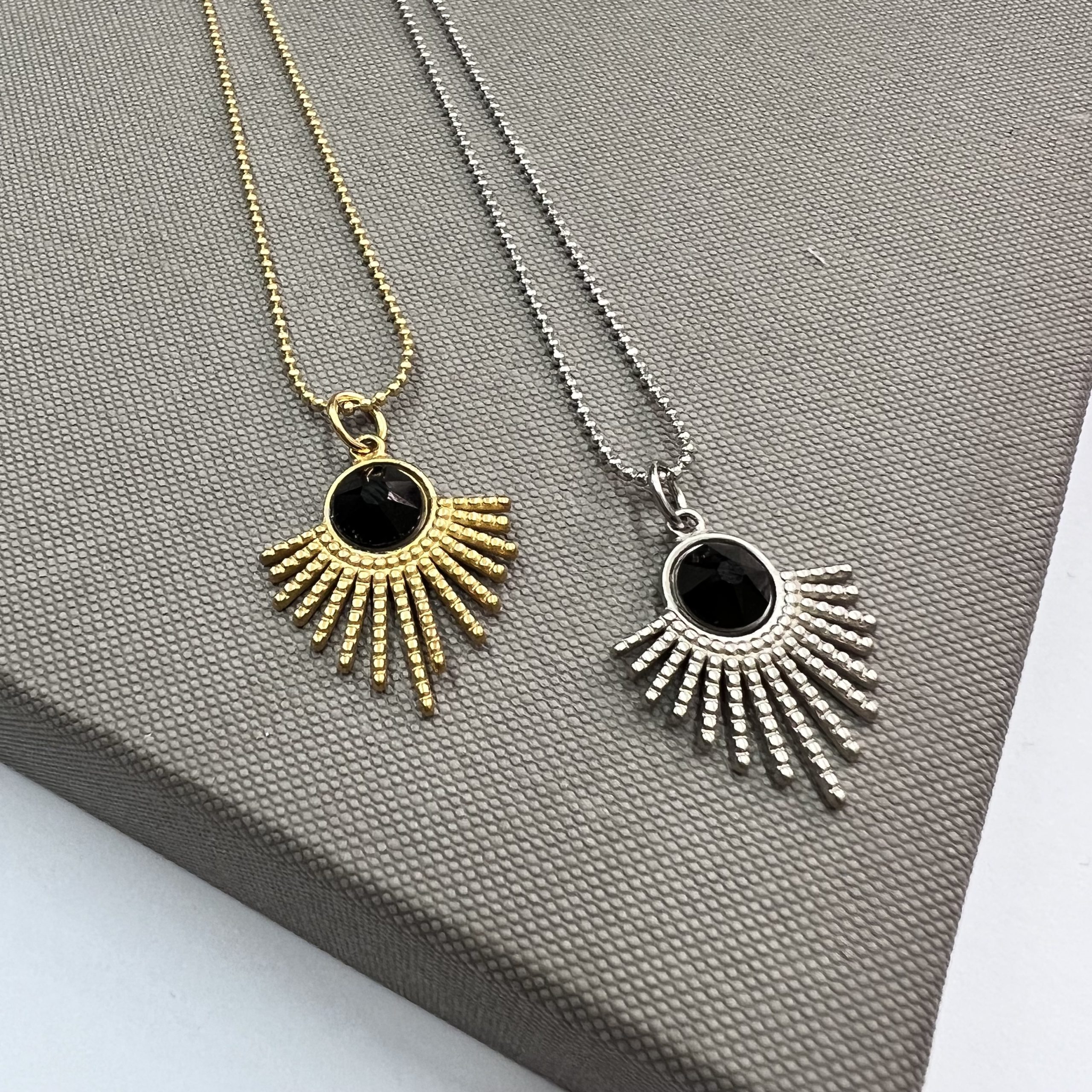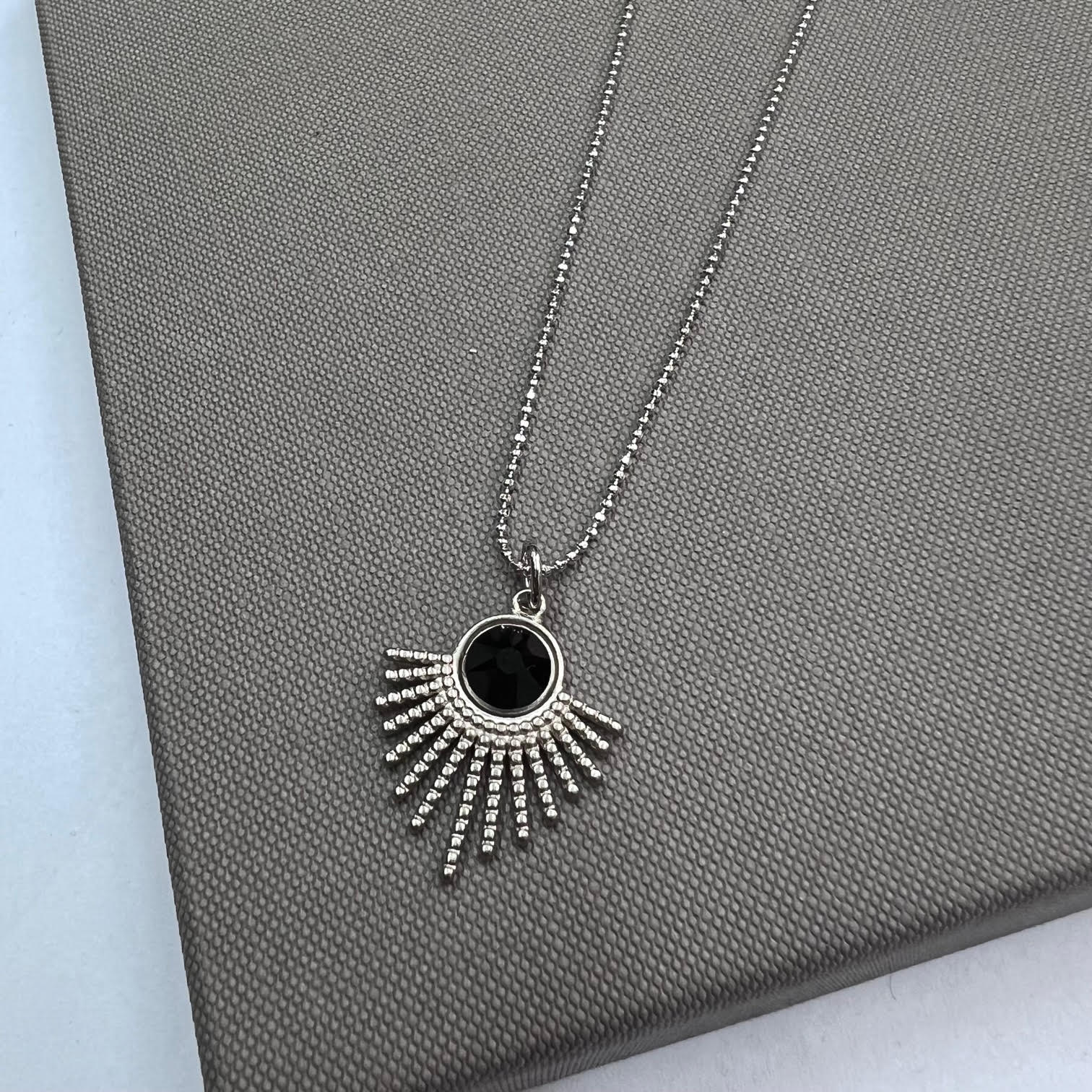 שרשרת סאן כשמה כן היא – אושר בצורת קרני שמש עם אבן חן שחורה במרכז.