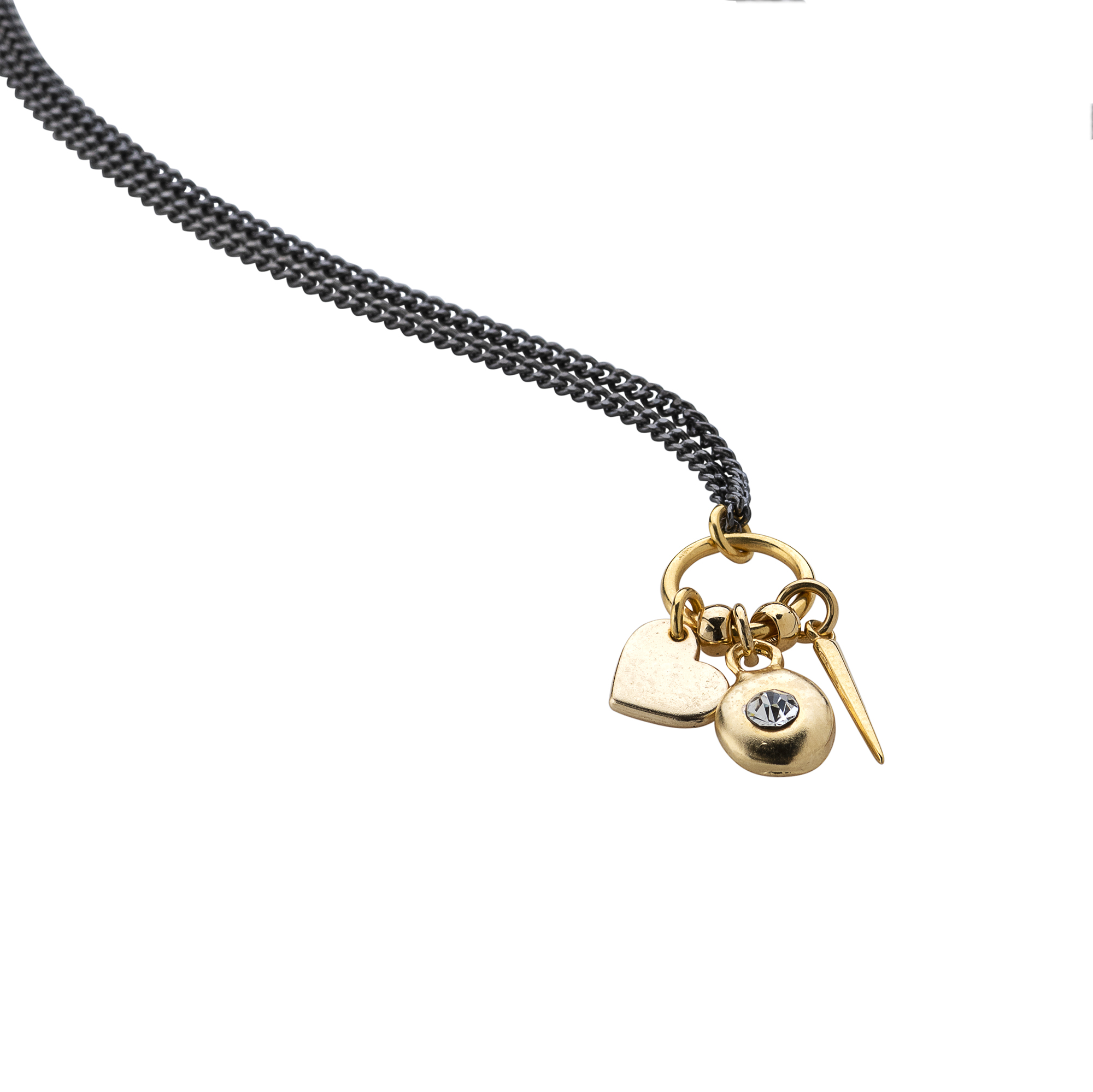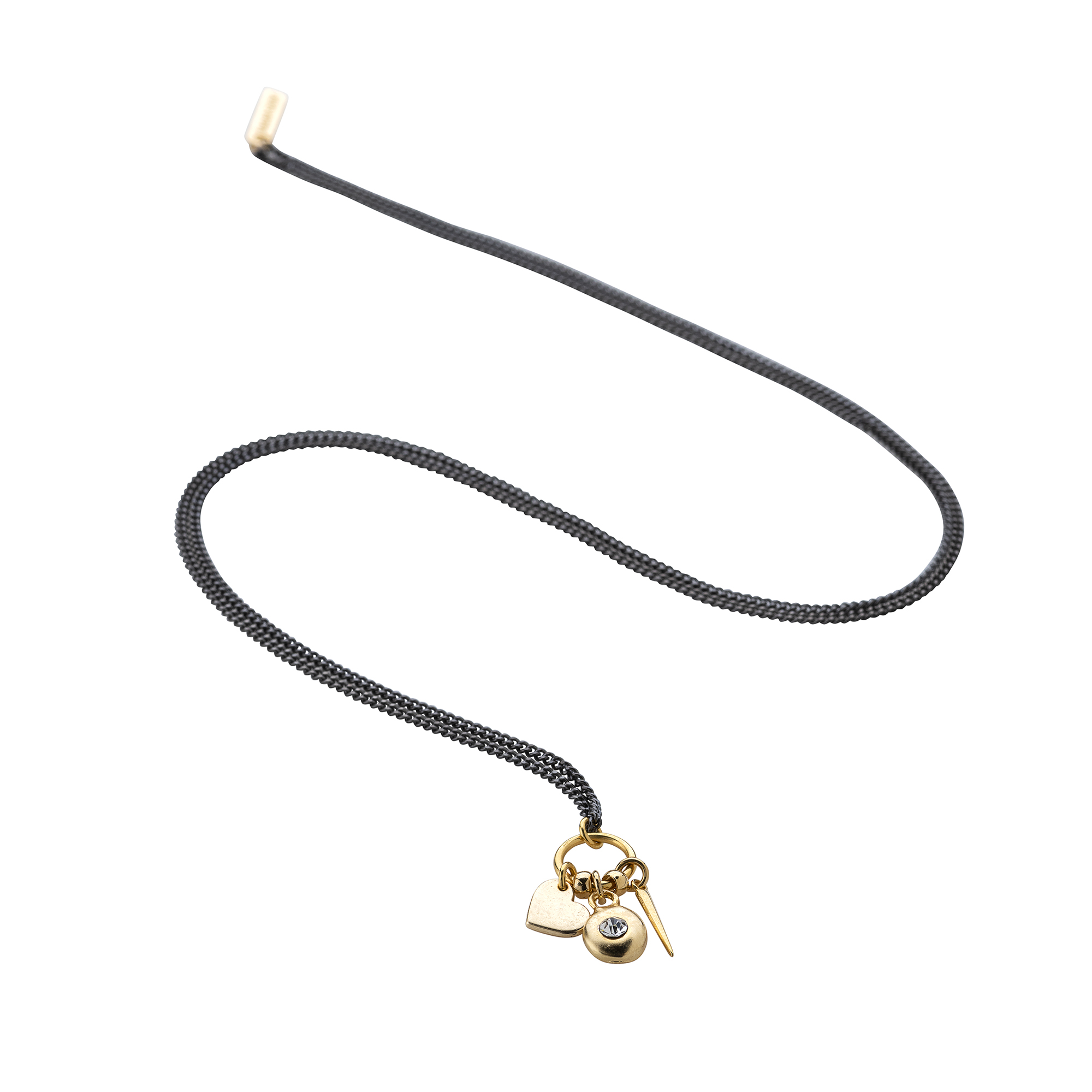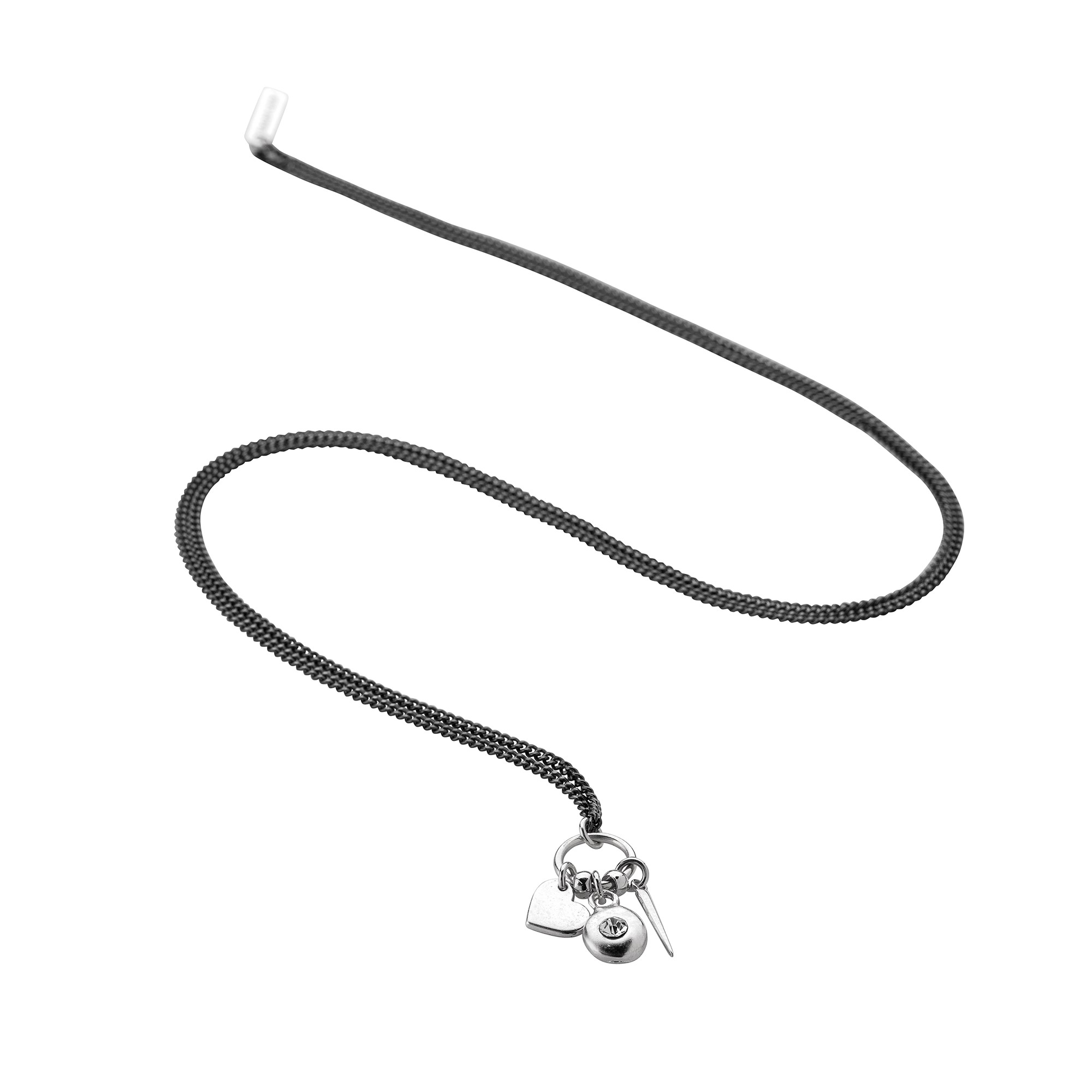 השרשרת מגיעה בצבע שחור עם שלושה צ’ארמים: שפיץ עדין, לב, ועיגול עם אבן קריסטל בציפוי זהב 24 קראט או בציפוי כסוף.