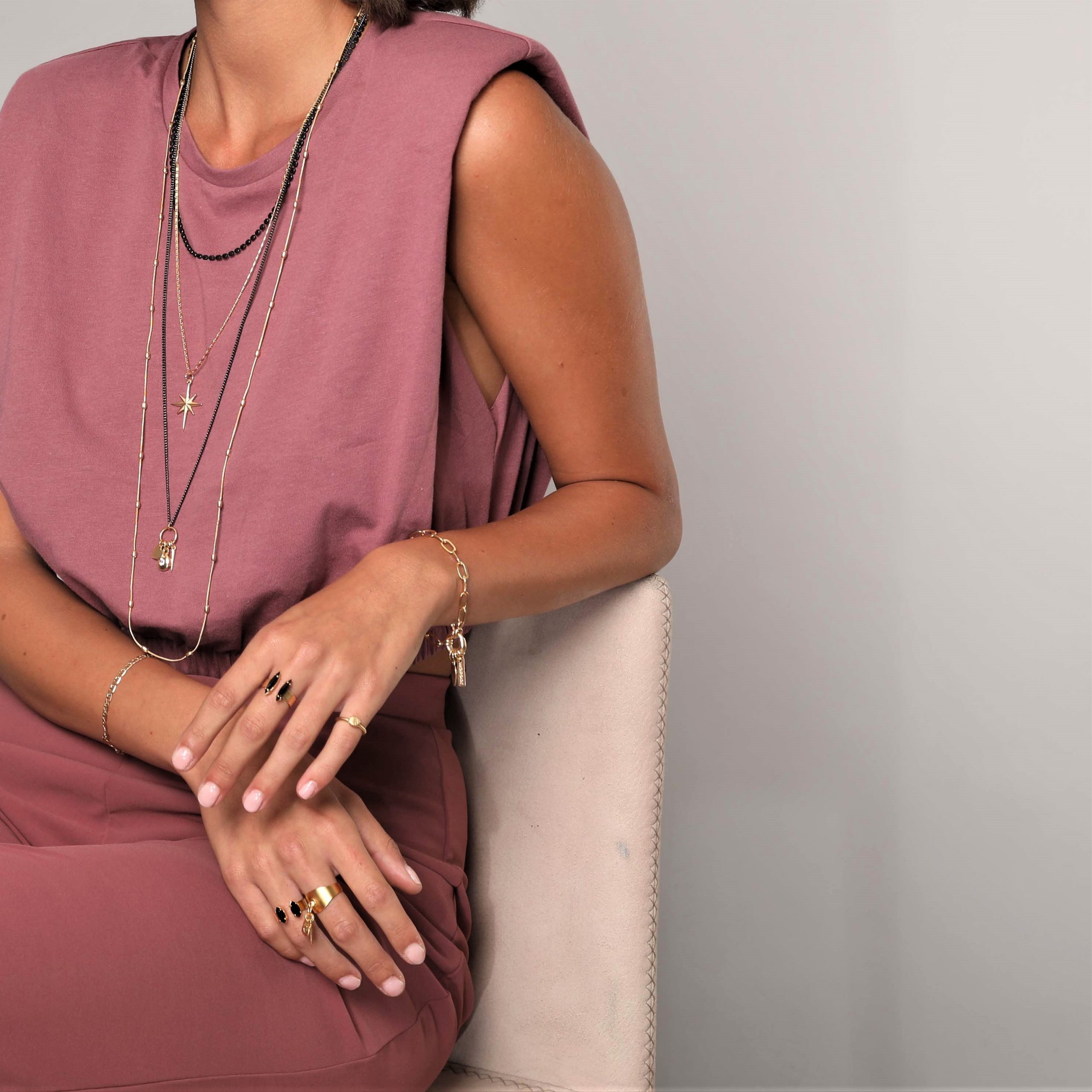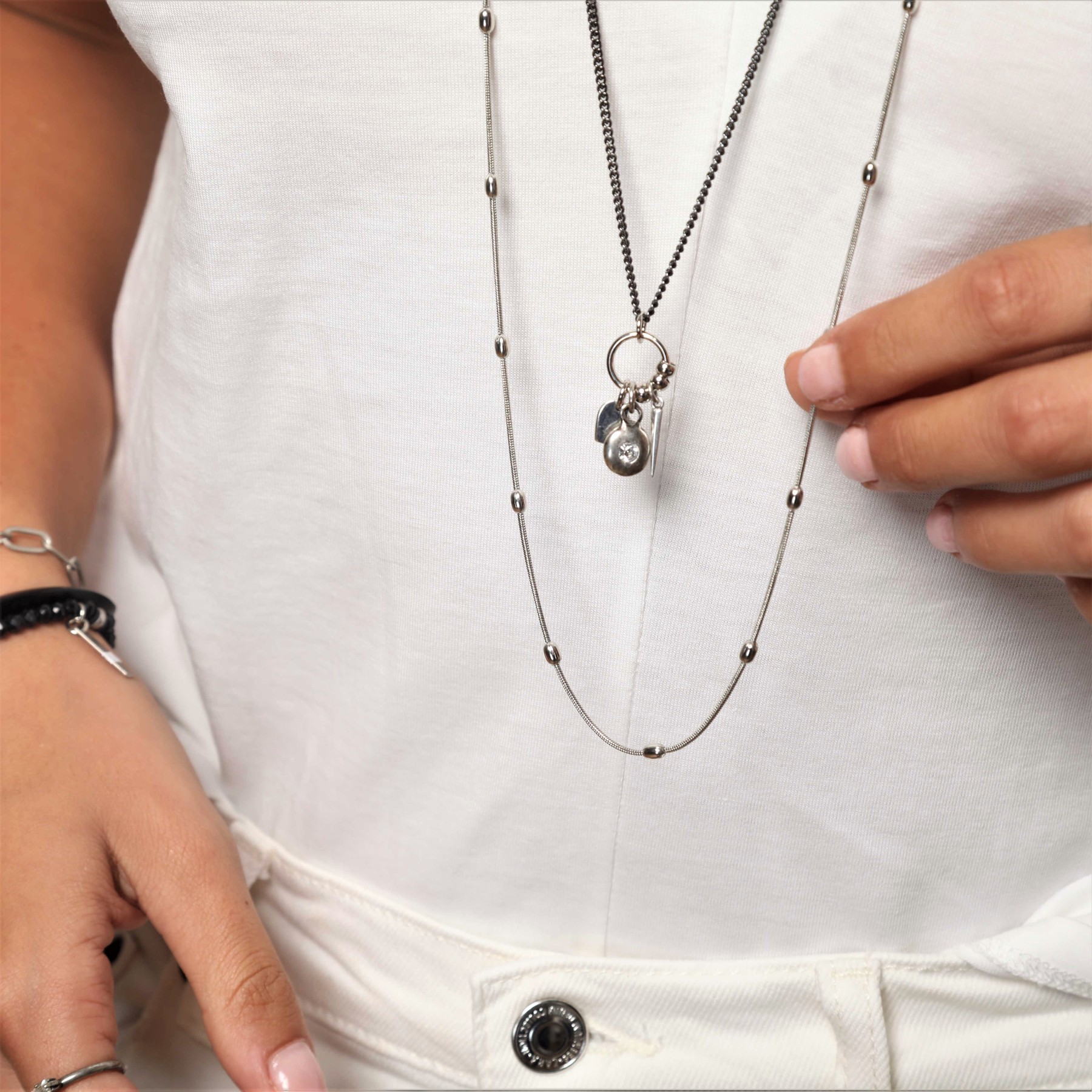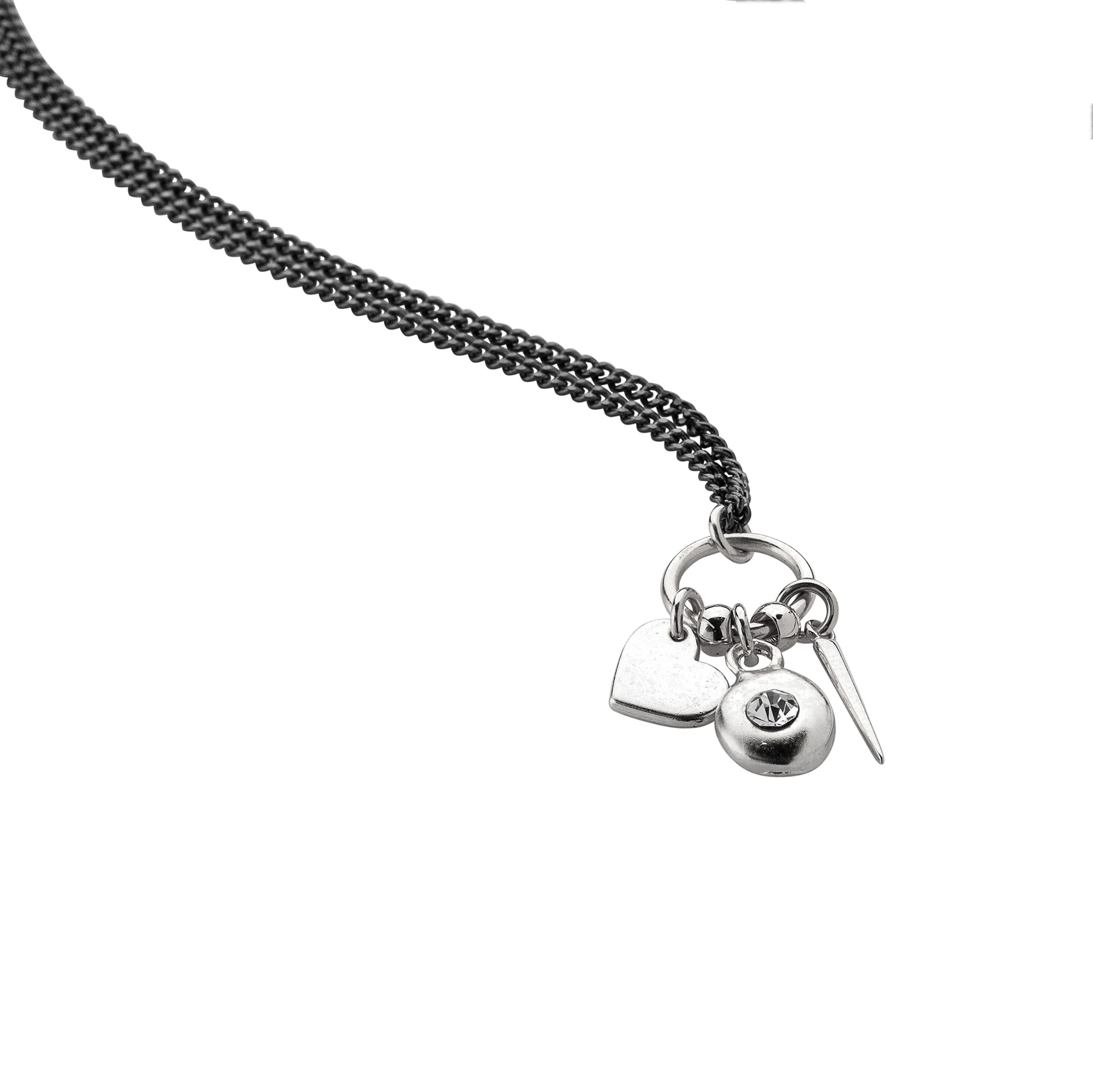 השרשרת מגיעה בצבע שחור עם שלושה צ’ארמים: שפיץ עדין, לב, ועיגול עם אבן קריסטל בציפוי זהב 24 קראט או בציפוי כסוף.