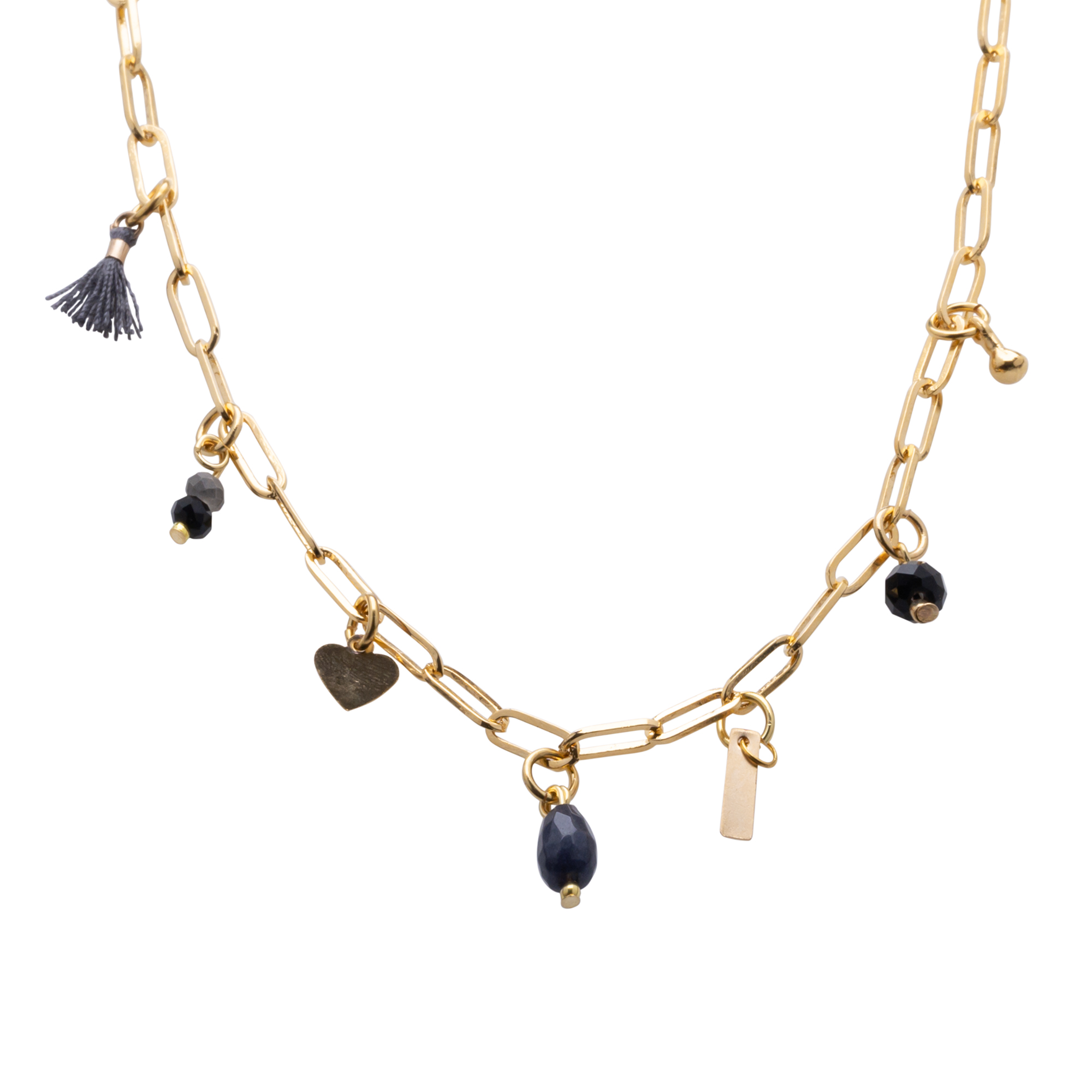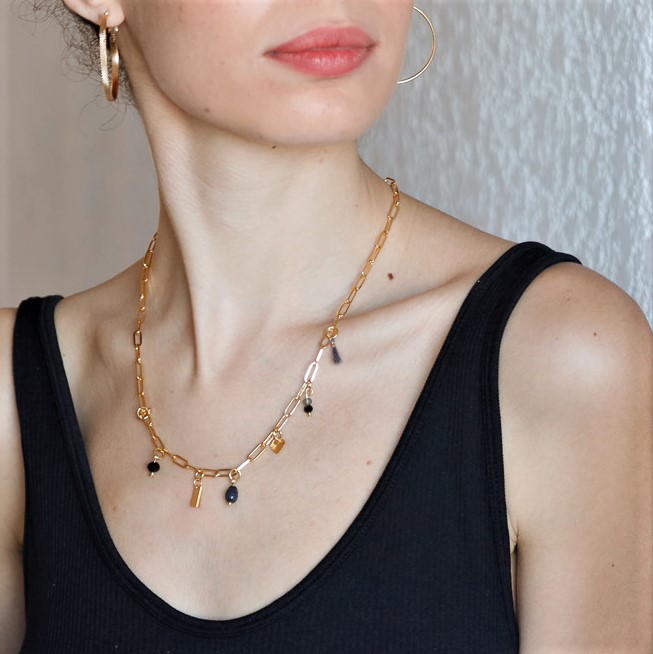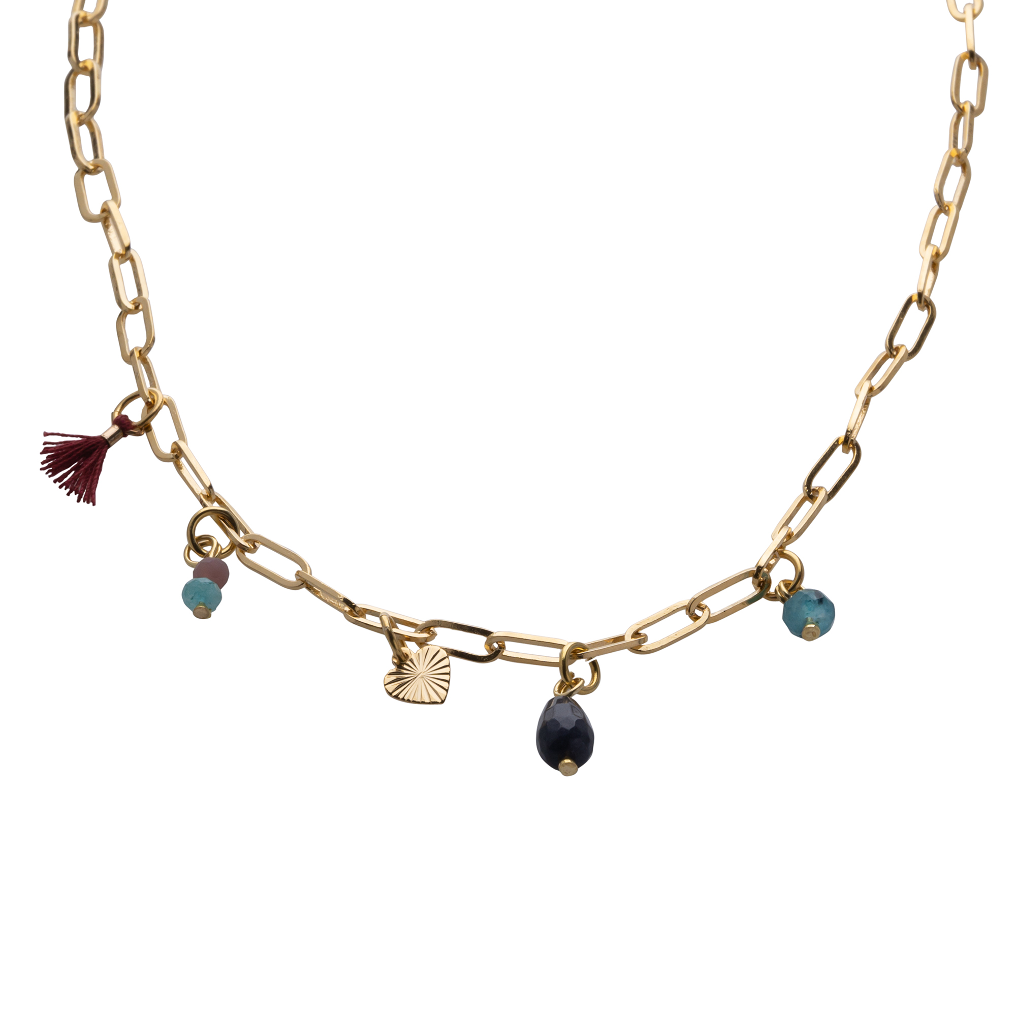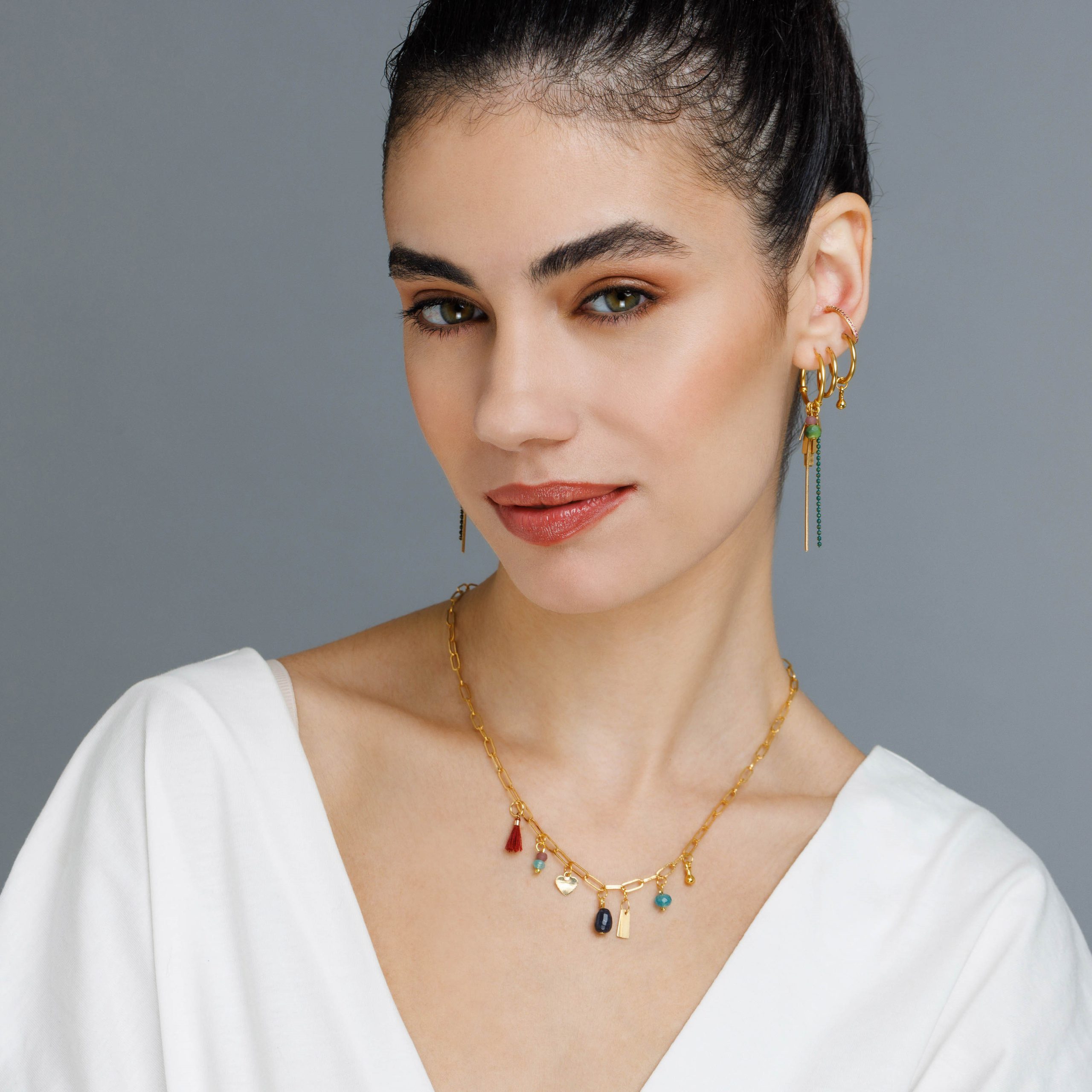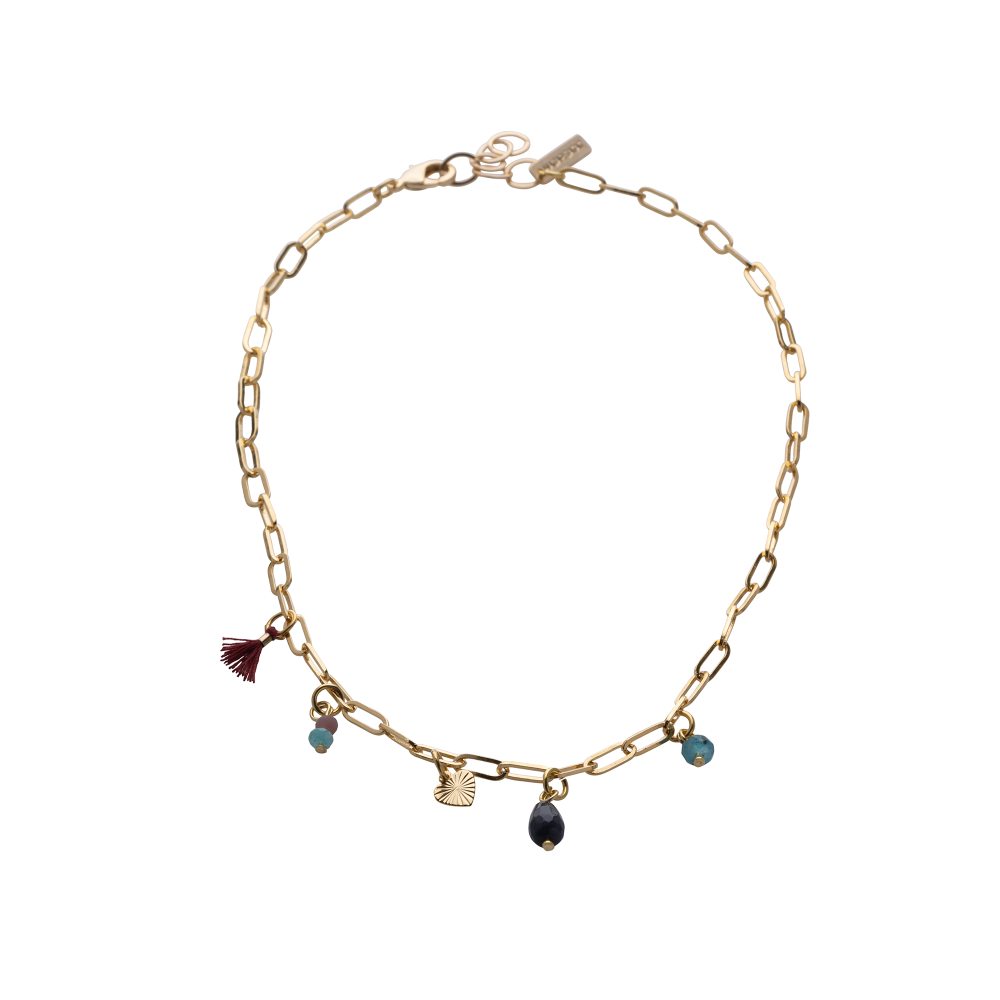שרשרת מקסימה עשויה שרשרת חוליות עדינה בציפוי זהב 24 קראט עם מגוון של תליונים מחוברים :  גדיל, אבני חן, קריסטלים ועוד..