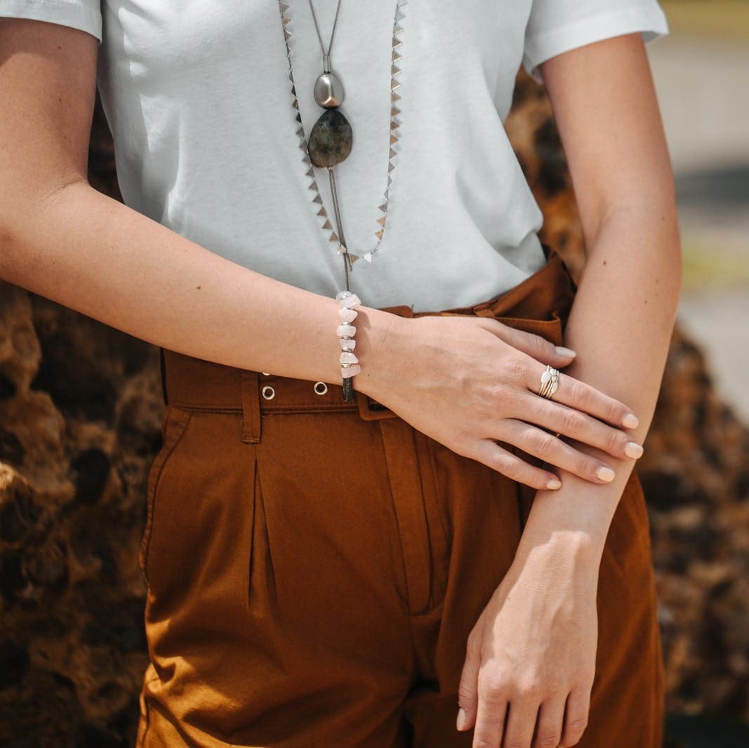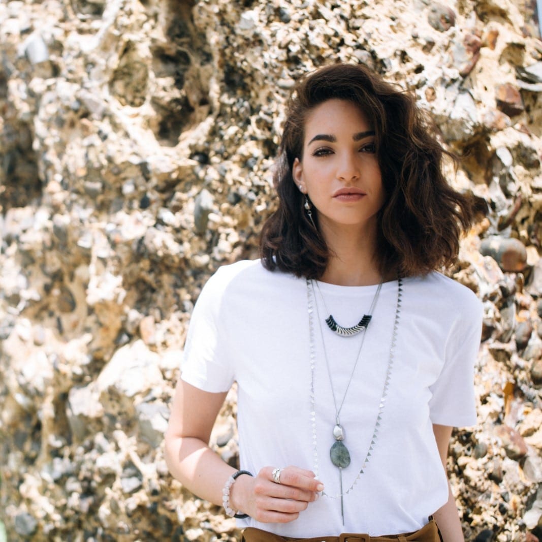 אבן חן מסוג אוניקס (השחורה) או לברדורייט (האפורה) משולבות עם חרוז אמורפי בציפוי כסוף בגוון מט, תלויים על שרשרת מחט עדינה.