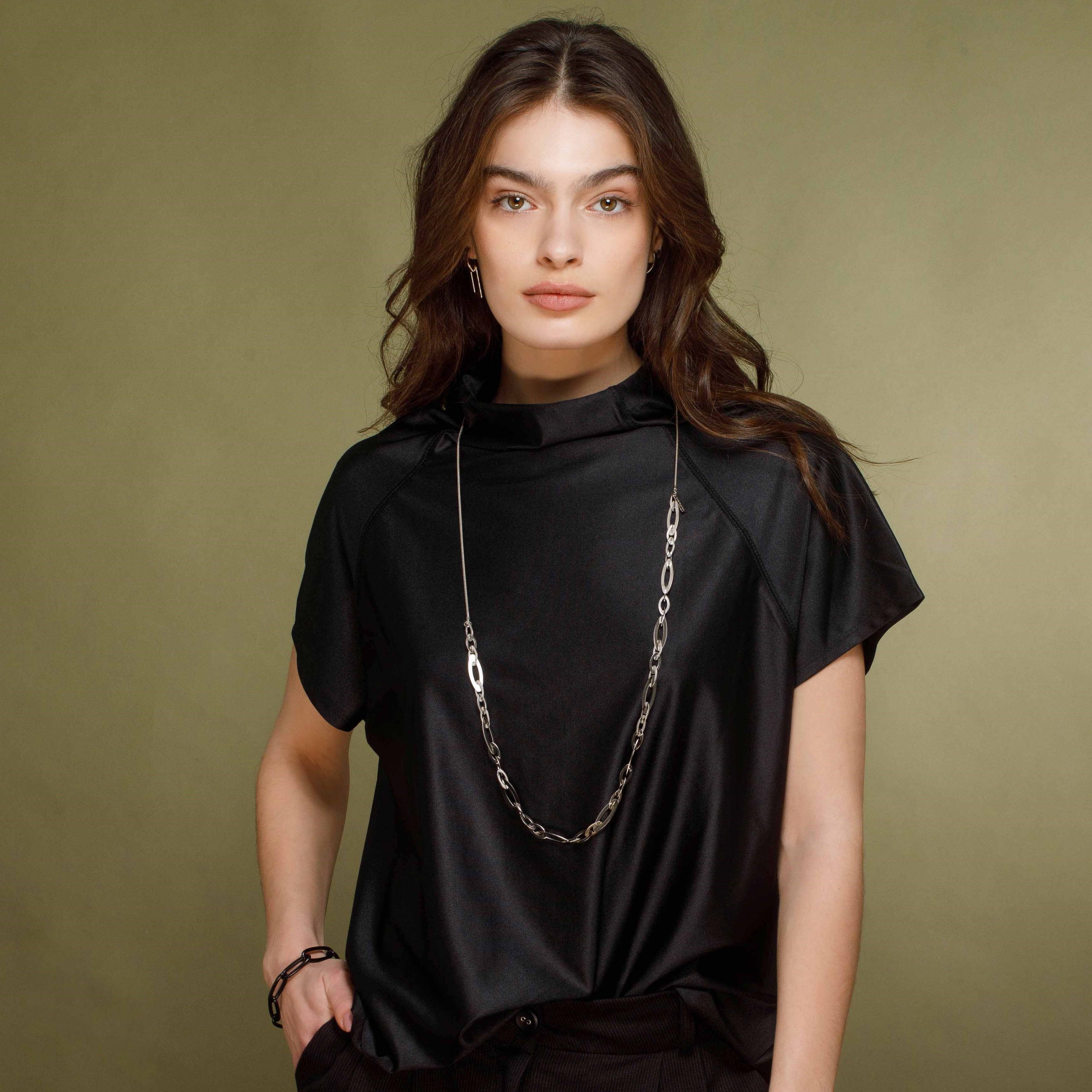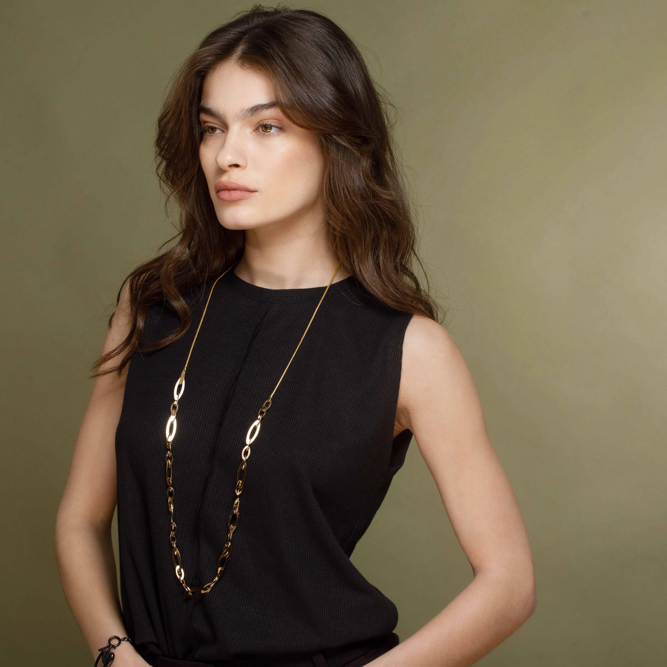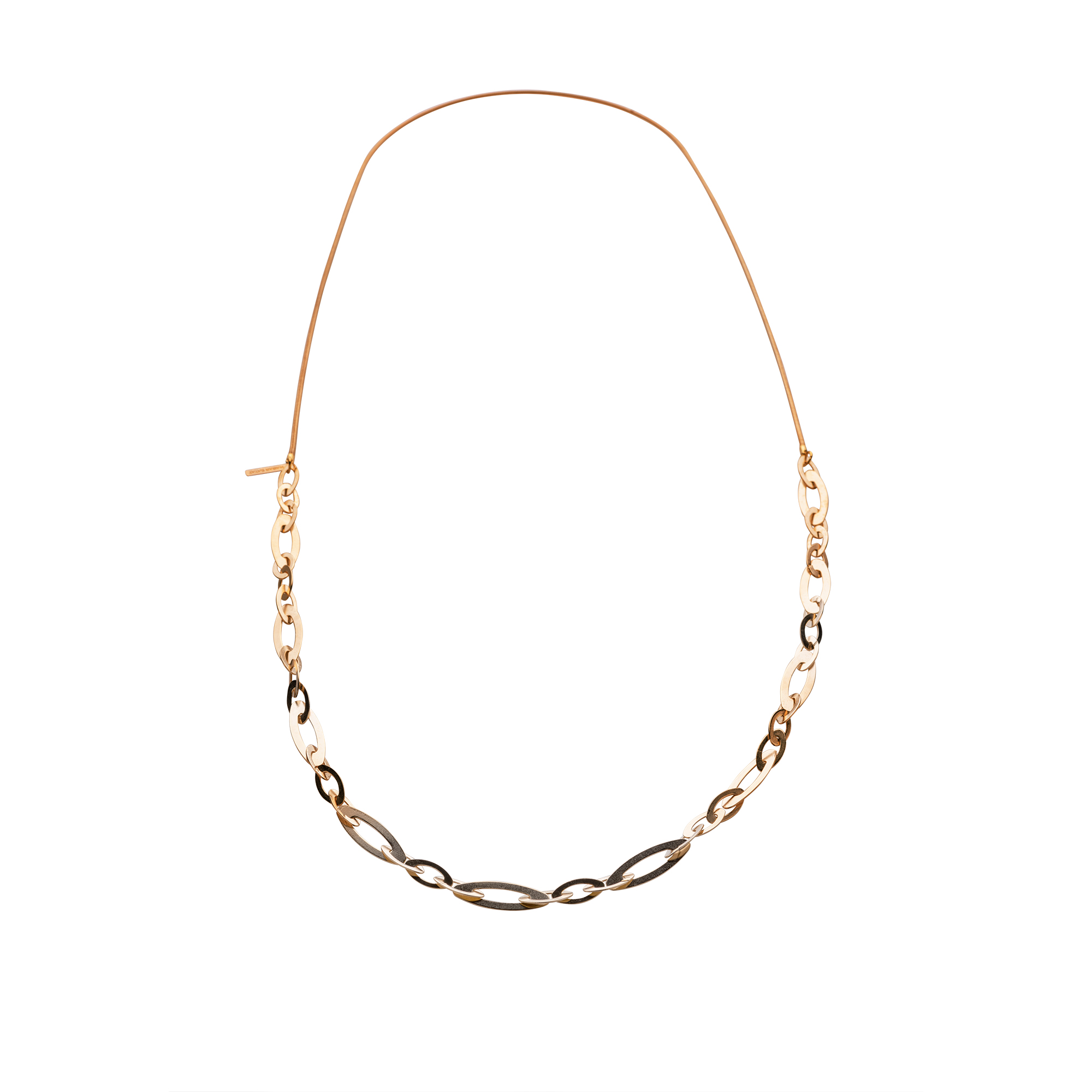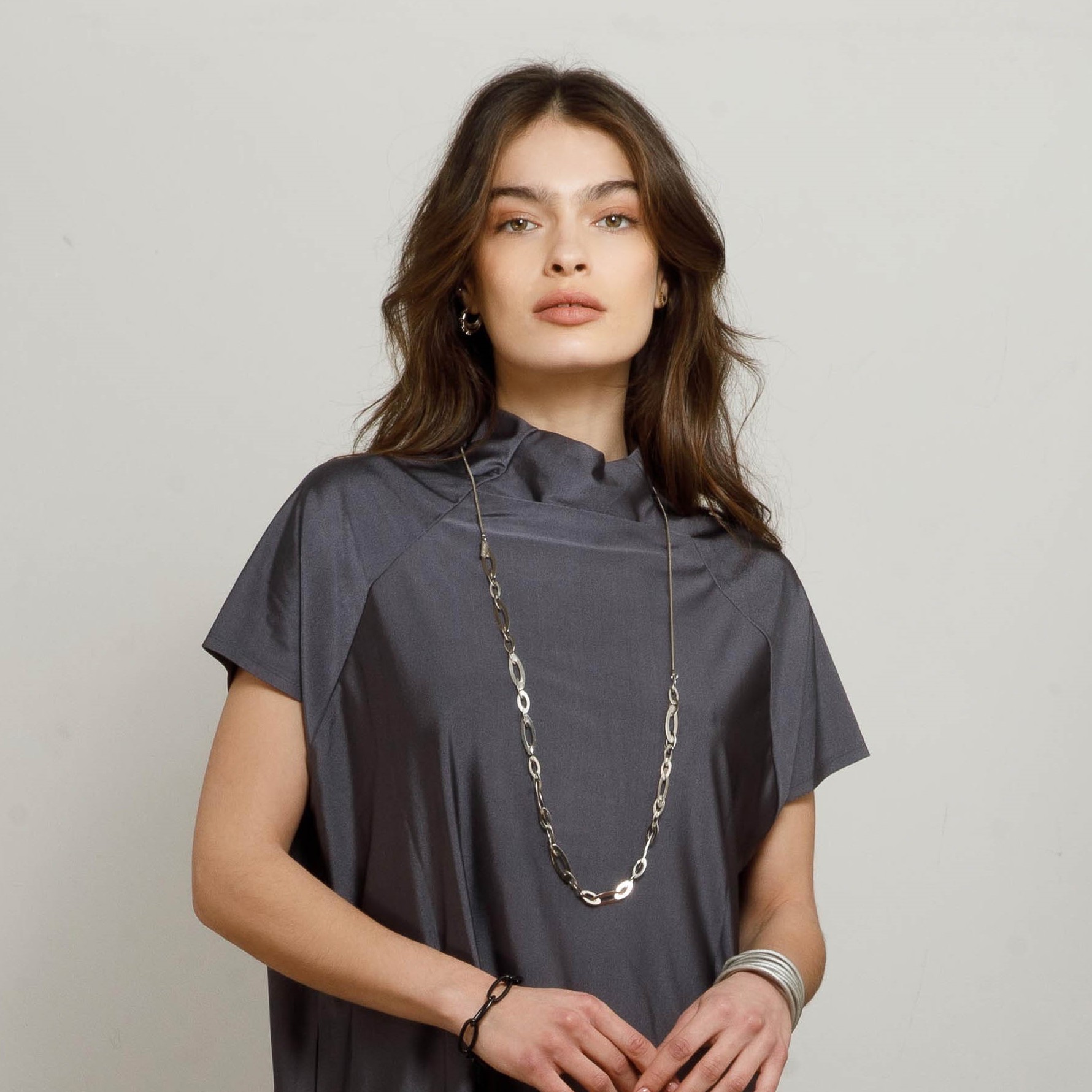 השרשרת עשויה שרשרת חוליות עבה מיוחדת בציפוי זהב 24 קראט או בציפוי כסף בגוון מט משולבות עם שרשרת עדינה באותו ציפוי.