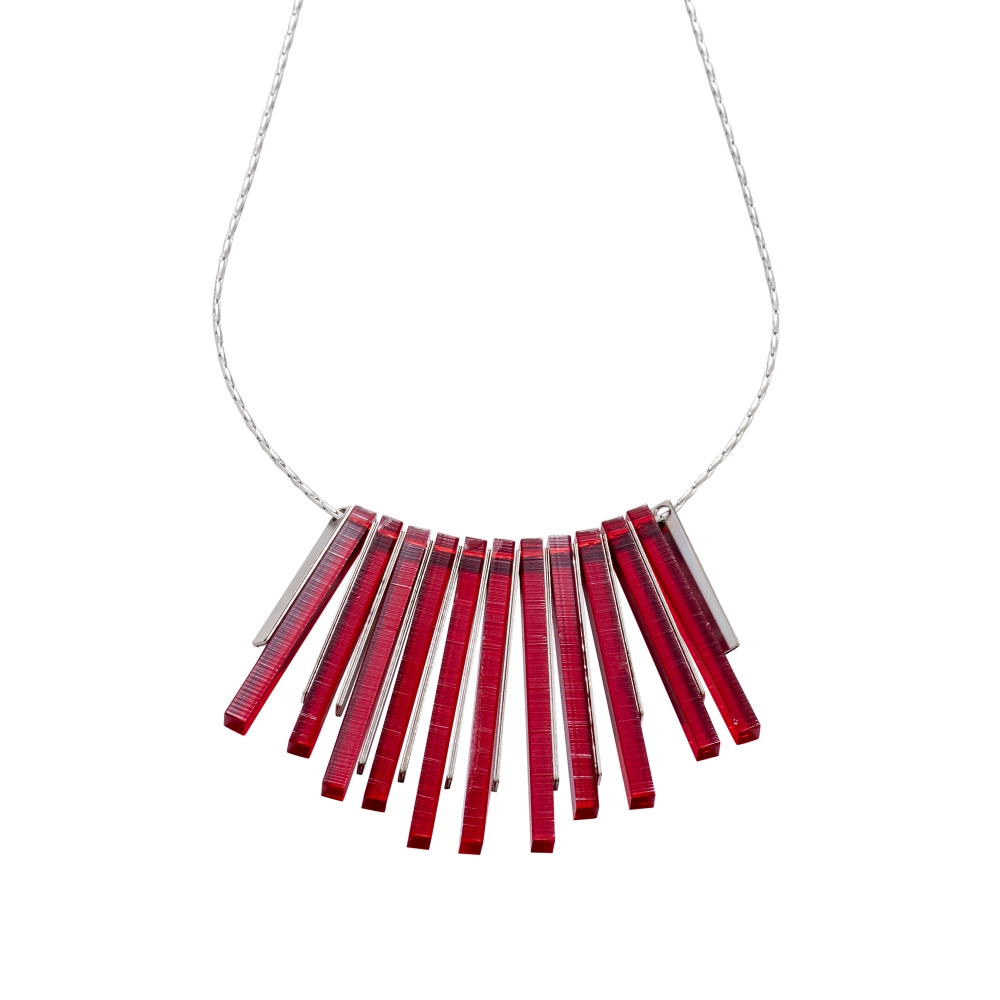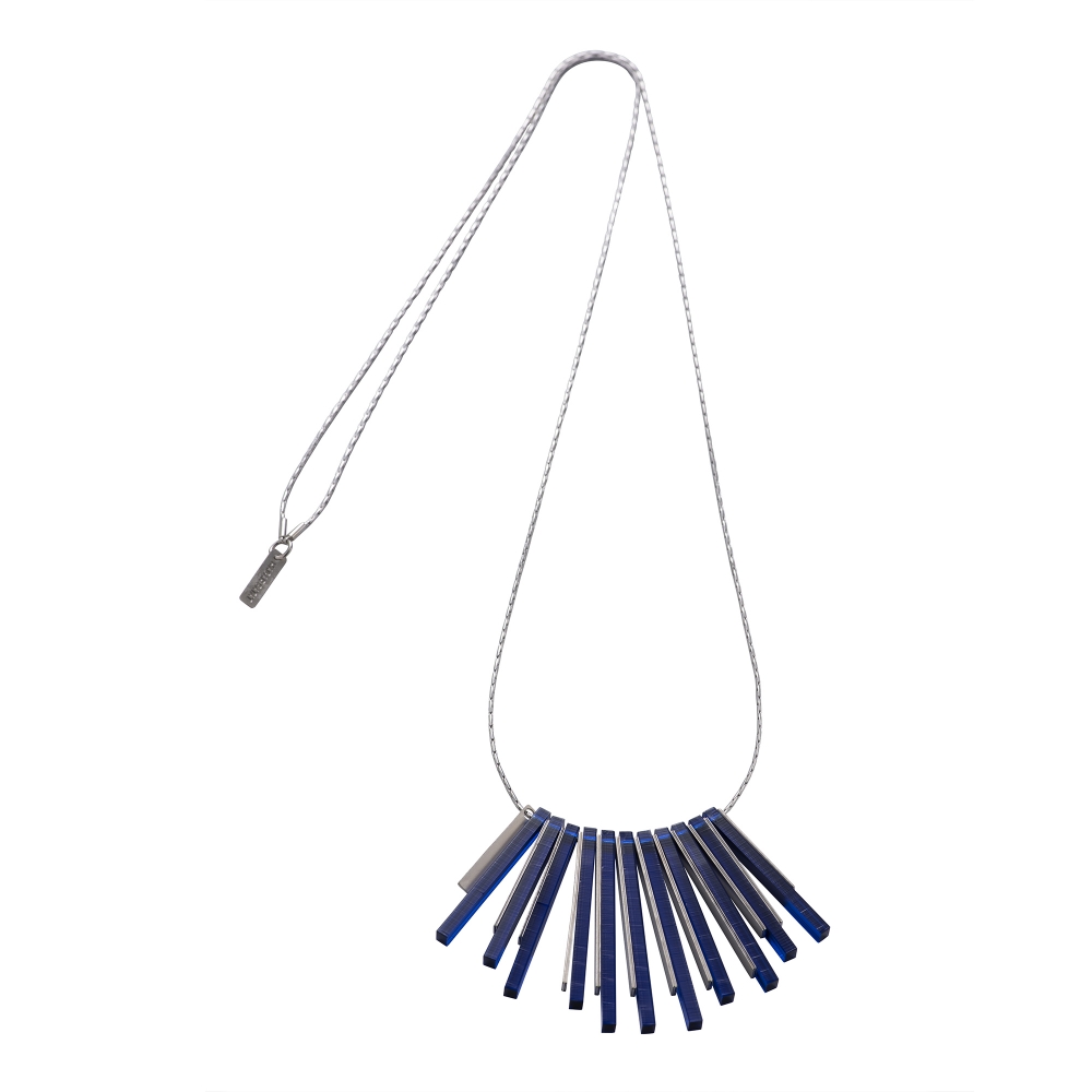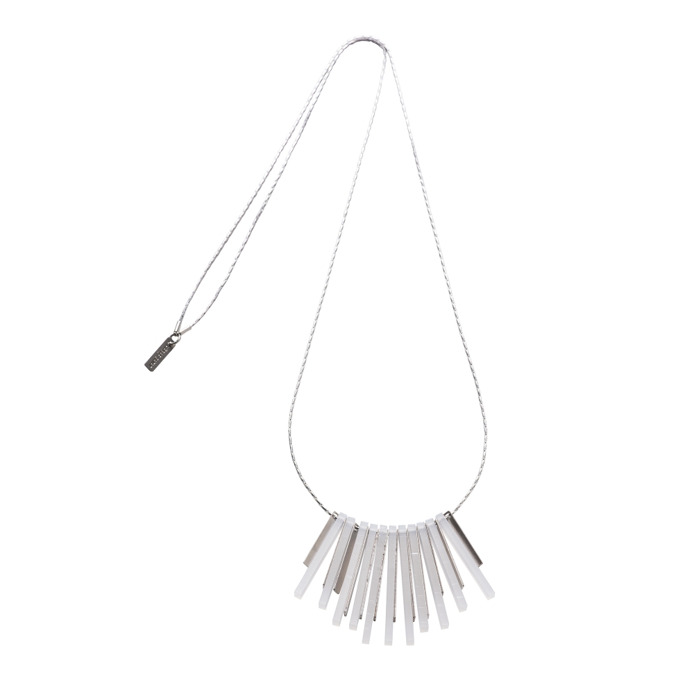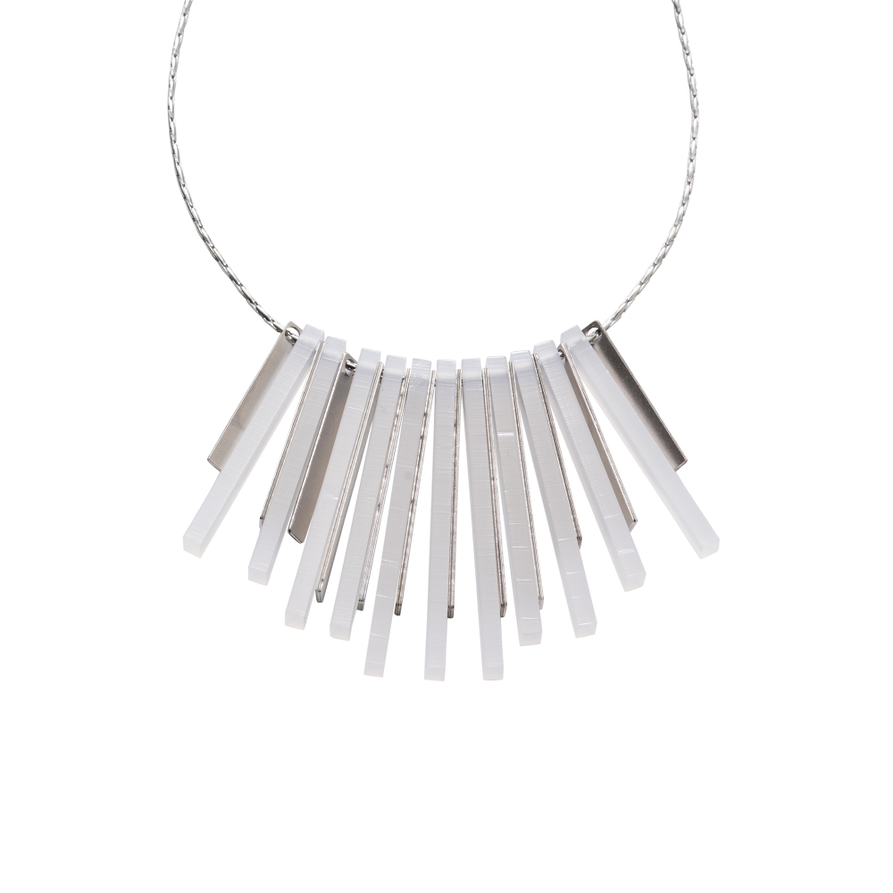 פסי מתכת באורכים שונים מצופים כסף בגוון מט משולבים עם מלבנים עשויים אקריליק צבעוני ומושחלים על שרשרת עדינה.