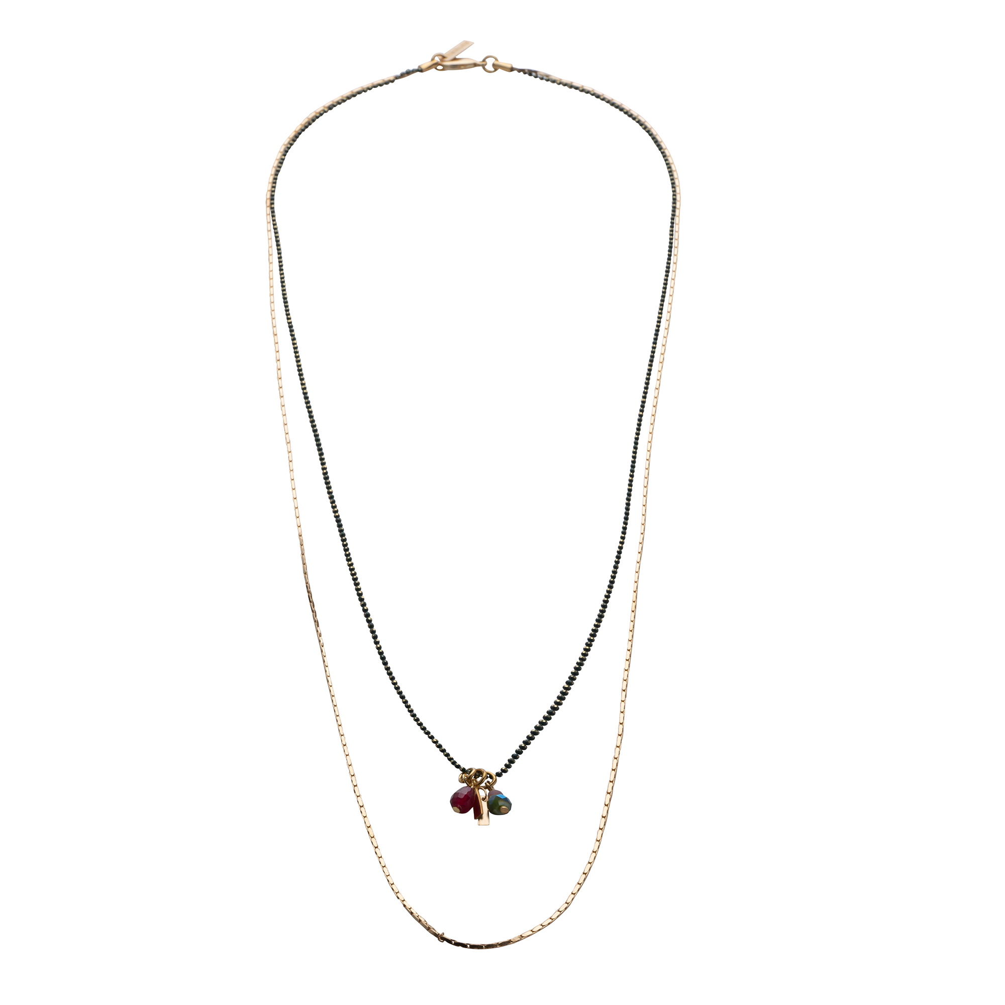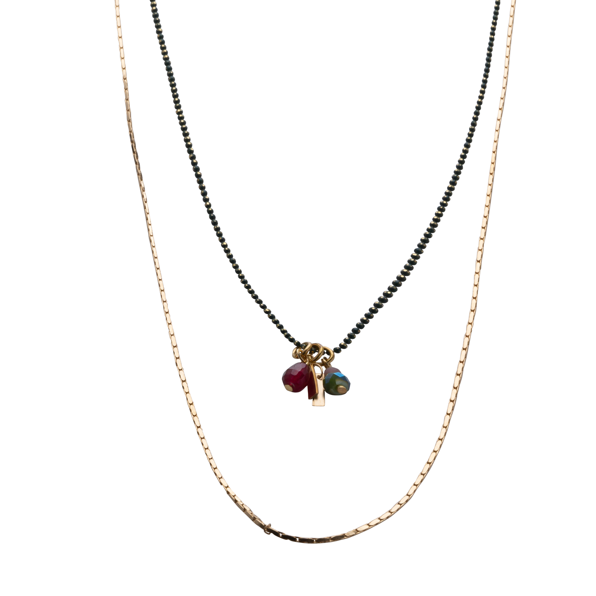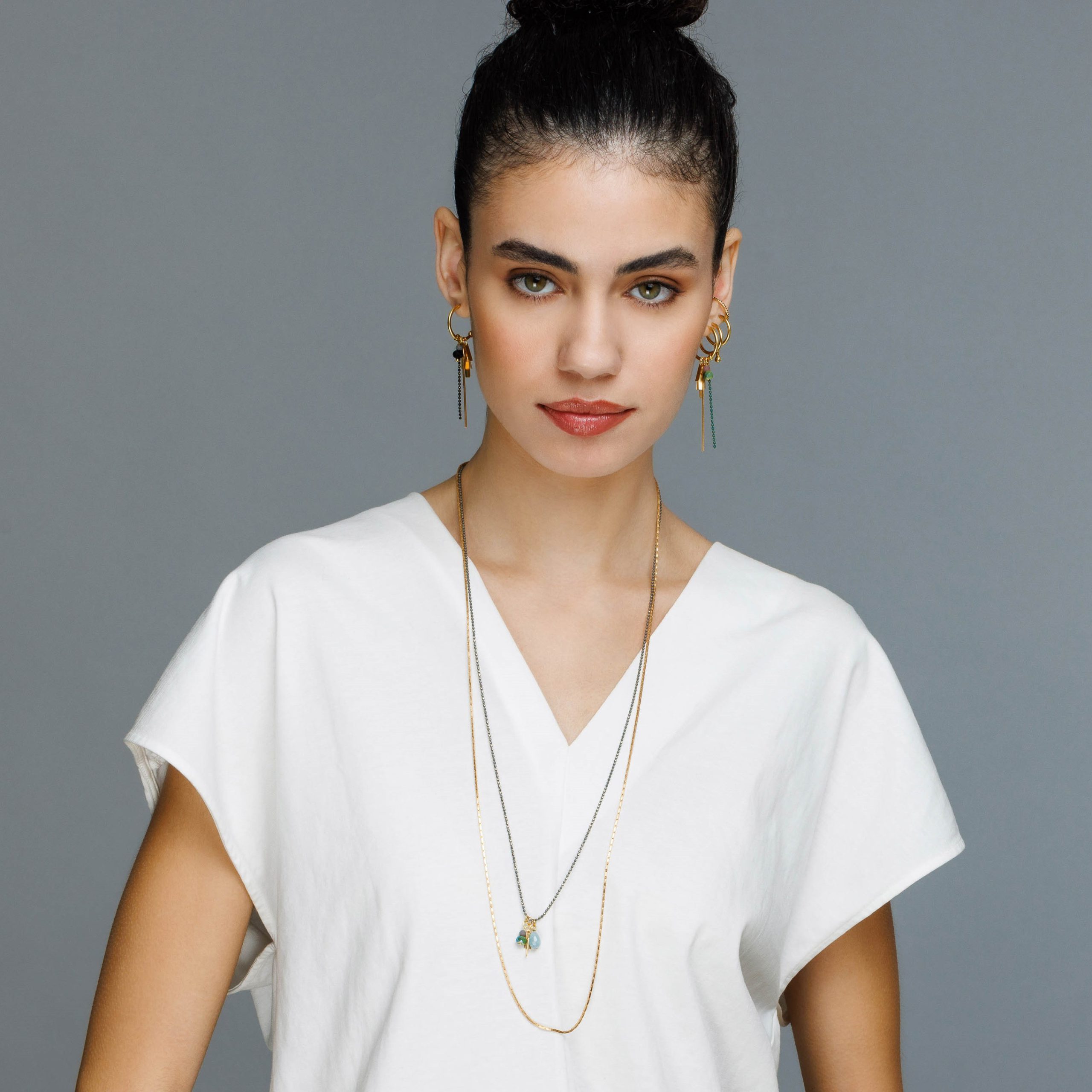 שכבה ראשונה שרשרת דיסקית עדינה בשחור או בירוק ( בהתאם לבחירה) אליה מחוברים תליונים בשילוב אבני חן.